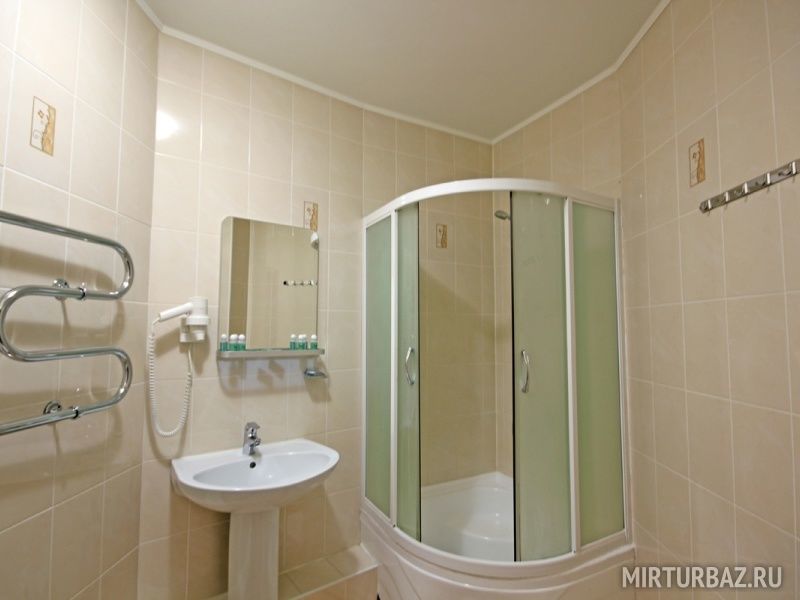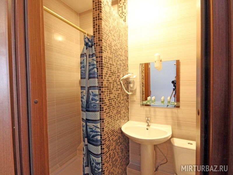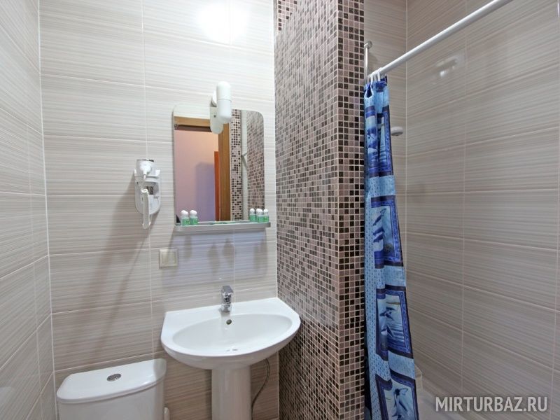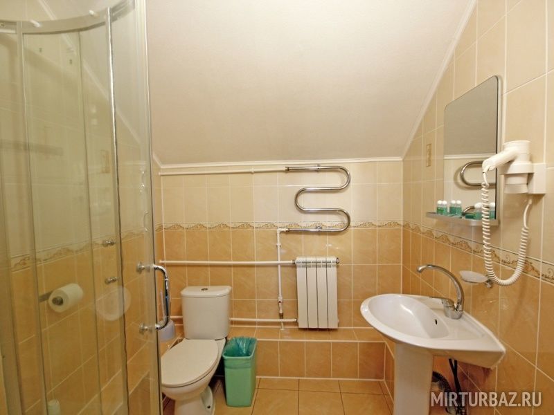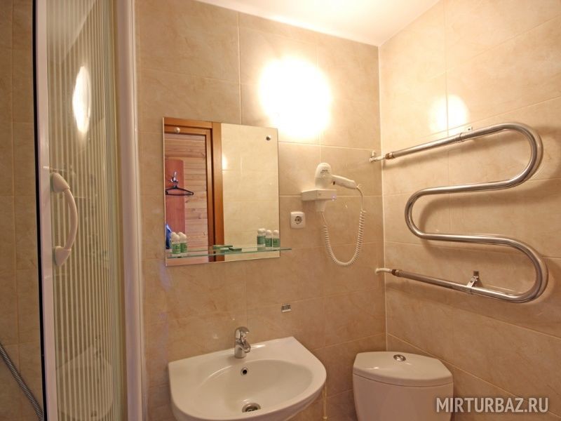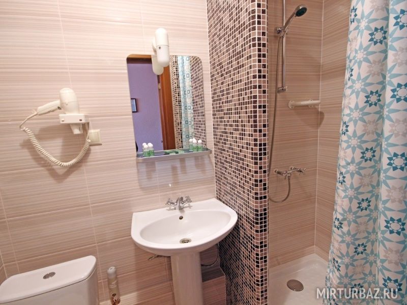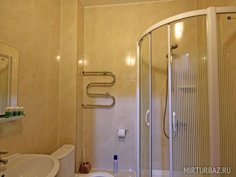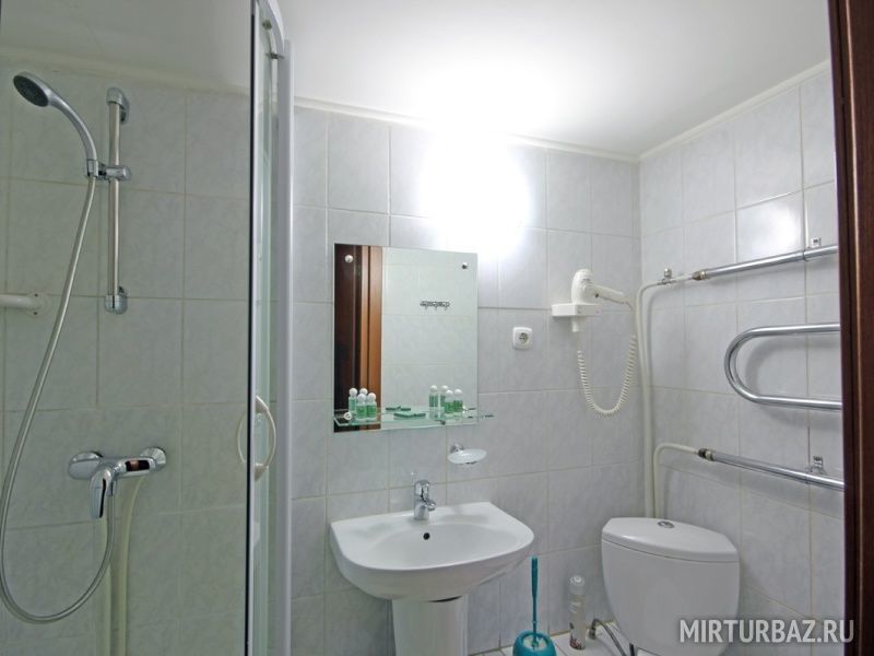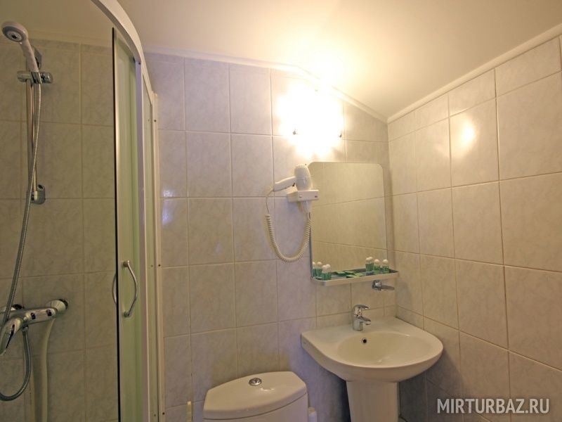 В номерах туалетная комната с душевой кабиной, феном, средствами гигиены.
