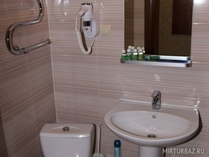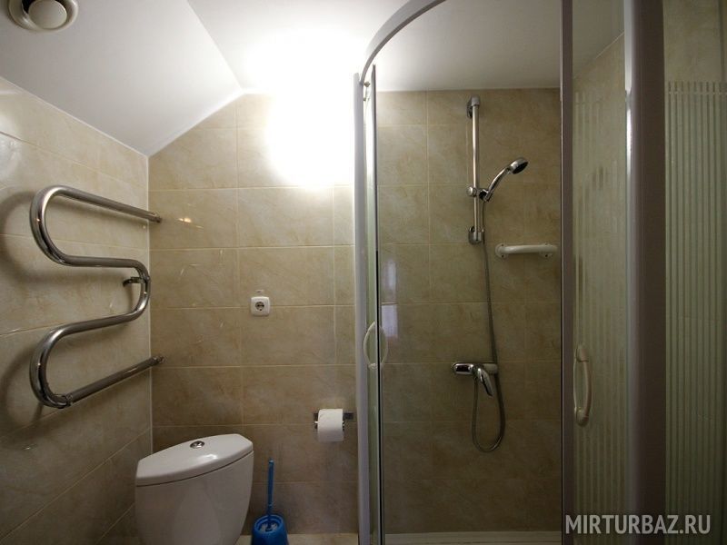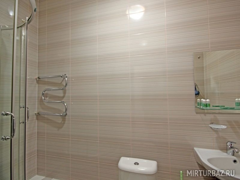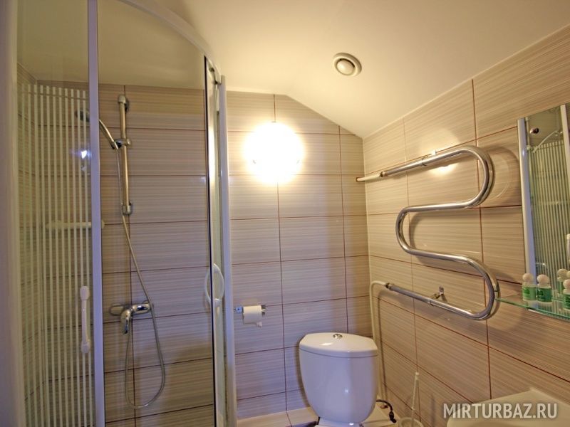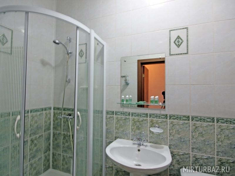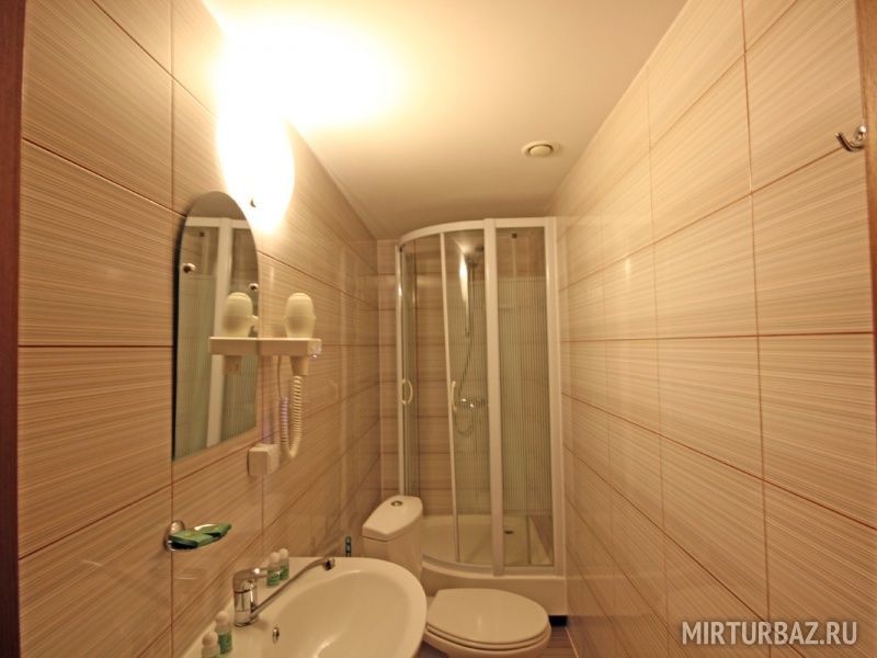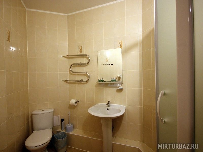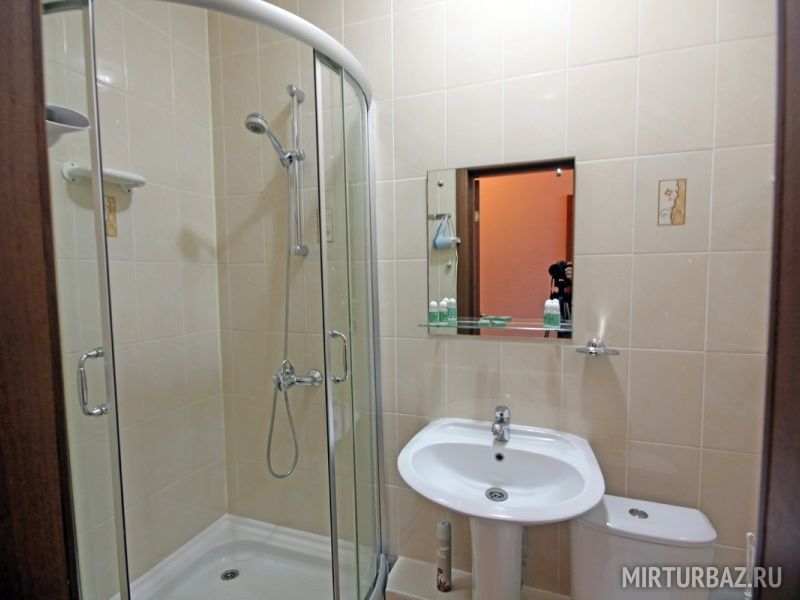 В номерах туалетная комната с душевой кабиной, феном, средствами гигиены.