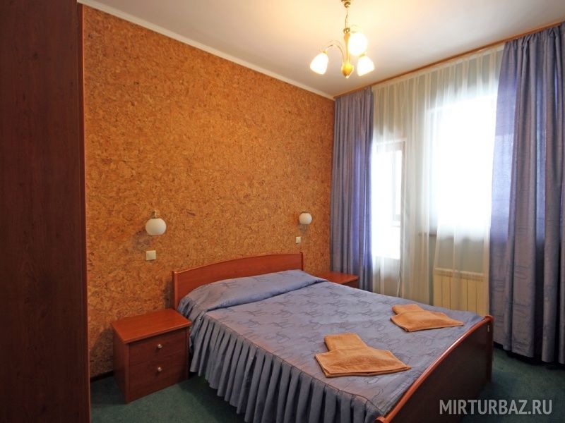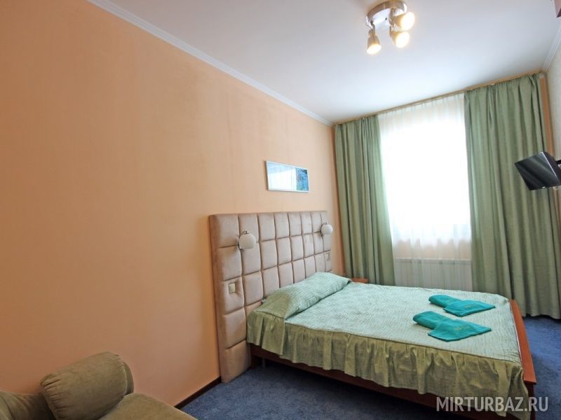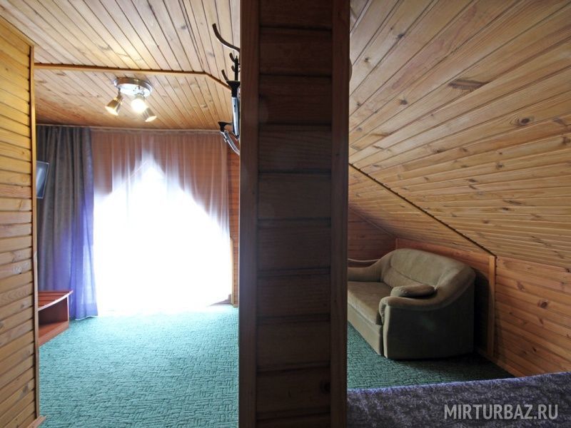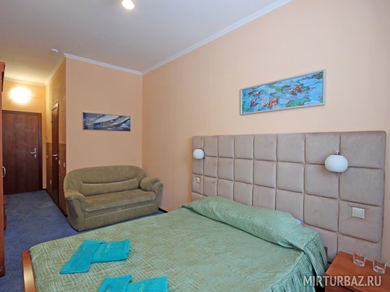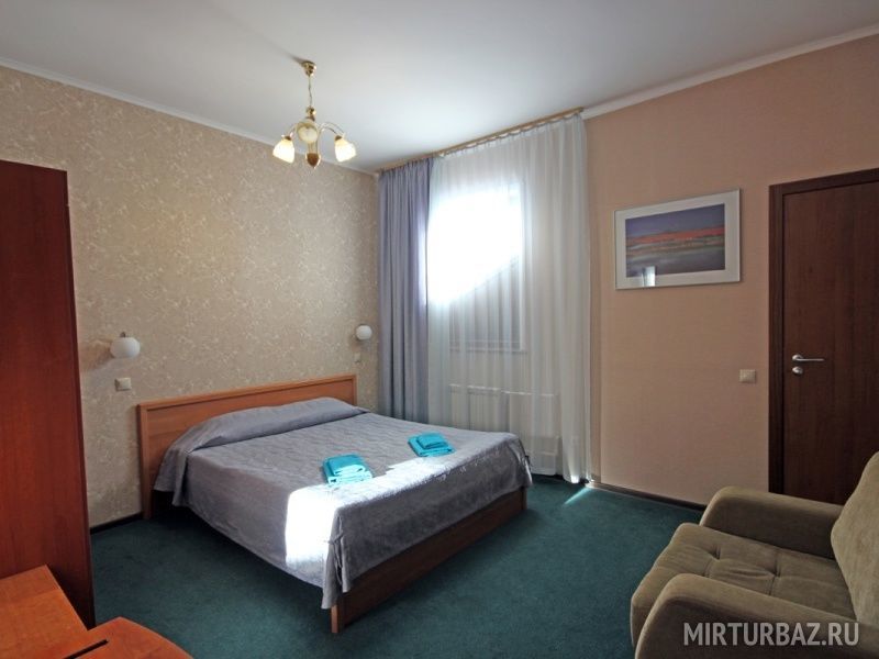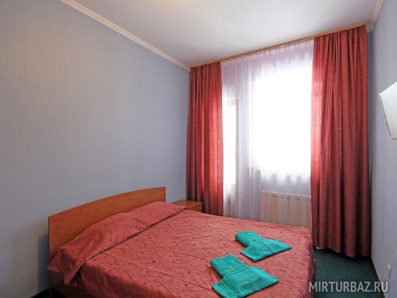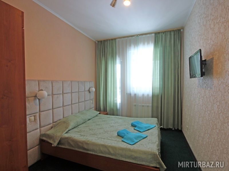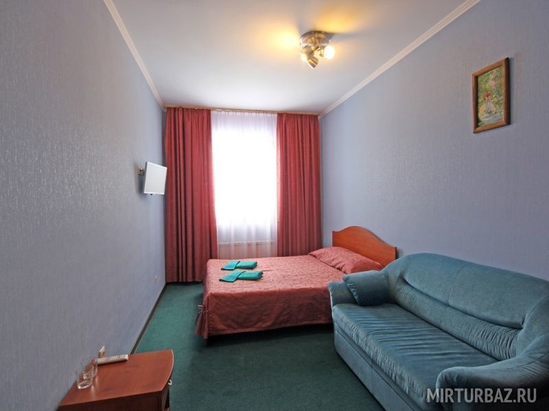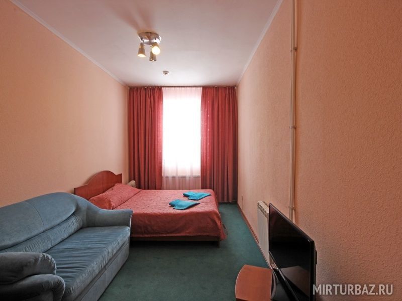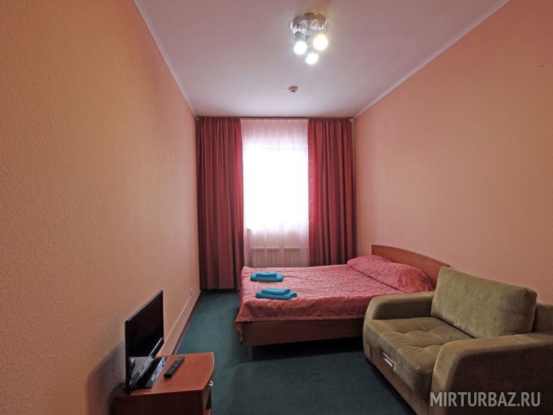 Общая площадь — 19,9 м² (окно на «Ольгу» и трассы), в номере двуспальная кровать и диван.