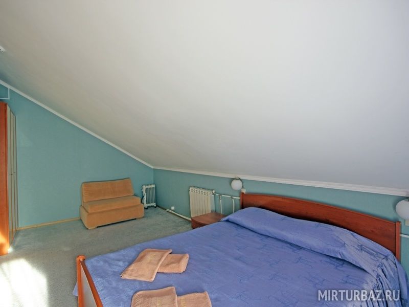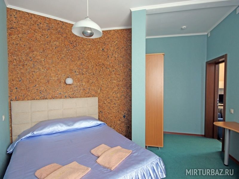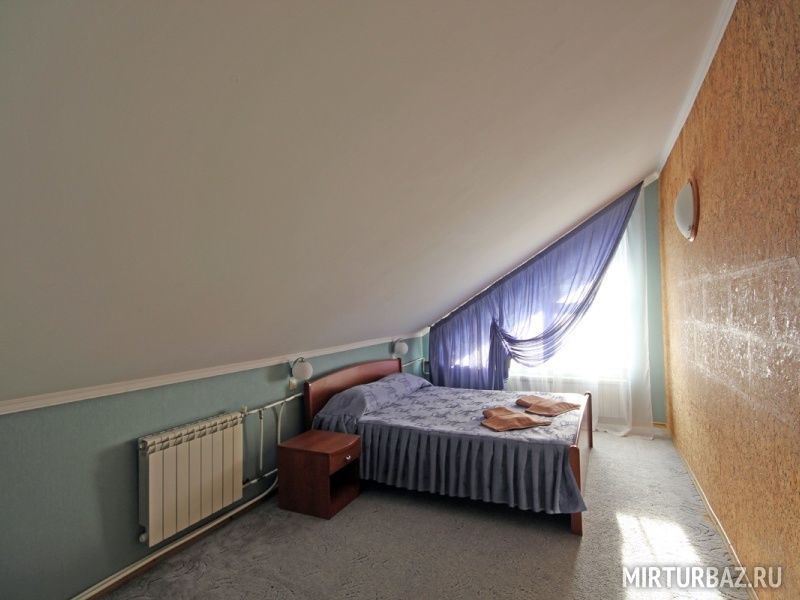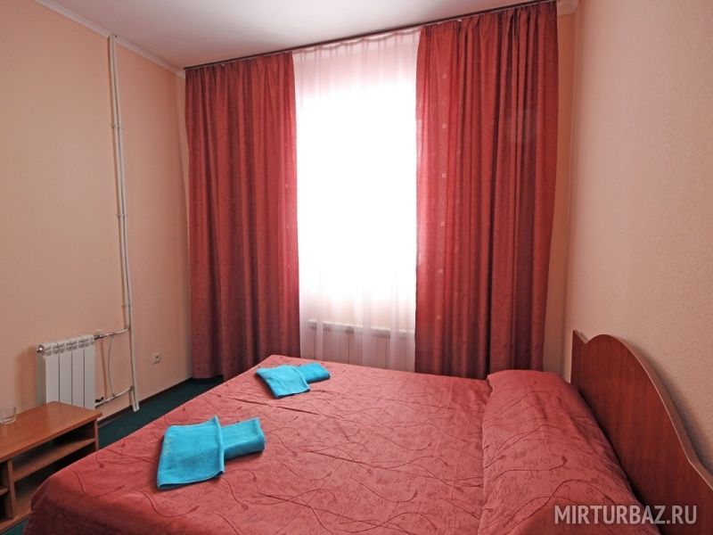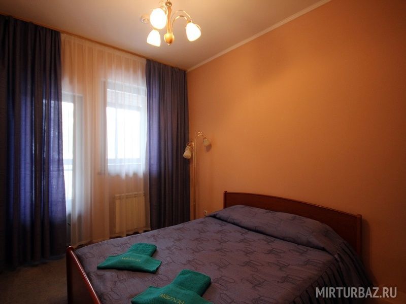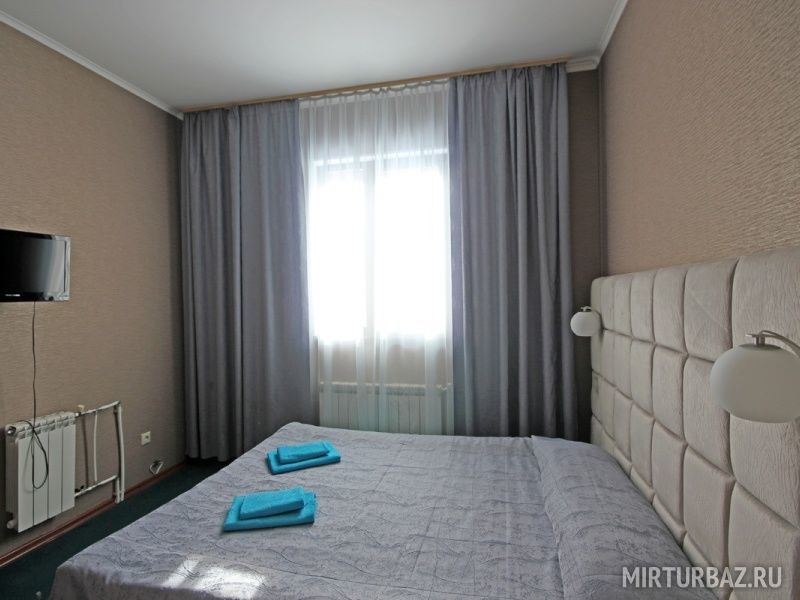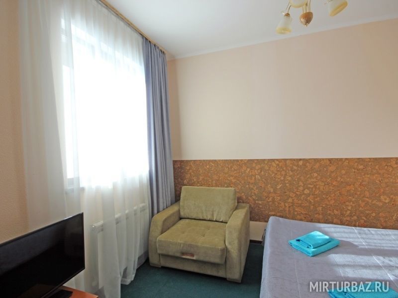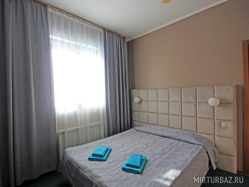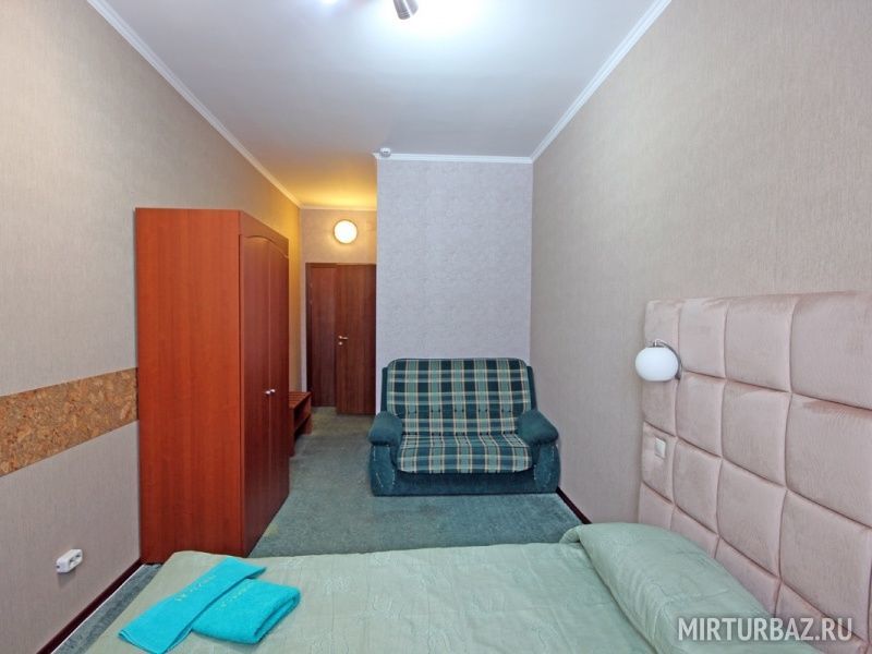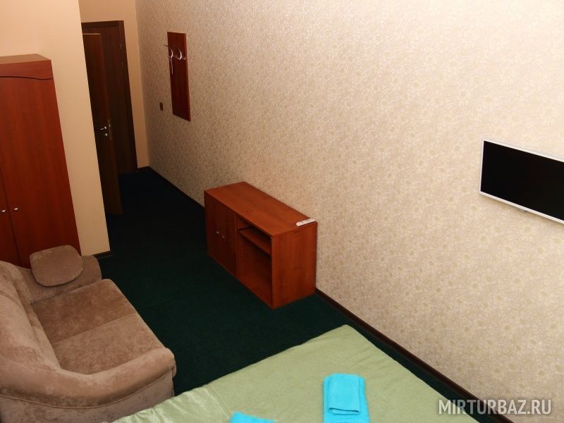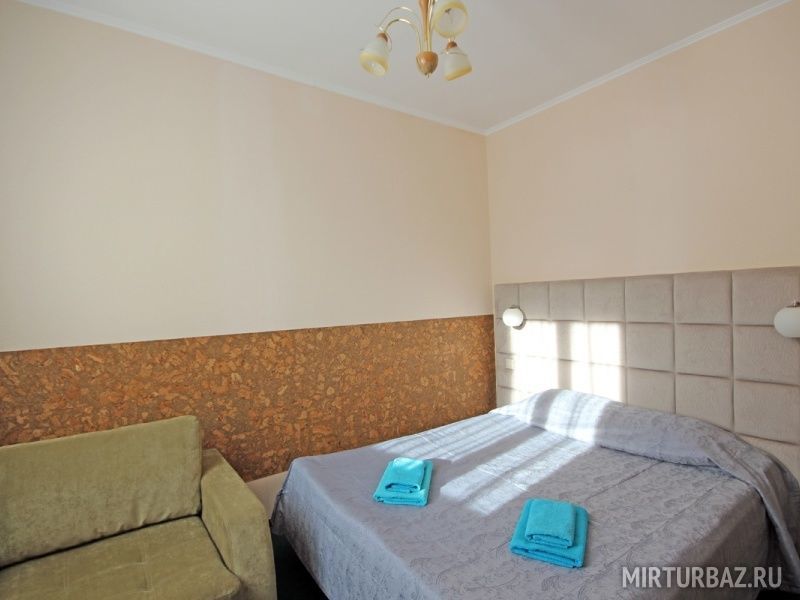 Общая площадь — 19,9 м² (окно на «Ольгу» и трассы), в номере двуспальная кровать и диван.