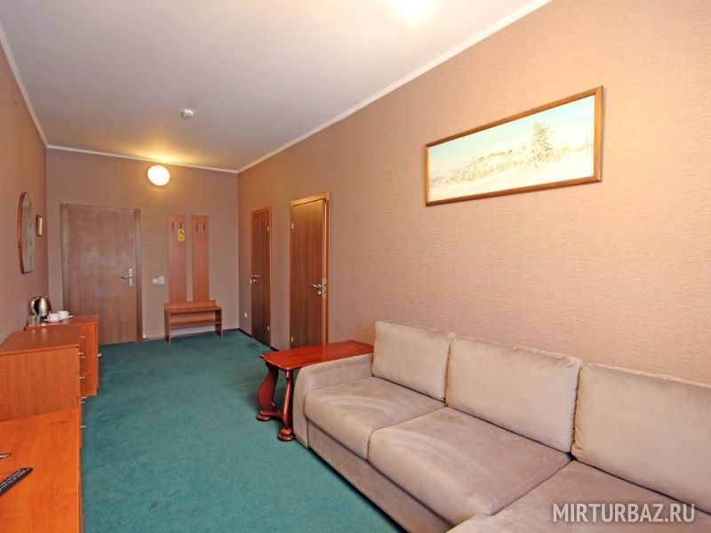 Общая площадь — 50,0 м² (окна на стоянку и «Лапландию»). В номере два основных места и четыре дополнительных на раскладном диване и двух креслах-кроватях. Актуальную стоимость проживания вы можете