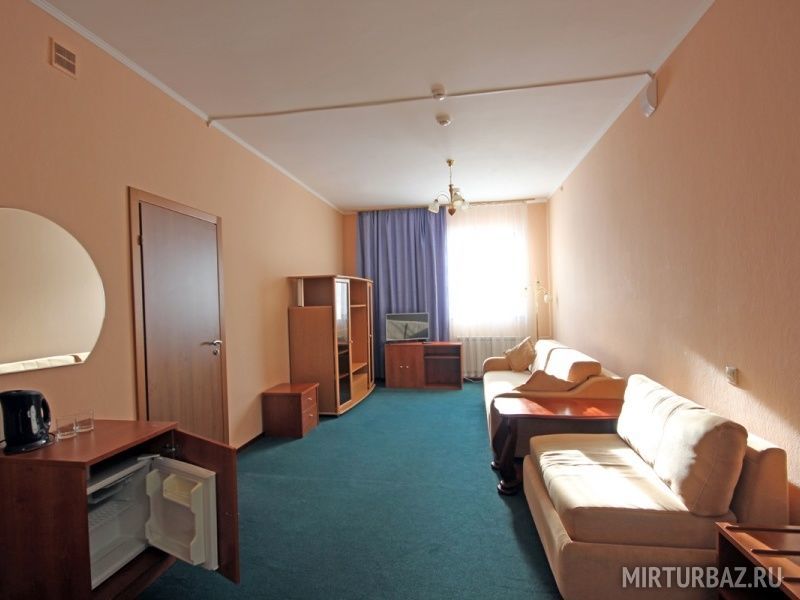 В спальне двуспальная кровать, тумбочка, шкаф для одежды, в гостиной угловой раскладной диван (в двух номерах дополнительно кресла-кровати), журнальный столик, телевизор, минихолодильник, внутренний телефон.