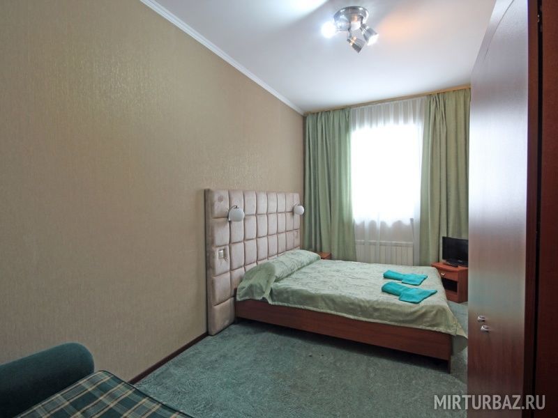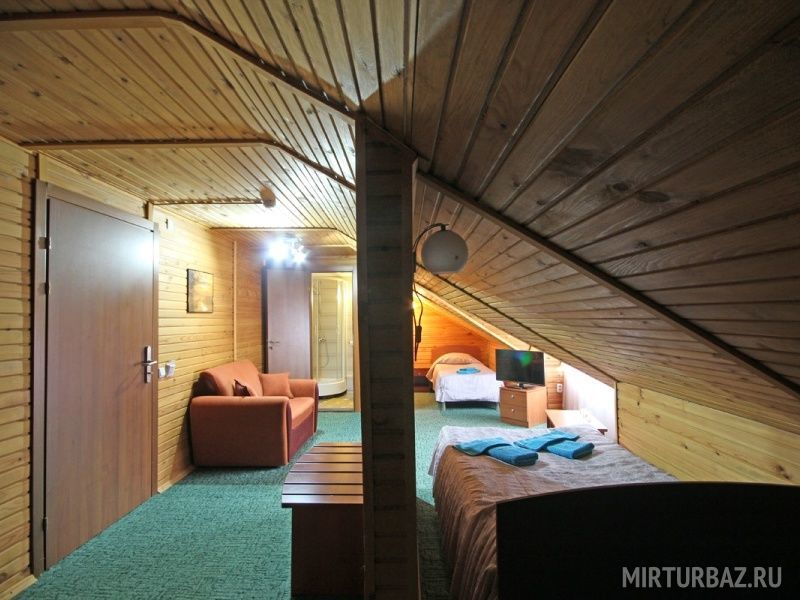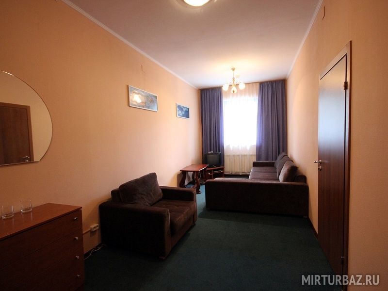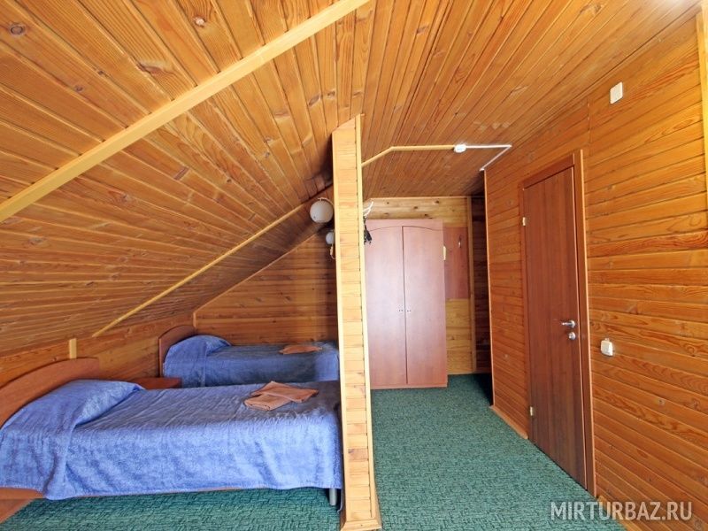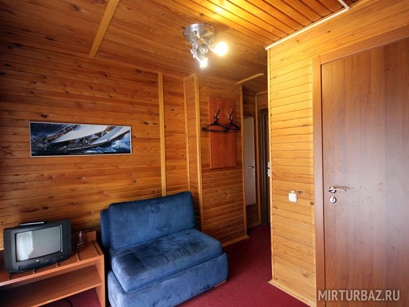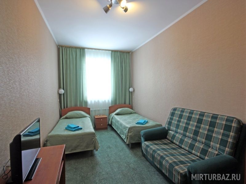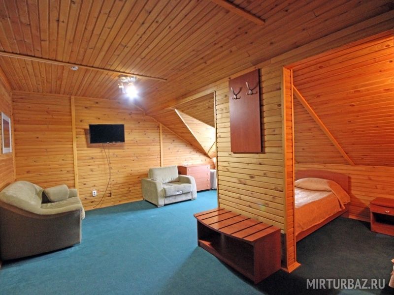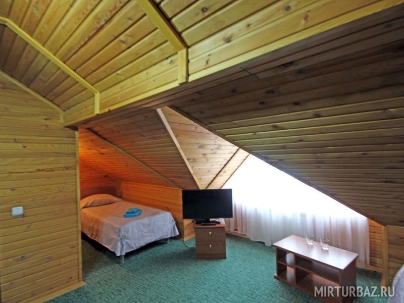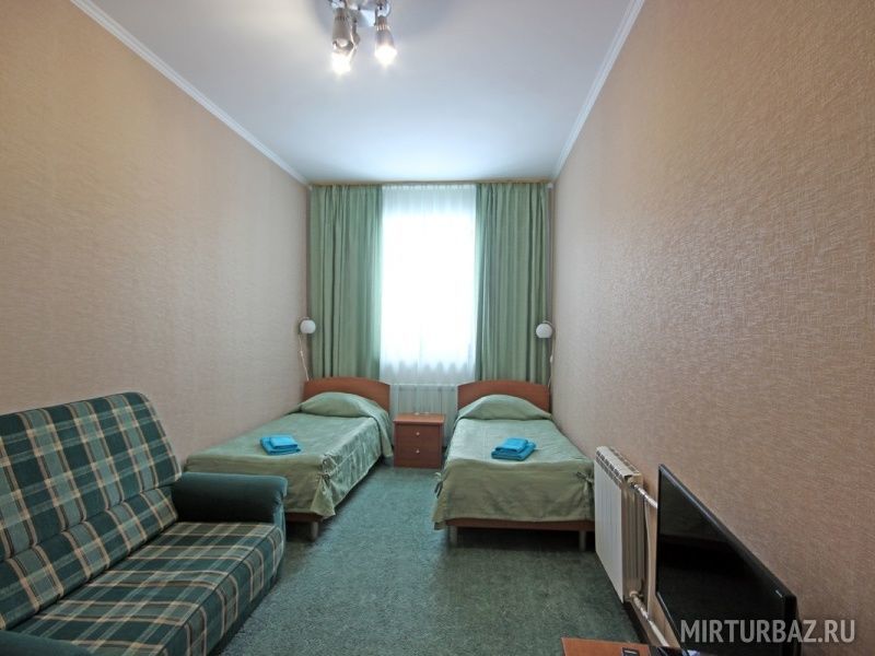 Общая площадь 24,2 м² (окно на дорогу, «Берлогу»). Две односпальные кровати, раскладной диван, тумбочка, шкаф, телевизор. Санузел.