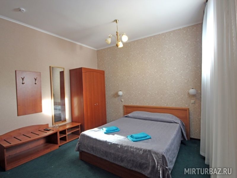 Однокомнатные номера категории Стандарт рассчитаны на размещение двух гостей. В номерах двуспальная кровать, тумбочка, шкаф для одежды, телевизор; туалетная комната с душевой кабиной и средствами гигиены.