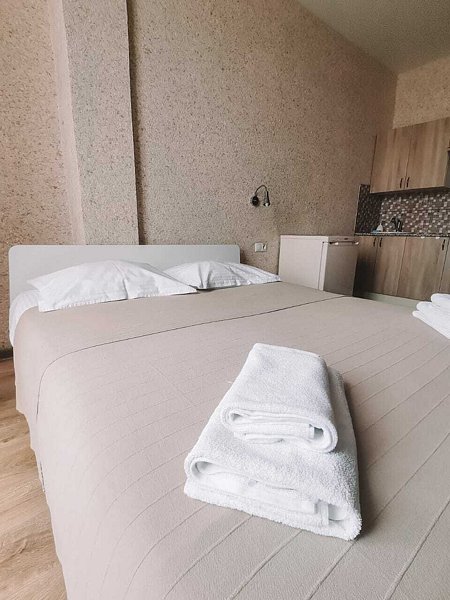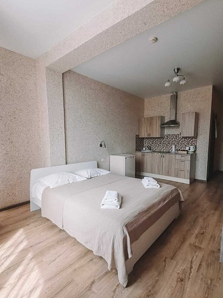 Однокомнатный номер площадью 25-30 квадратных метров, поделен на две функциональные зоны: спальная и кухонная.