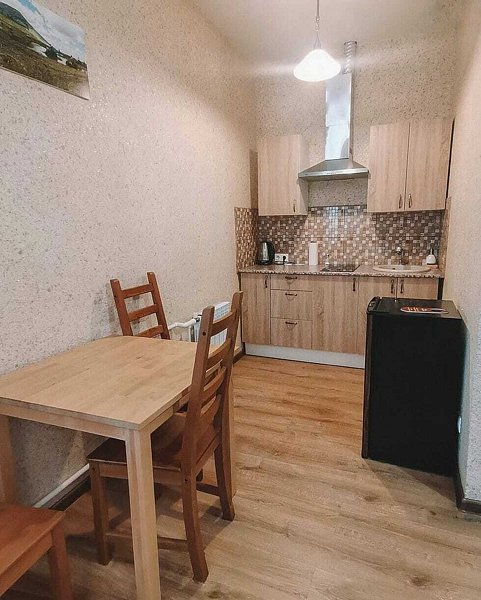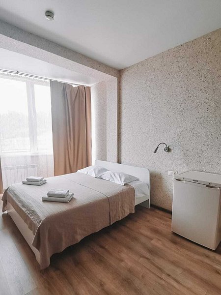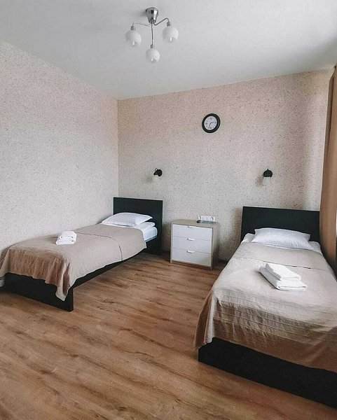В номере: две односпальные кровати с ортопедическим реечным дном и матрасом, телевизор, холодильник, обеденный стол, стулья, варочная панель, набор посуды, чайник.