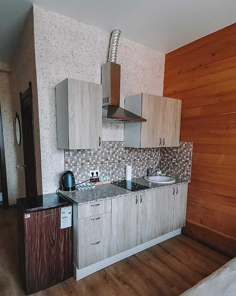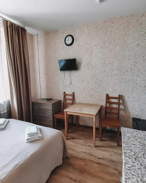 В номере: одна 2-спальная кровать с ортопедическим реечным дном и матрасом, телевизор, холодильник, обеденный стол, стулья, варочная панель, набор посуды, чайник.