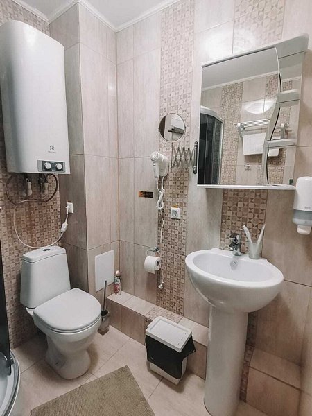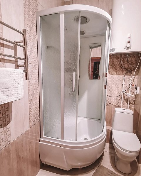 В санузле (в каждой комнате свой санузел): душевая кабина, раковина, косметика, тапочки.