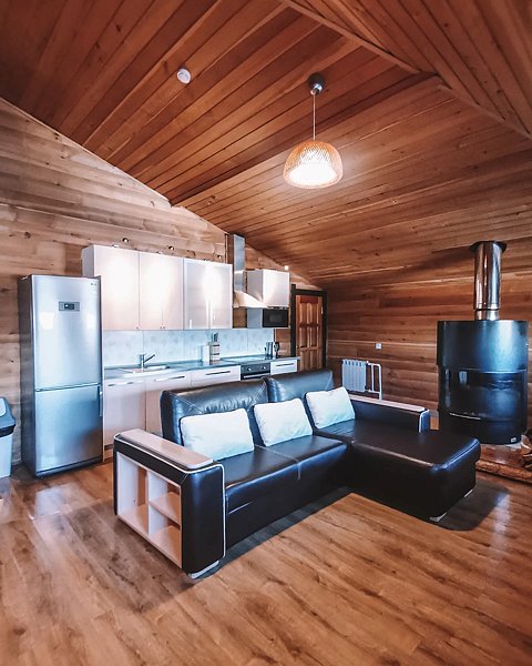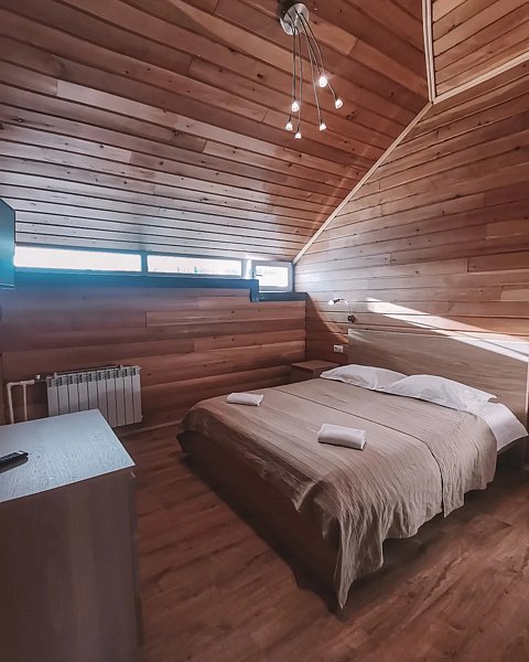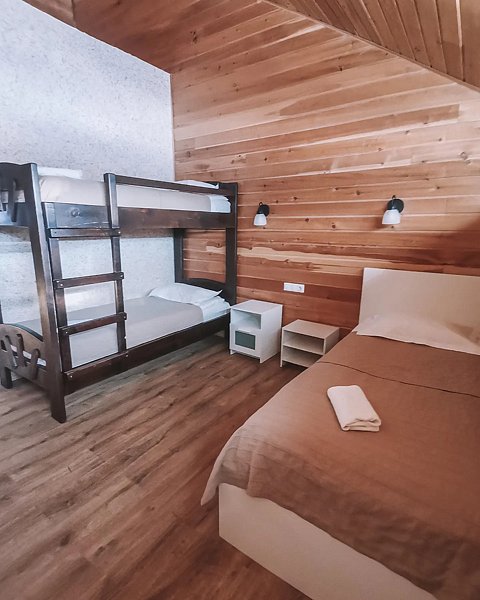 Отдельный этаж с тремя комнатами (две комнаты с двуспальными кроватями, каждая площадью 15, одна комната с односпальной и двухъярусной кроватями) и большим холлом, сдается, как один номер, для больших компаний и так же оснащен всем необходимым для комфортного проживания.