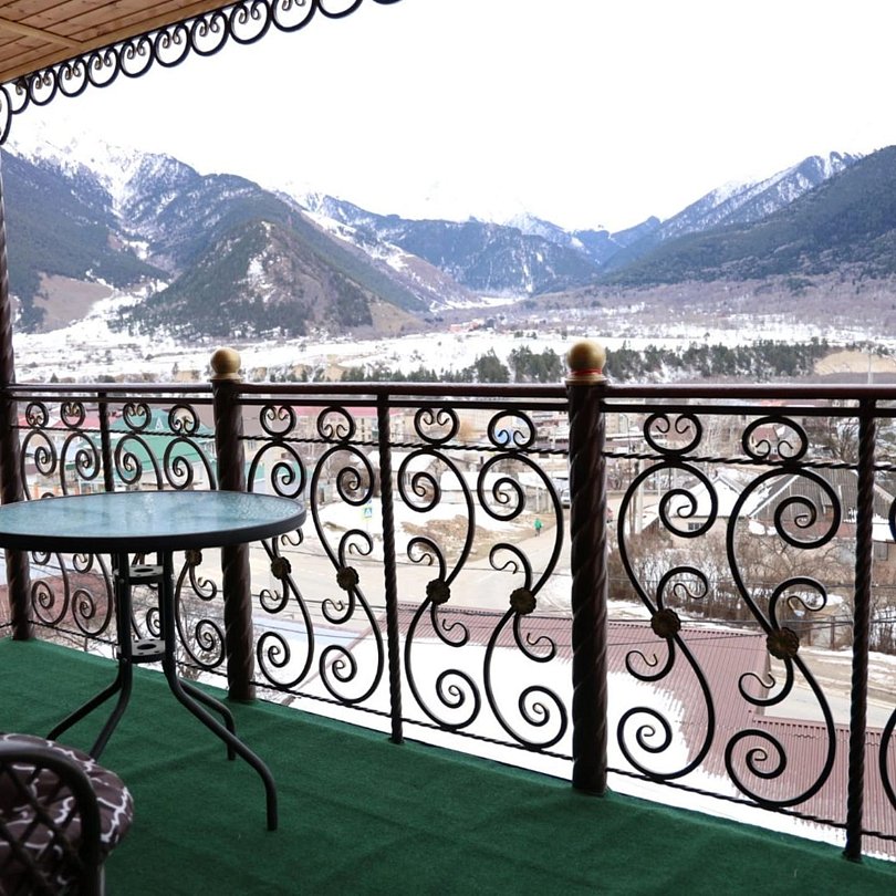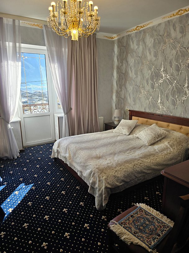 Люкс однокомнатный площадью 35 м² с балконом и видом на горы подходит для размещения трех человек (двух основных места и одного дополнительное). Имеет спальню с приятным интерьером, витражными окнами и меблированным столом и стульями балконом.