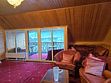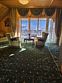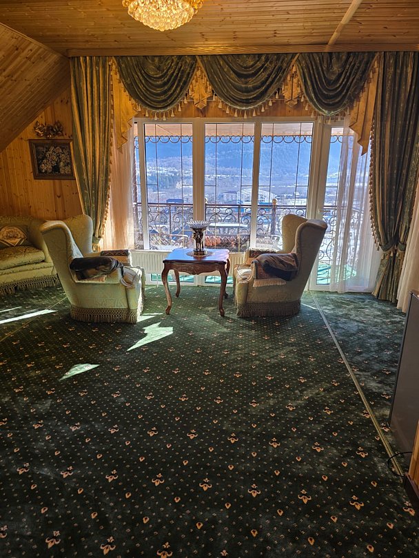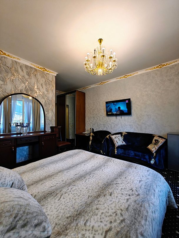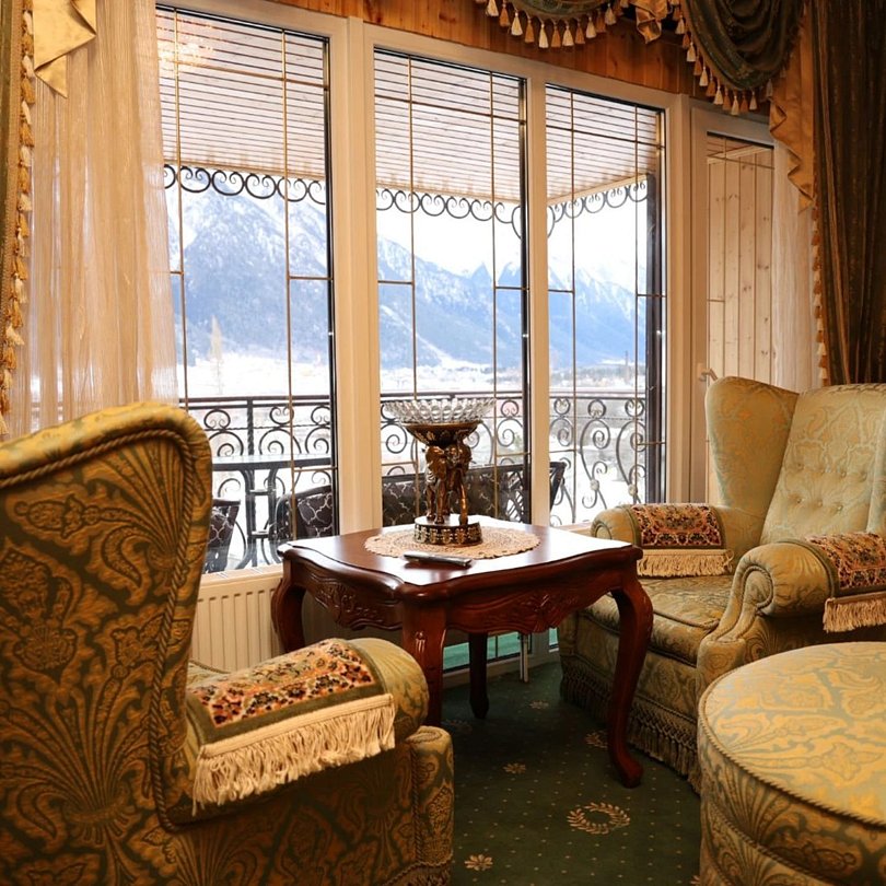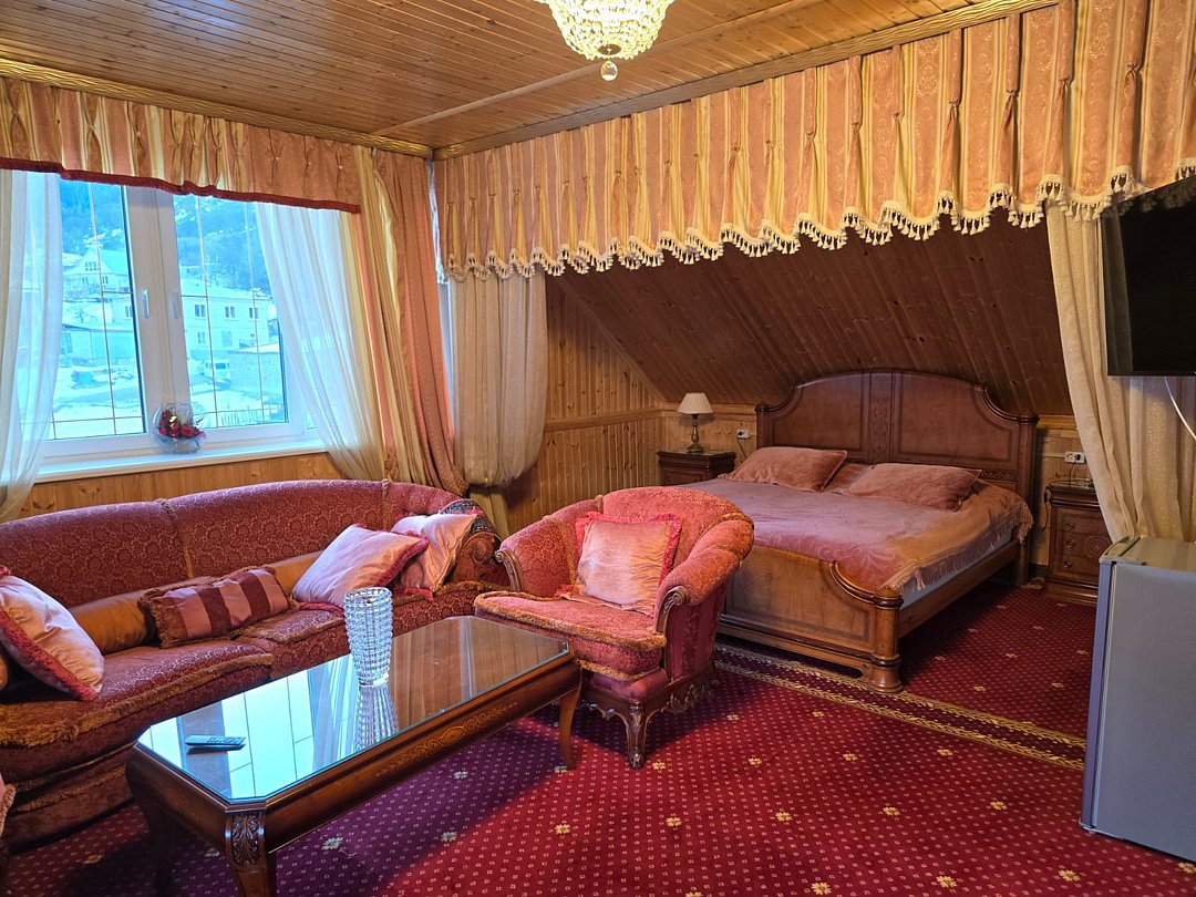 Люкс двухкомнатный площадью 43 м² с балконом и видом на горы подходит для размещения четырех человек (двух основных мест и двух дополнительных). Имеет спальню с приятным интерьером, витражными окнами и балконом.