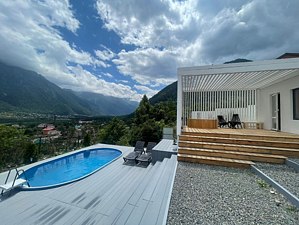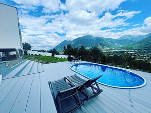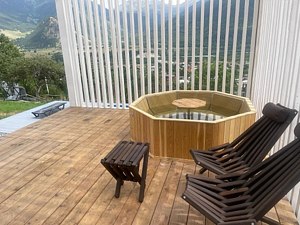 На закрытой территории вас ждут подогреваемый бассейн, баня с панорамным видом на горы, джакузи с подсветкой, детская площадка, беседка с мангалом и казаном, волейбольная площадка, песочница, качели и терраса у горного ручья. Для вашего удобства предусмотрена парковка.