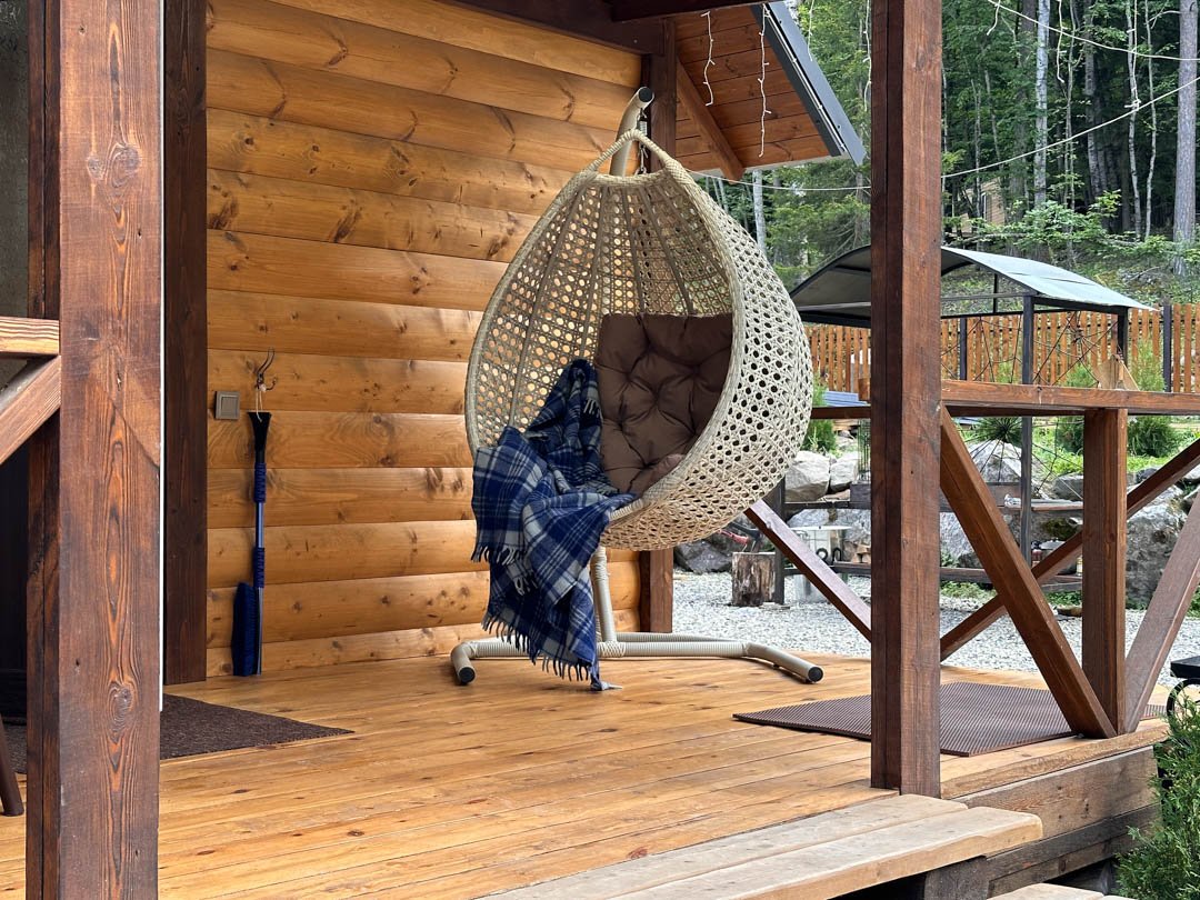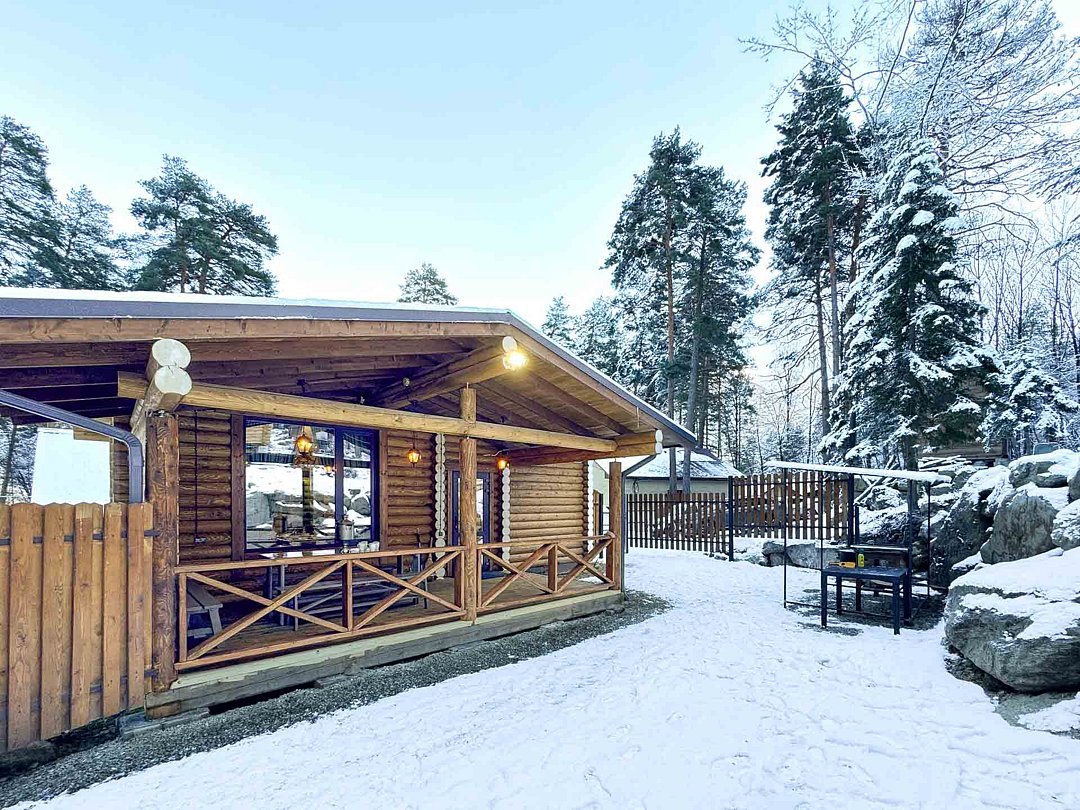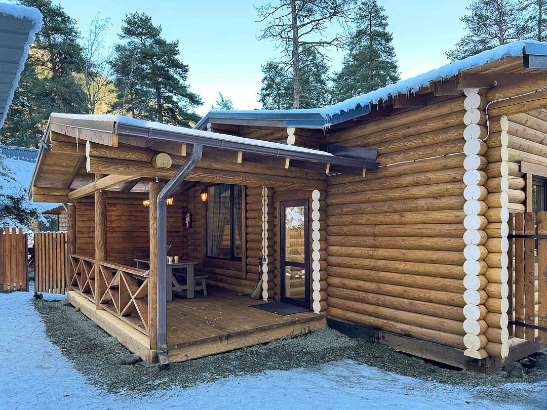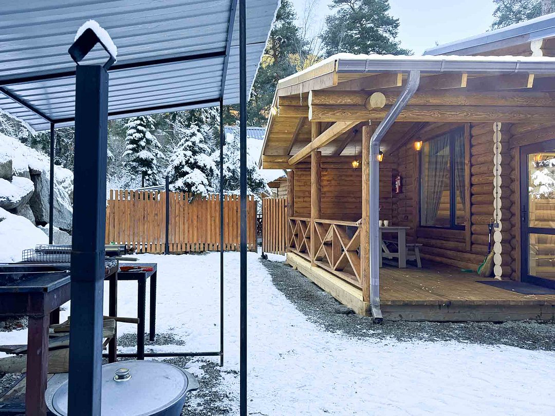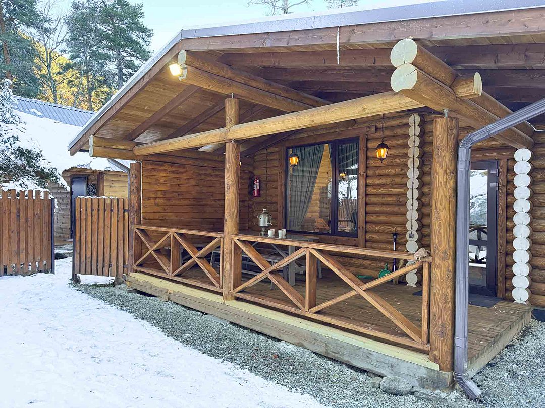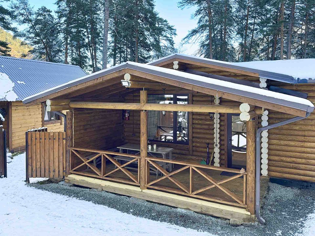 Деревянные коттеджи оборудованы террасами с мебелью и мангальной зоной. Внутри есть всё необходимое: бытовая техника, посуда, удобная мебель, постельное бельё, санузел, душ и полотенца. Администрация базы тщательно следит за чистотой как в домиках, так и на территории.