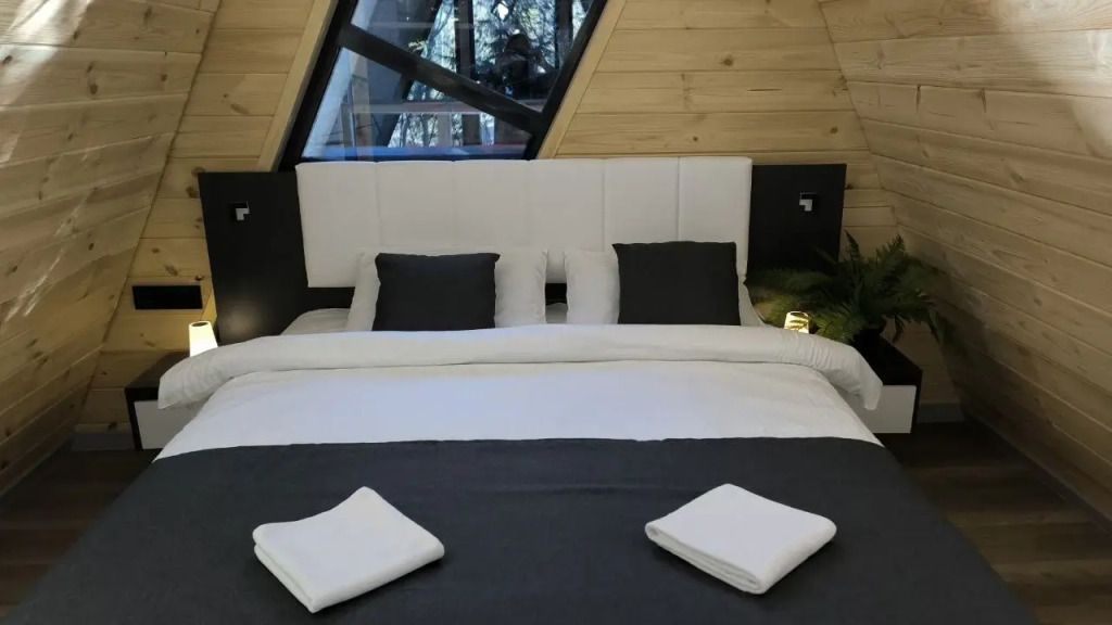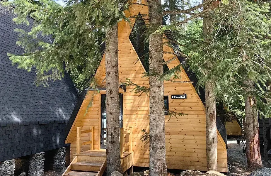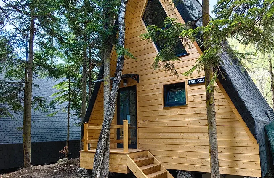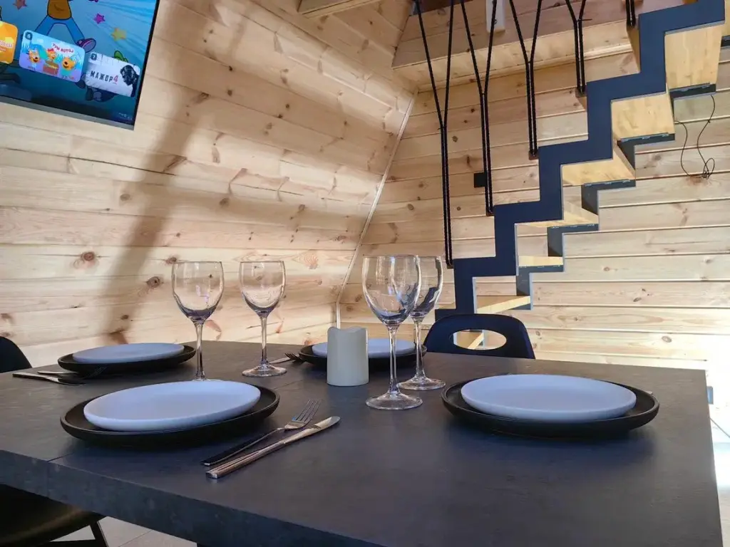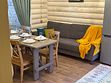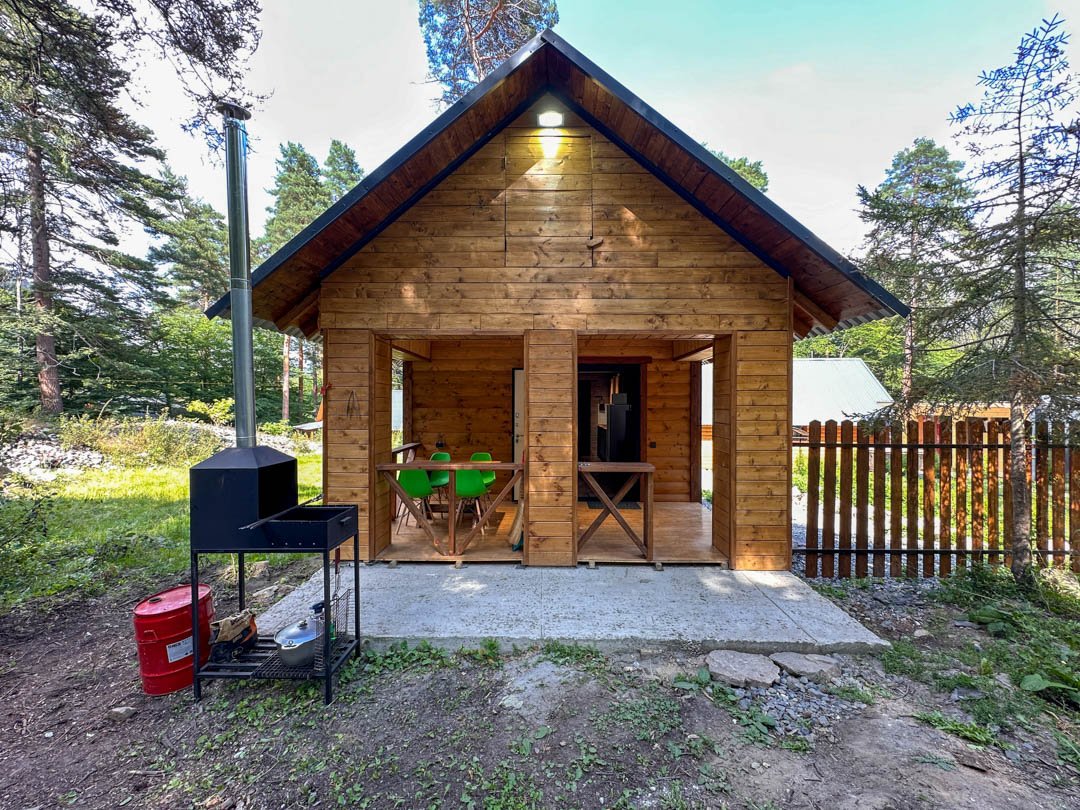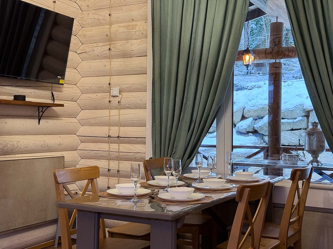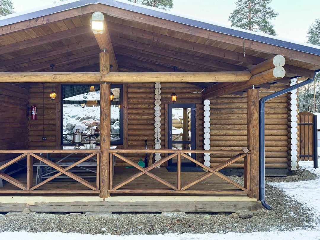 Деревянные коттеджи оборудованы террасами с мебелью и мангальной зоной. Внутри есть всё необходимое: бытовая техника, посуда, удобная мебель, постельное бельё, санузел, душ и полотенца. Администрация базы тщательно следит за чистотой как в домиках, так и на территории.