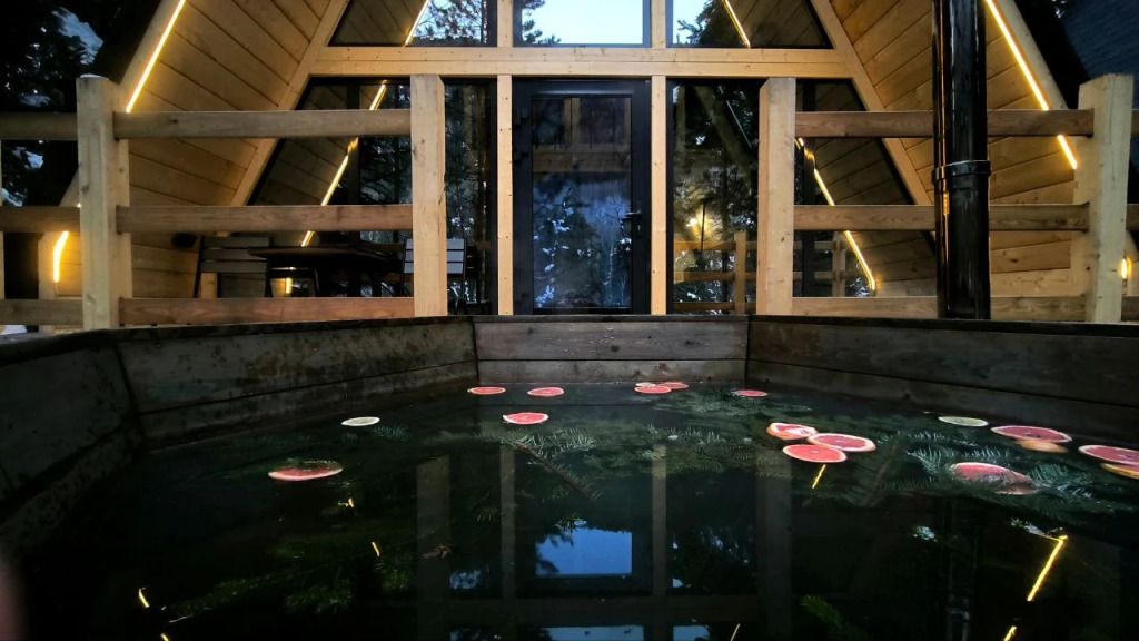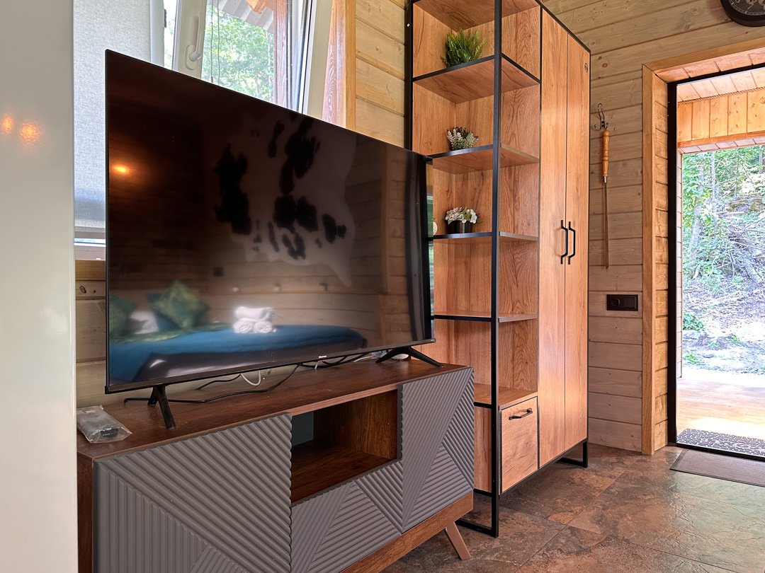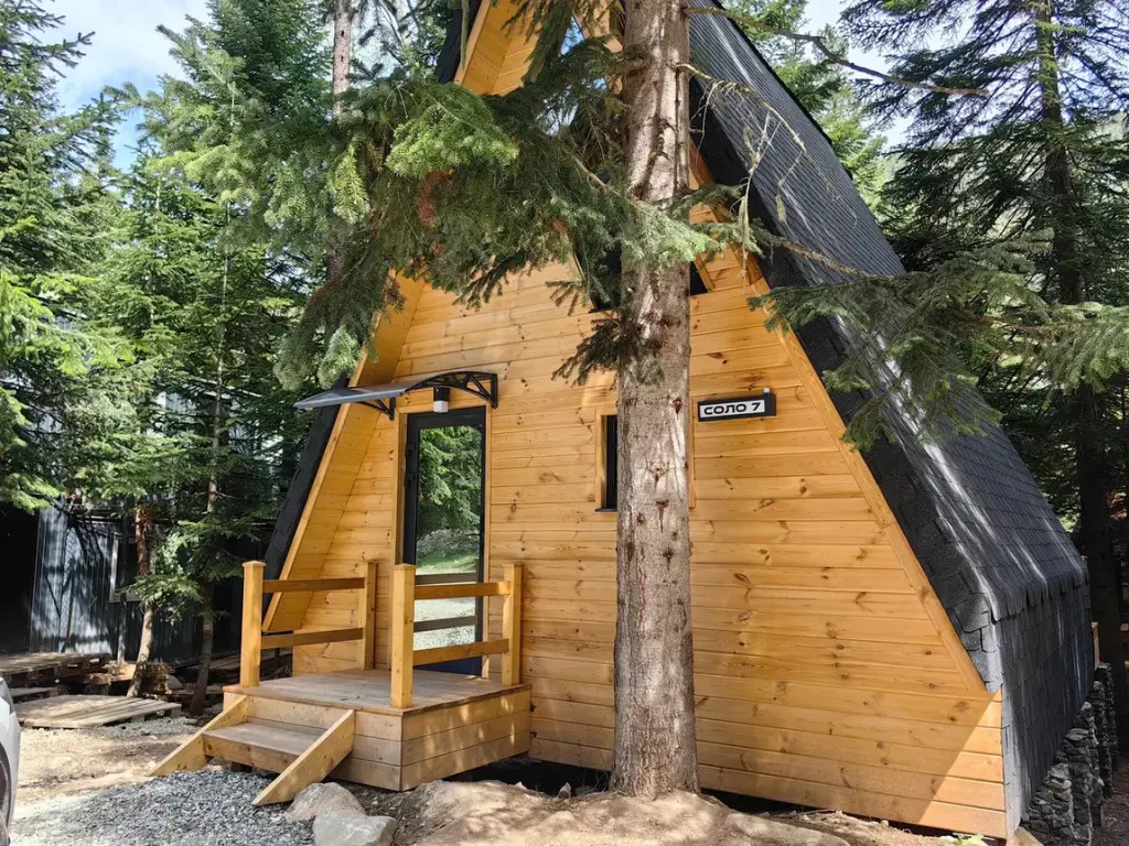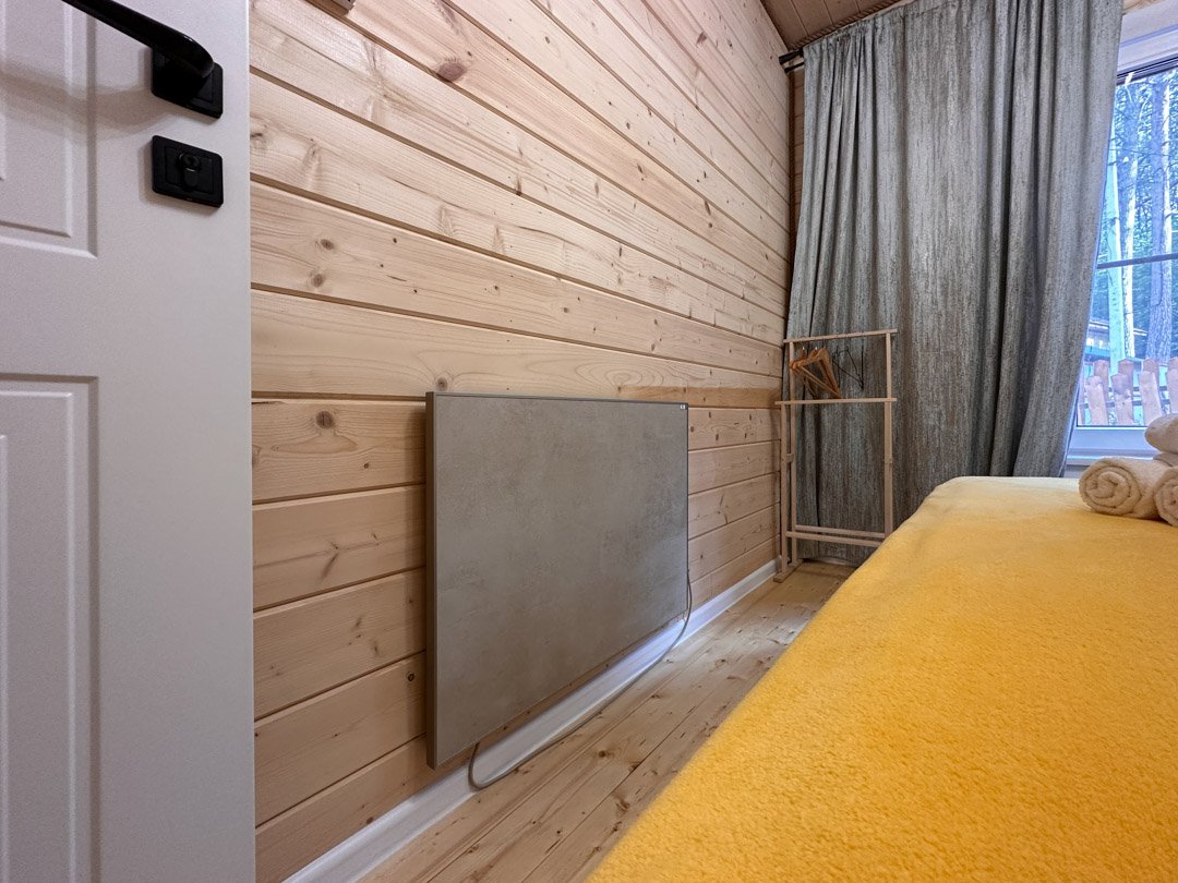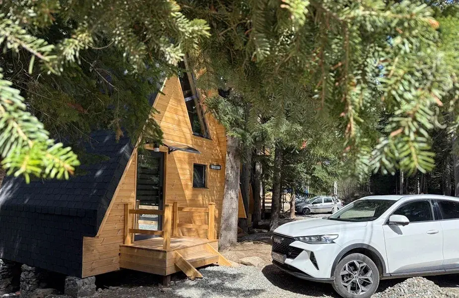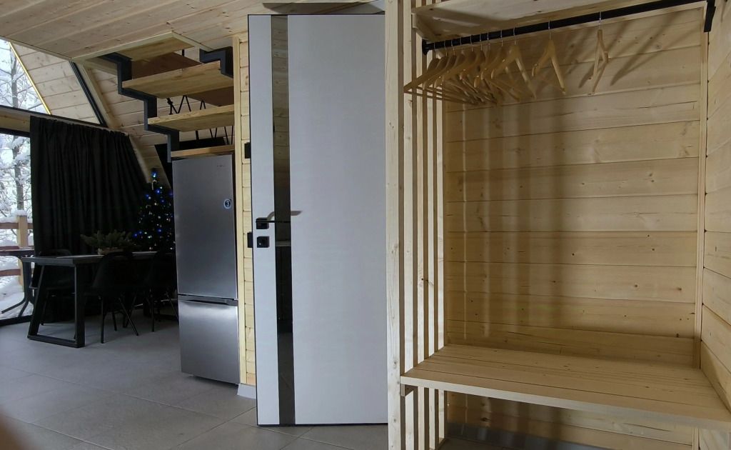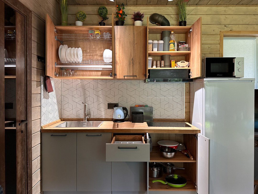 Деревянные коттеджи оборудованы террасами с мебелью и мангальной зоной. Внутри есть всё необходимое: бытовая техника, посуда, удобная мебель, постельное бельё, санузел, душ и полотенца. Администрация базы тщательно следит за чистотой как в домиках, так и на территории.