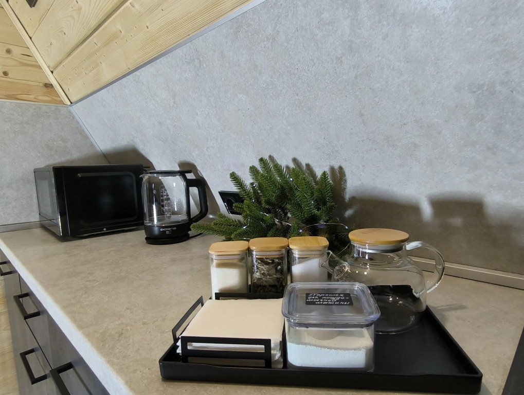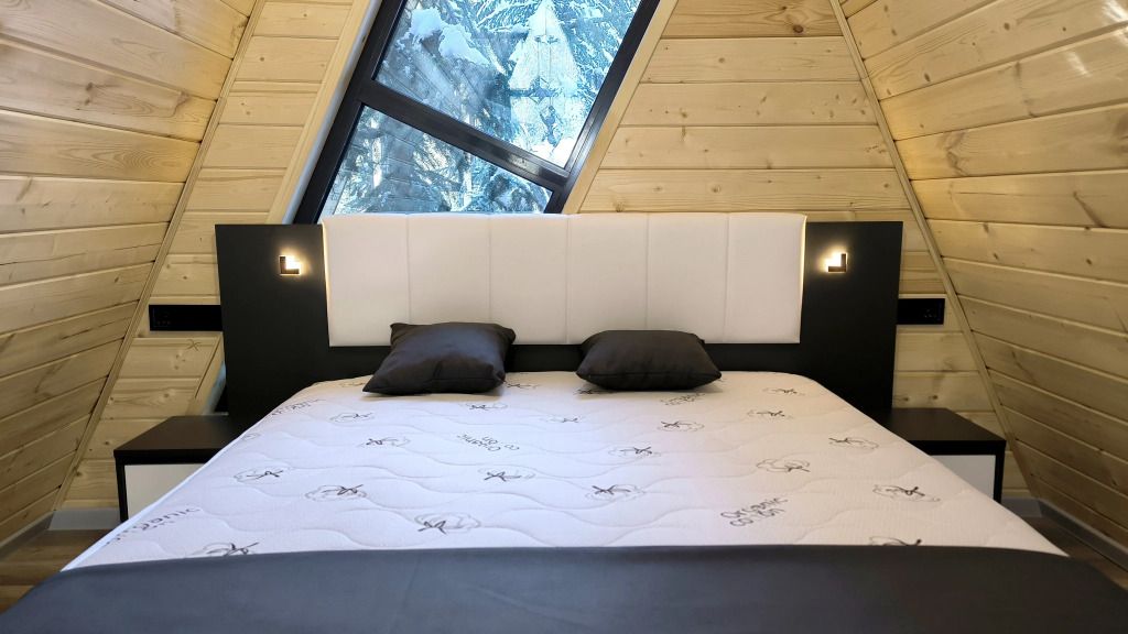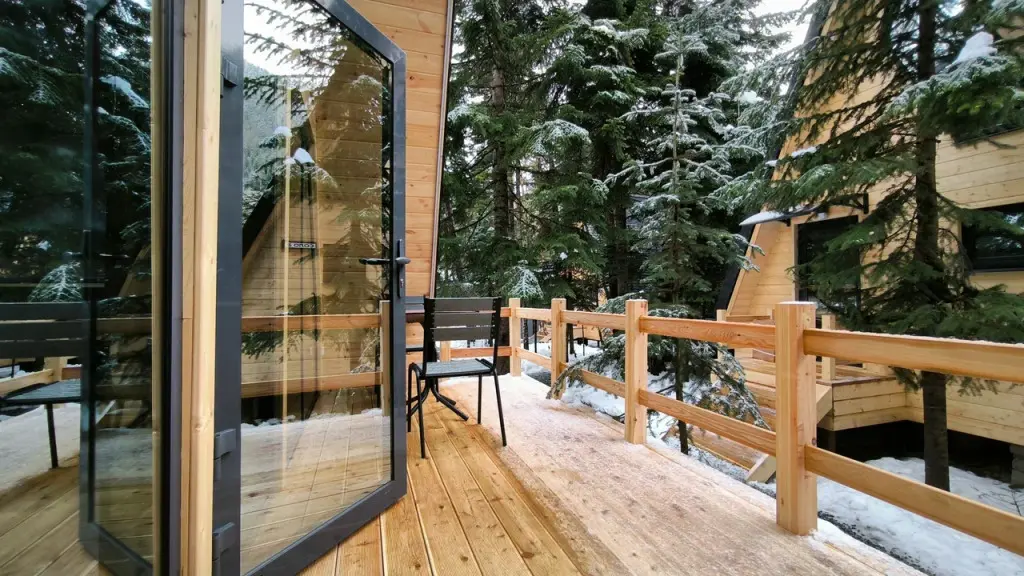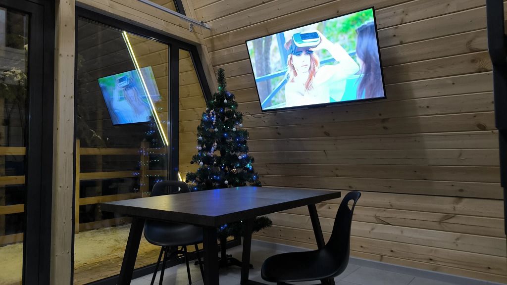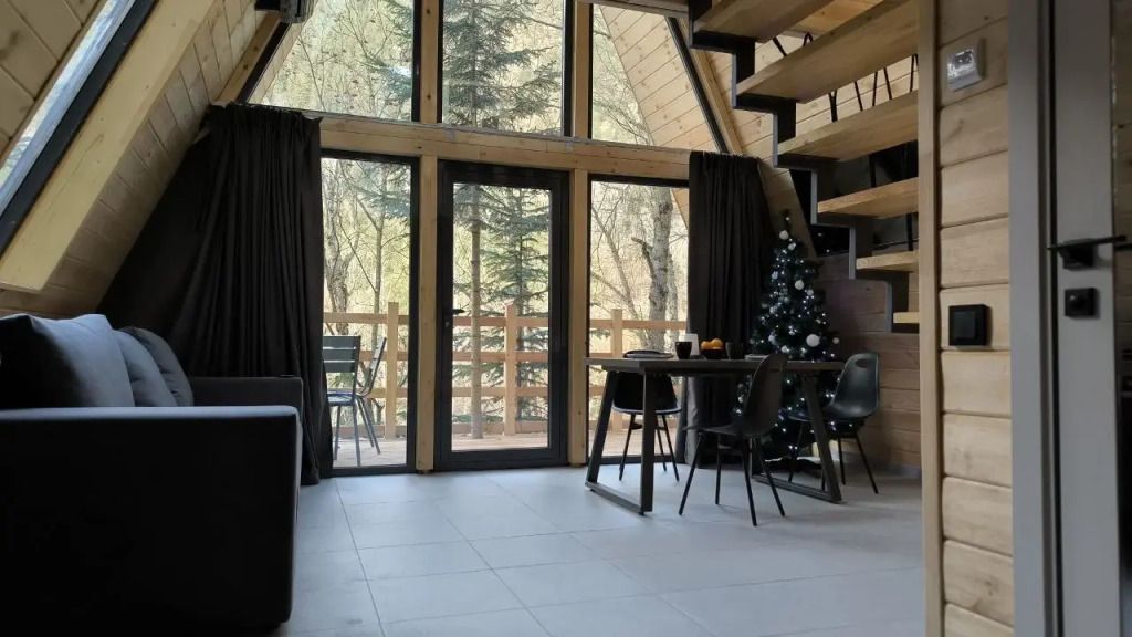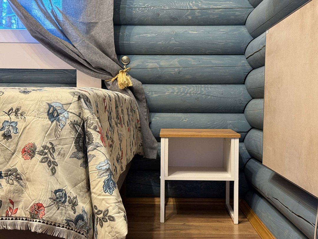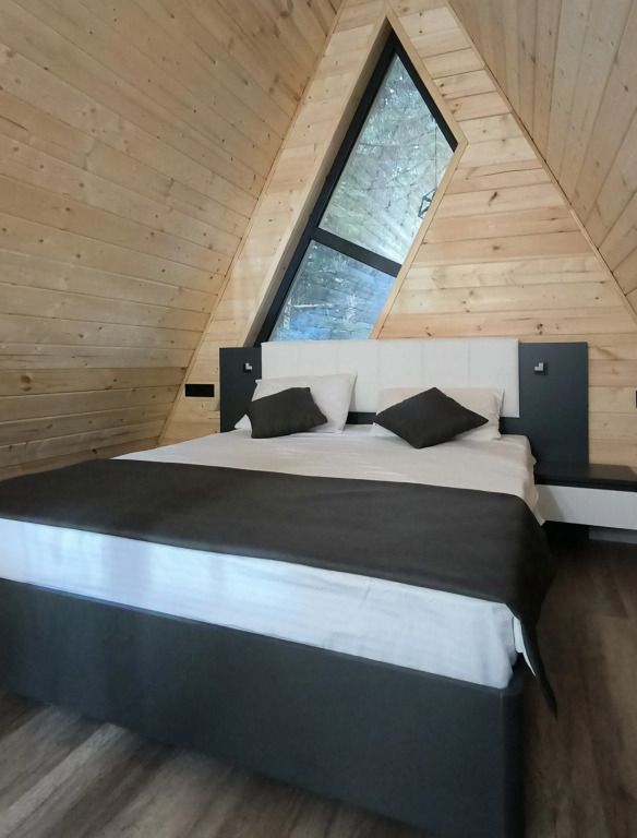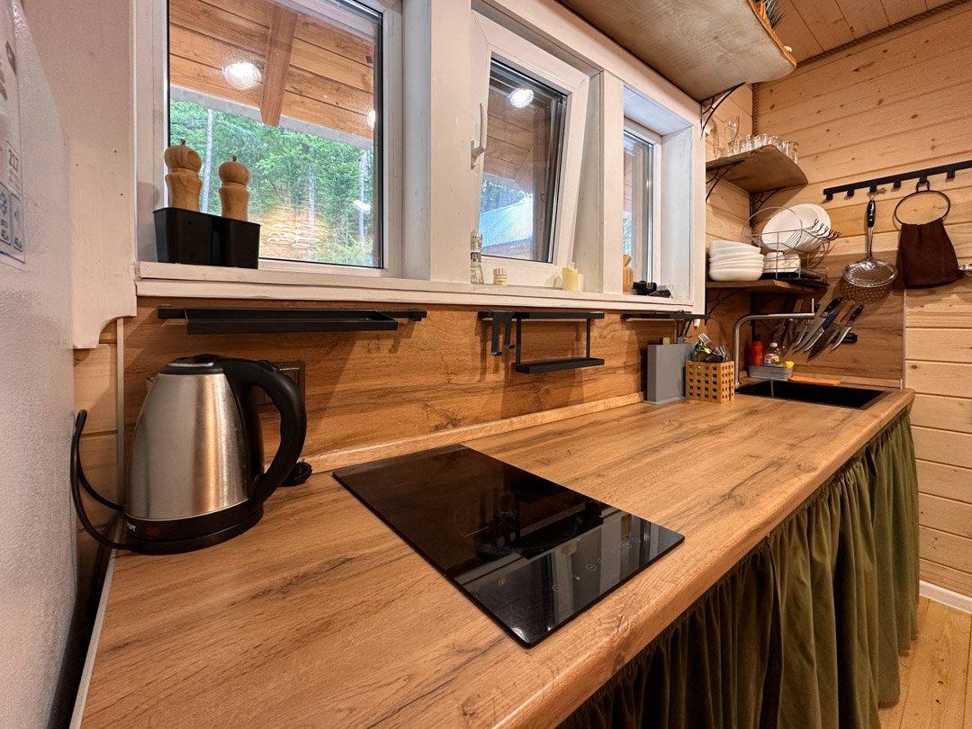 Деревянные коттеджи оборудованы террасами с мебелью и мангальной зоной. Внутри есть всё необходимое: бытовая техника, посуда, удобная мебель, постельное бельё, санузел, душ и полотенца. Администрация базы тщательно следит за чистотой как в домиках, так и на территории.