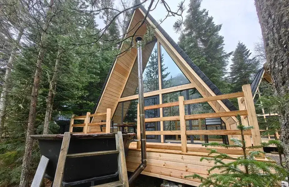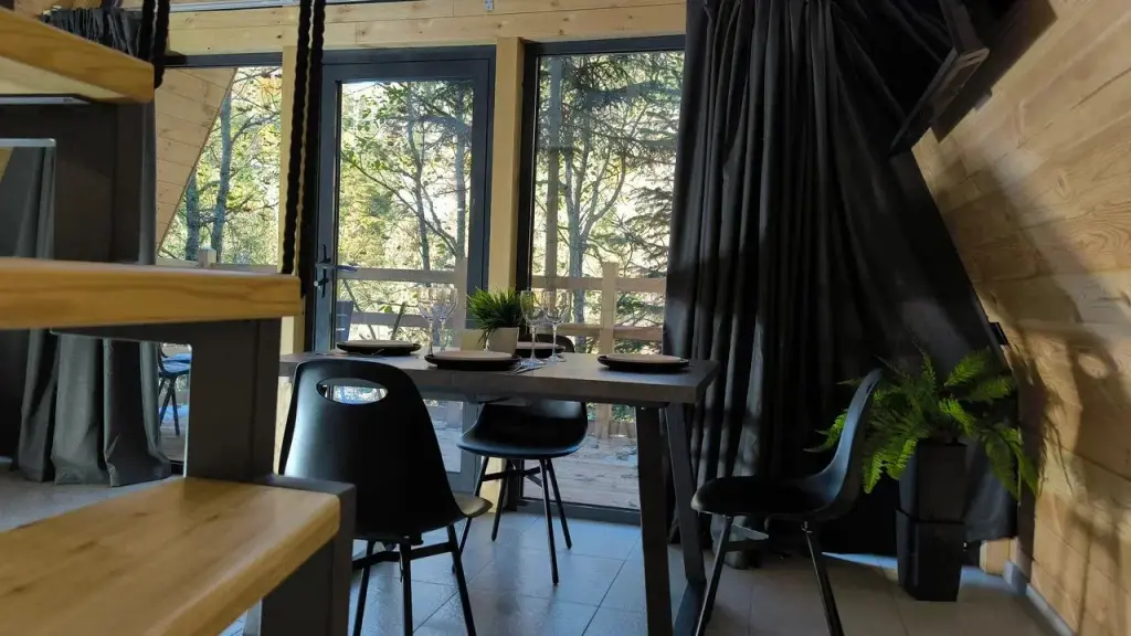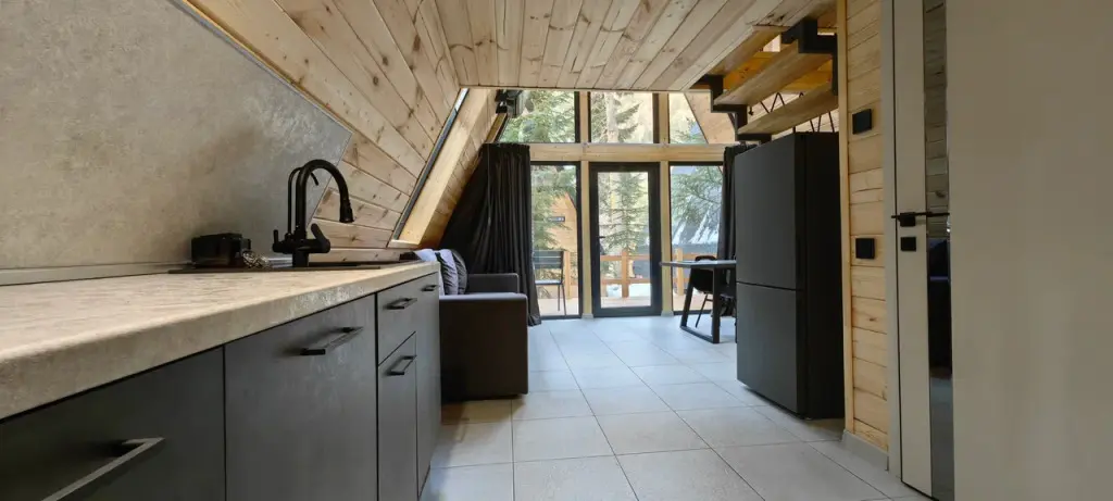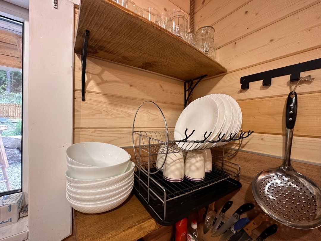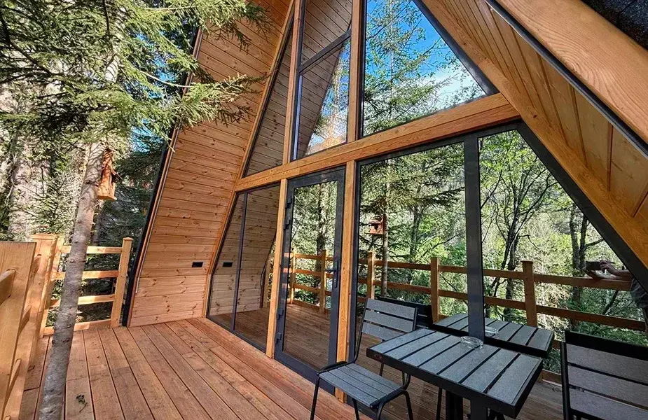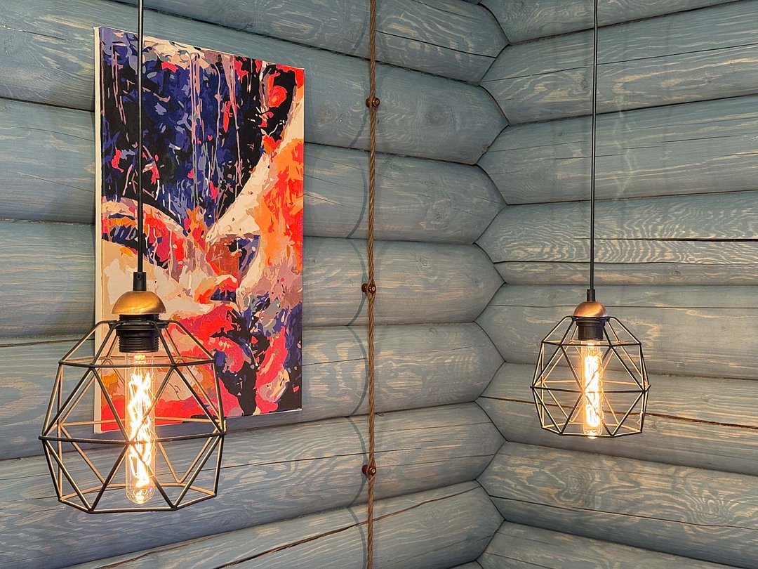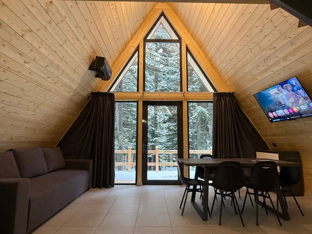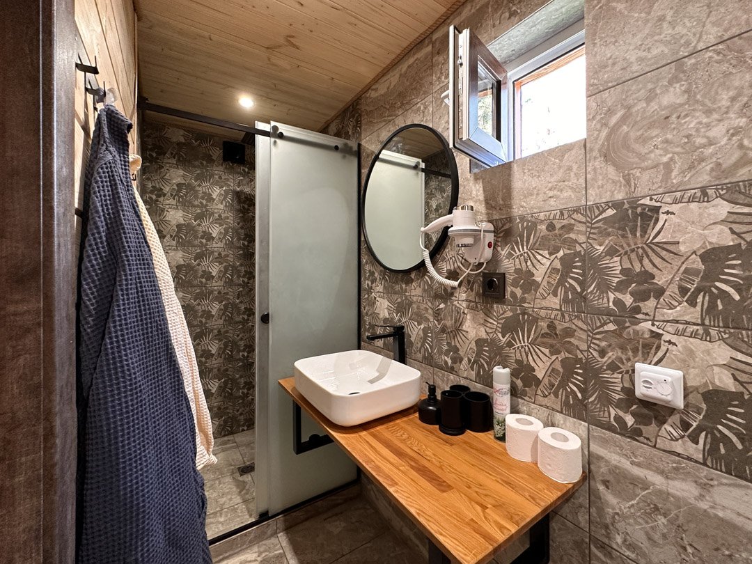Деревянные коттеджи оборудованы террасами с мебелью и мангальной зоной. Внутри есть всё необходимое: бытовая техника, посуда, удобная мебель, постельное бельё, санузел, душ и полотенца. Администрация базы тщательно следит за чистотой как в домиках, так и на территории.