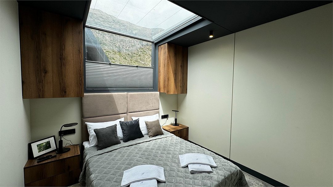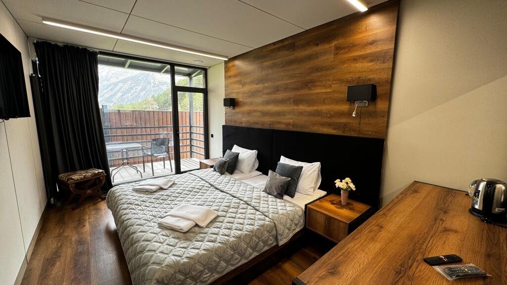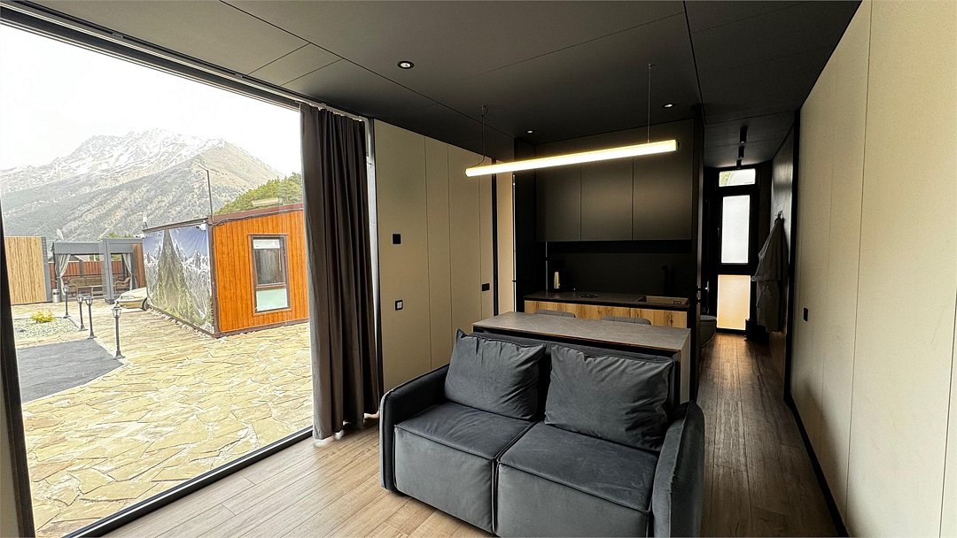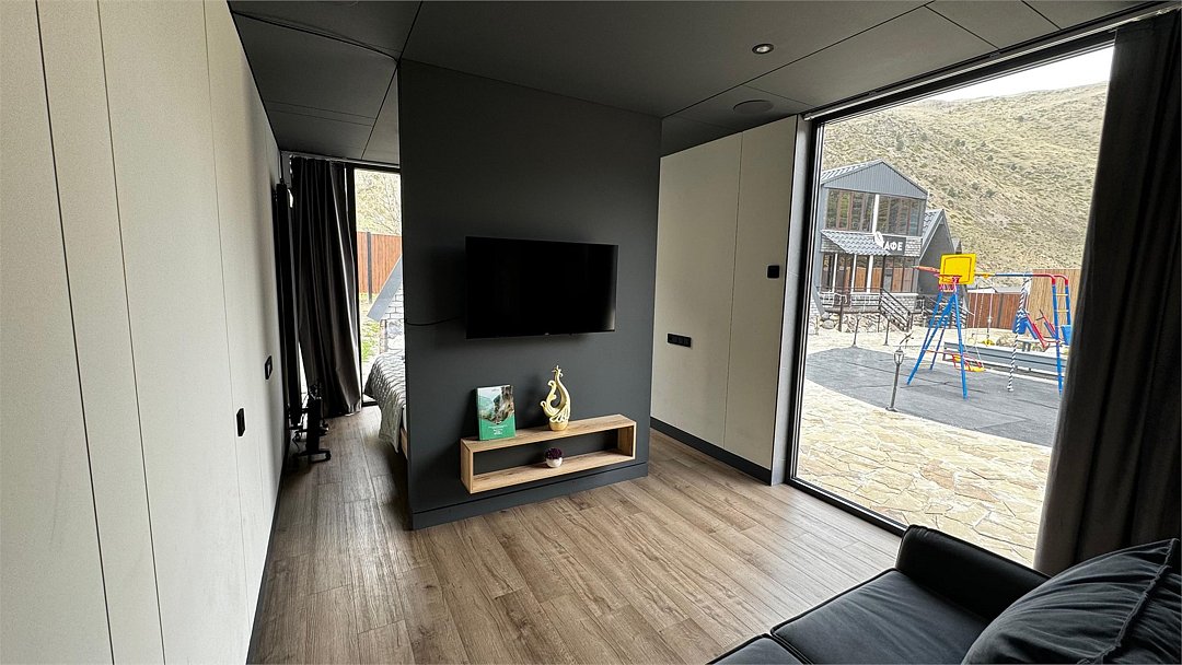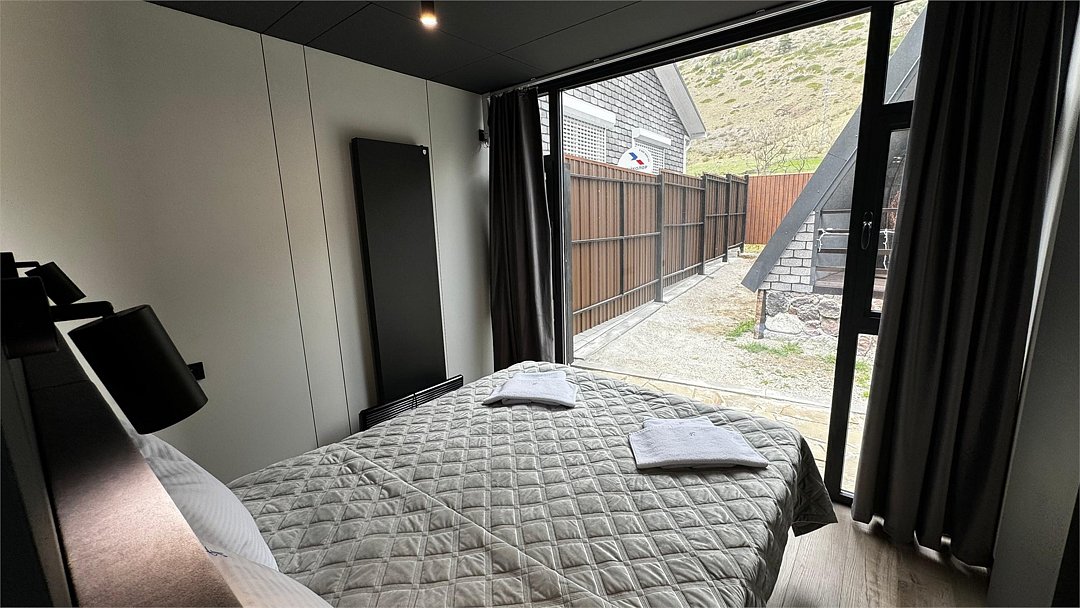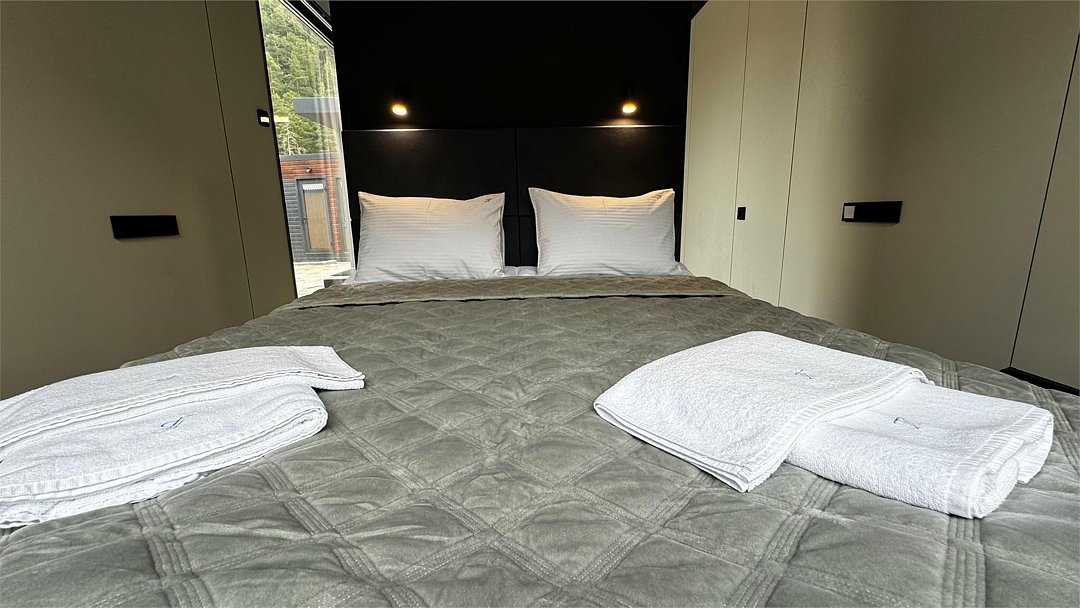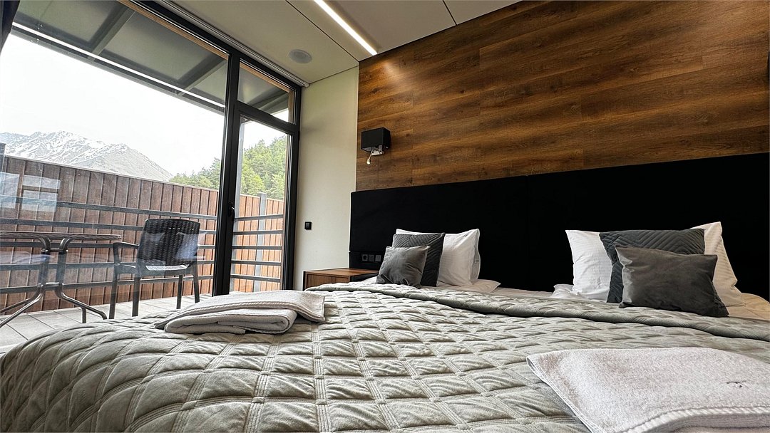 Две двуспальные кровати, две гостиные, в каждой есть телевизор диван-кровать, и кресло раскладушка. Ковровое покрытие на полу. Первый этаж полноценная оснащенная кухня и два сан узла. Потрясающие виды из окна на горы.Двухместный коттедж Classic двуспальная кровать