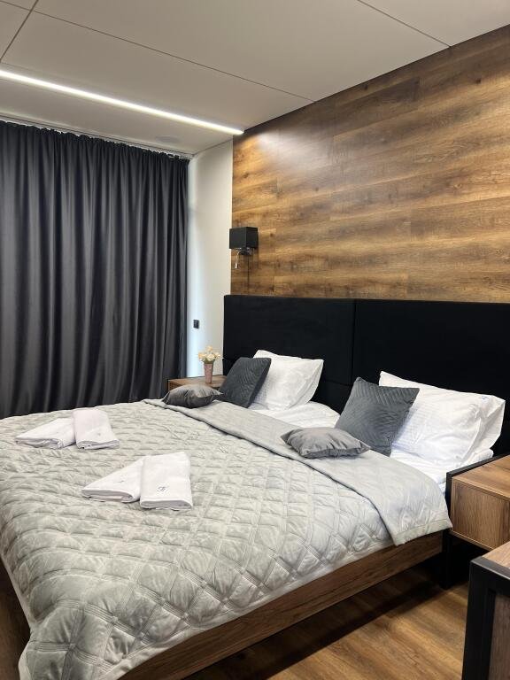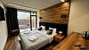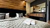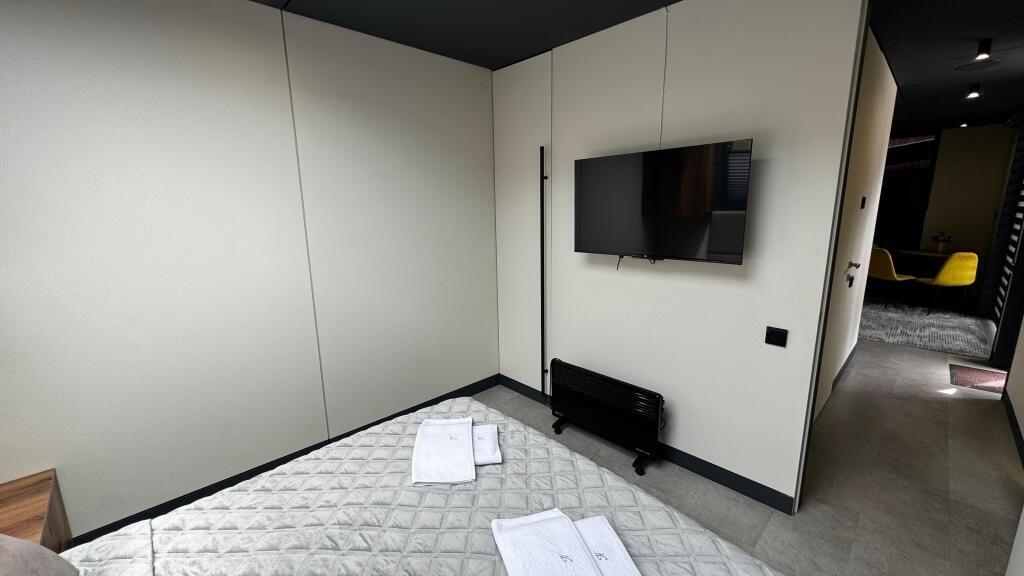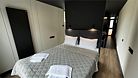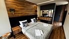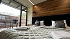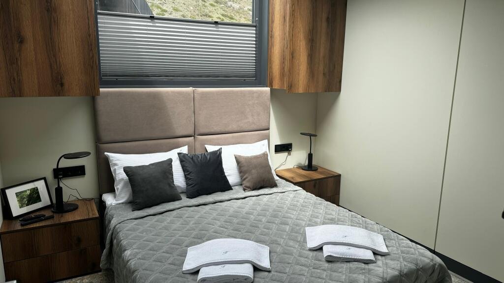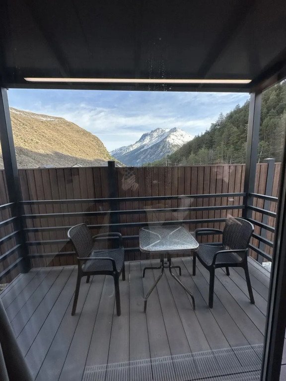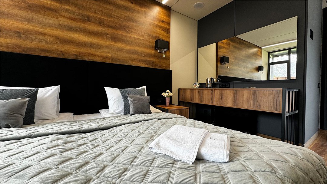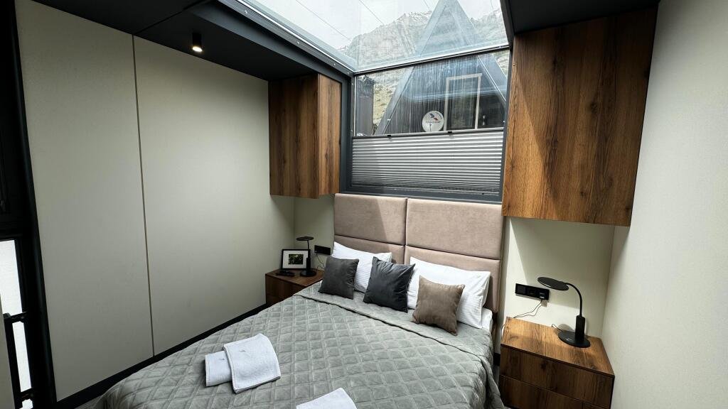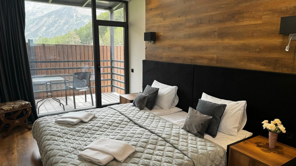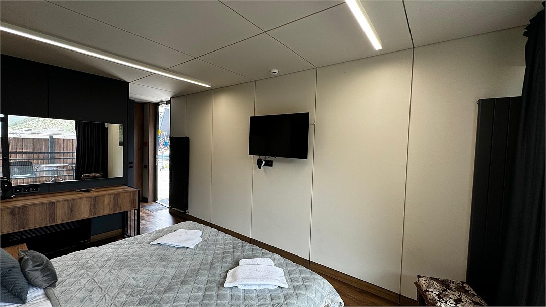 Две двуспальные кровати, две гостиные, в каждой есть телевизор диван-кровать, и кресло раскладушка. Ковровое покрытие на полу. Первый этаж полноценная оснащенная кухня и два сан узла. Потрясающие виды из окна на горы.Двухместный коттедж Classic двуспальная кровать