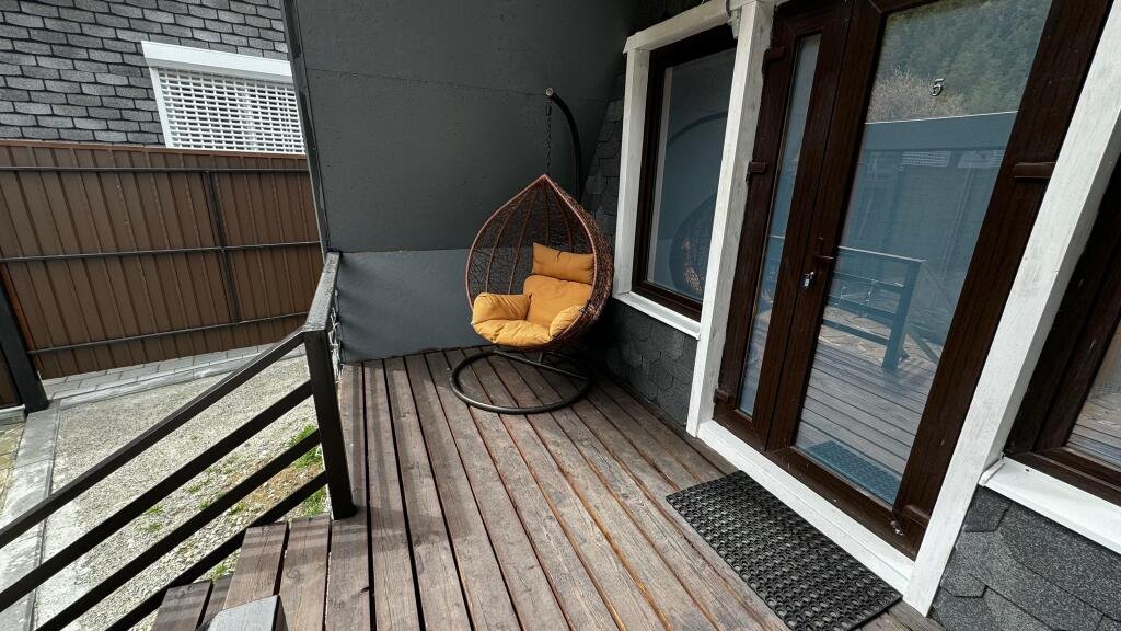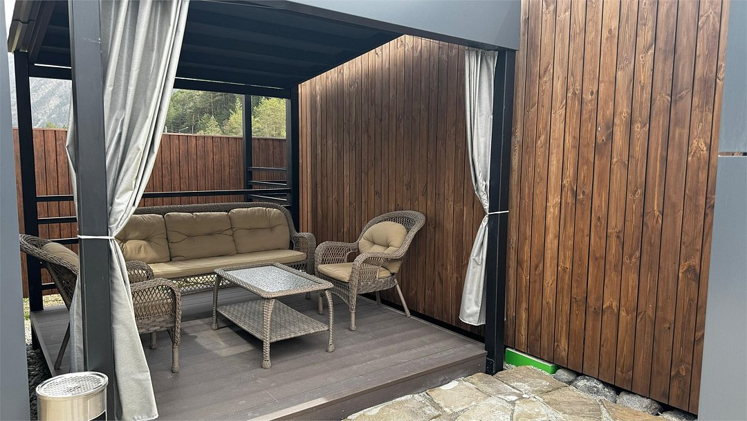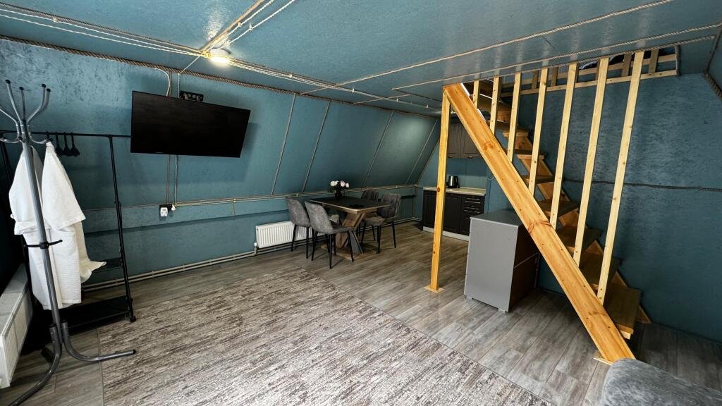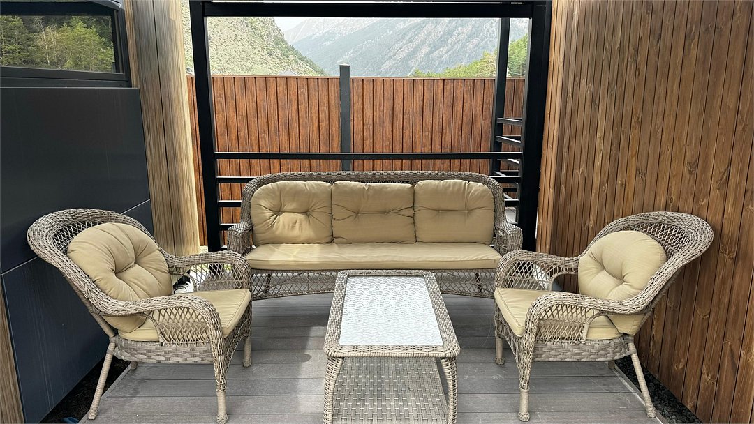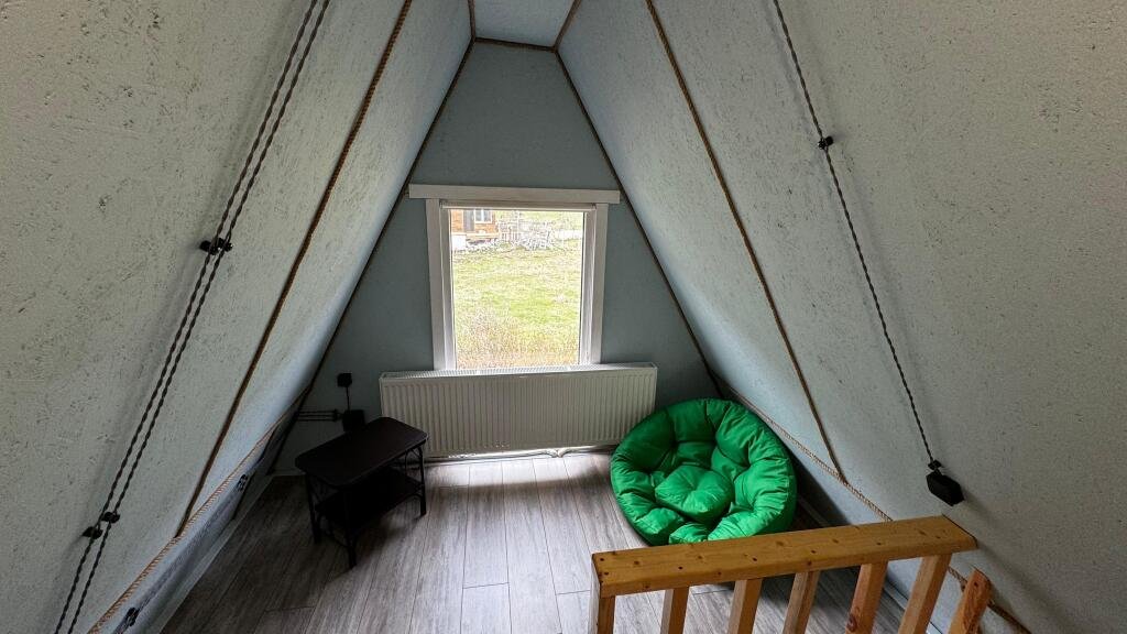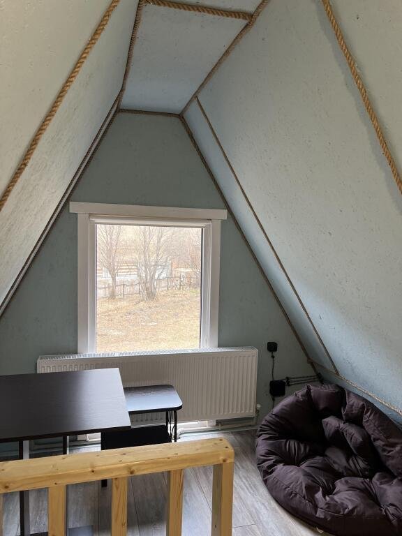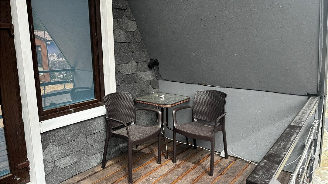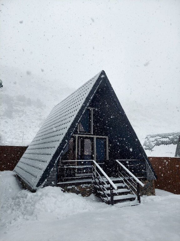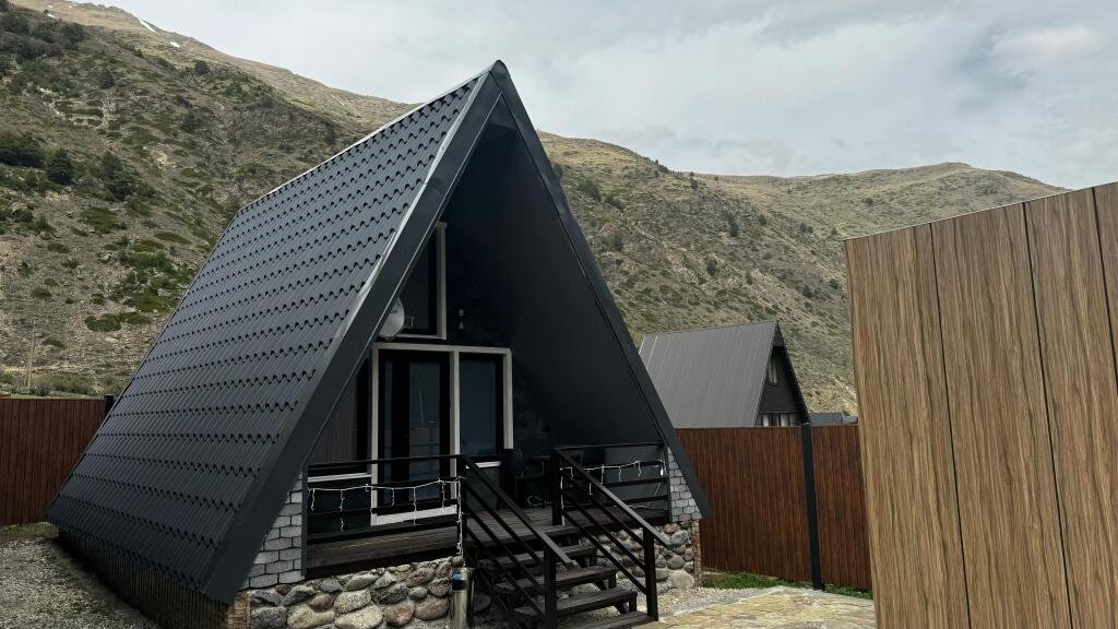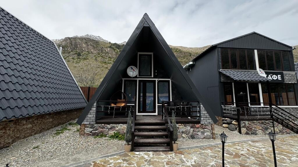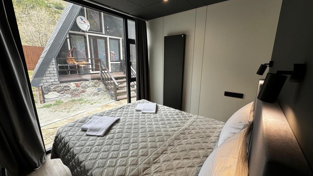 Двухэтажный коттедж A-frame площадью 48 м² вмещает до 4 человек. На первом этаже расположена небольшая кухня с холодильником, микроволновой печью, всей необходимой посудой. Также здесь раскладной диван, телевизор со Smart-TV, обеденный стол и стулья. На втором этаже – двуспальная кровать с ортопедическим матрасом под мансардной крышей, уютное мягкое кресло и столик у окна с видом на горы. В ванной комнате: душевая кабина с тропическим душем, раковина, зеркало с подсветкой, унитаз, гигиенический душ, гигиенические средства (шампунь, гель для душа, жидкое мыло), фен, полотенцесушитель. Для всех гостей предоставляем хлопковые халаты и тапочки. При входе в домик – кресло-качеля и небольшой столик со стульями.Коттедж семейный