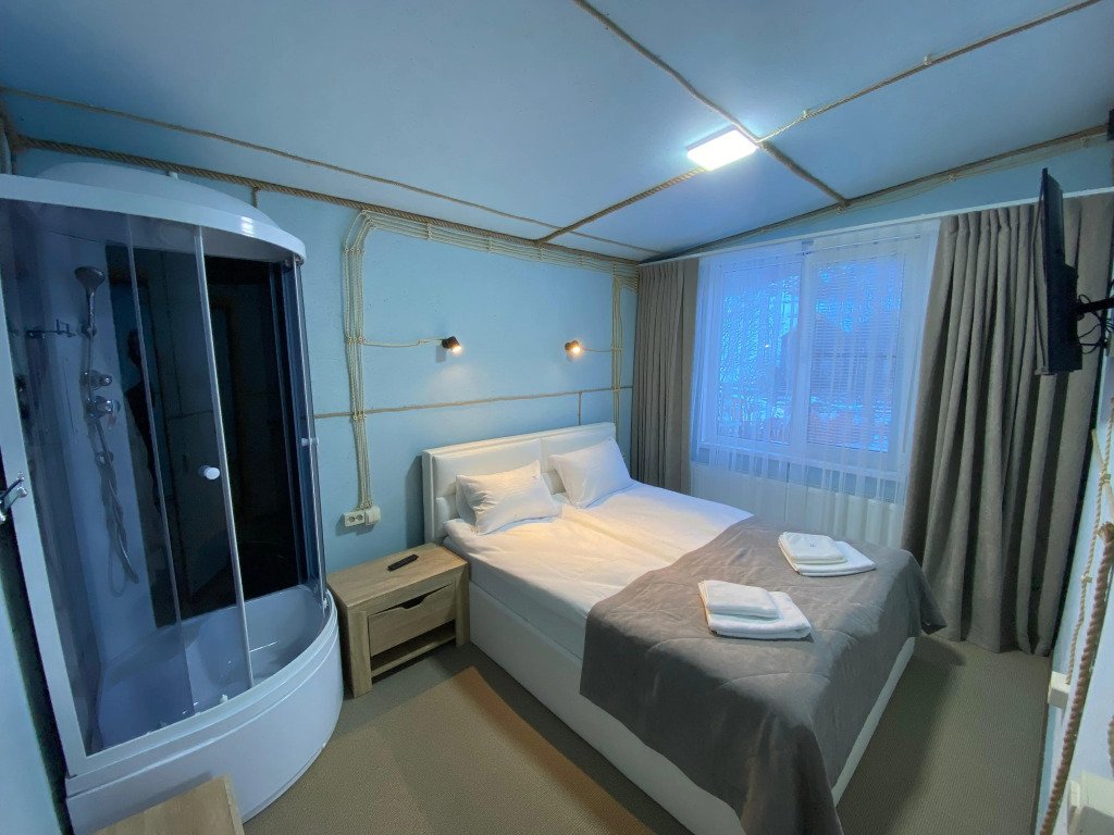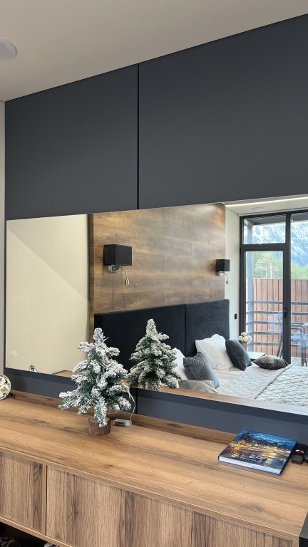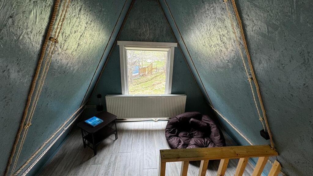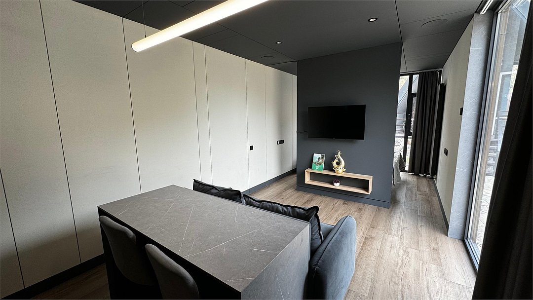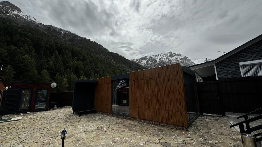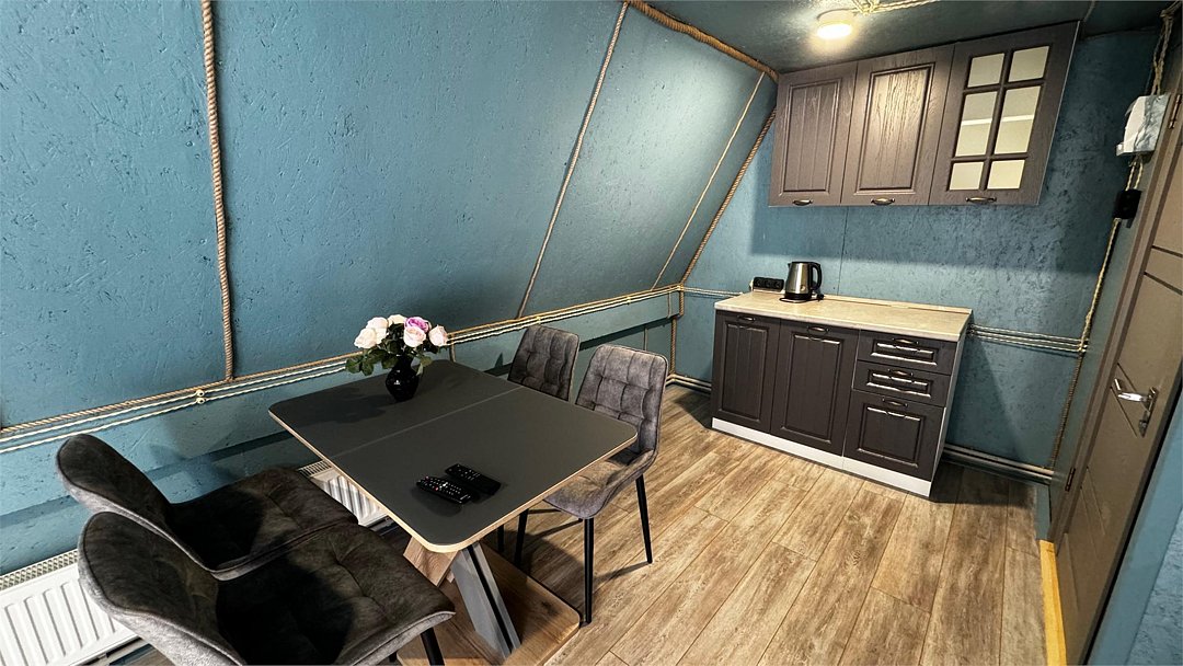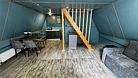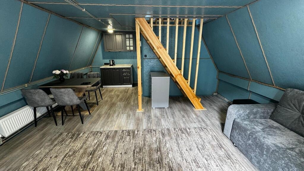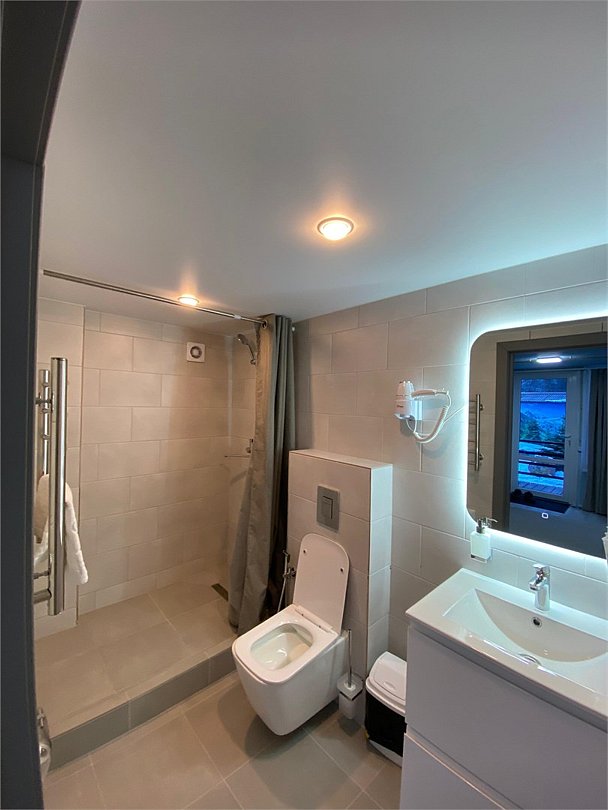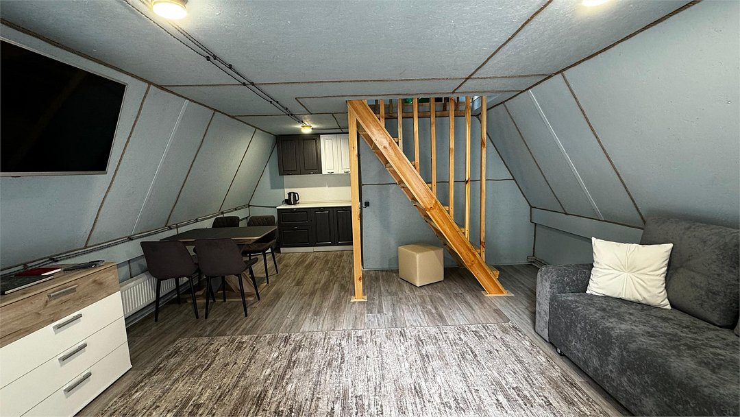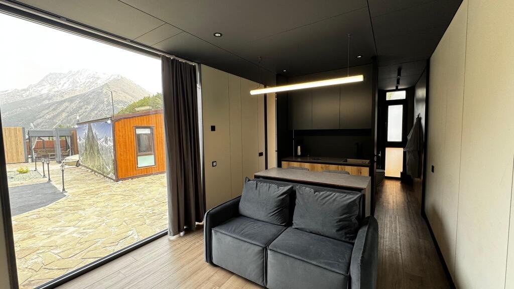 Двухэтажный коттедж A-frame площадью 48 м² вмещает до 4 человек. На первом этаже расположена небольшая кухня с холодильником, микроволновой печью, всей необходимой посудой. Также здесь раскладной диван, телевизор со Smart-TV, обеденный стол и стулья. На втором этаже – двуспальная кровать с ортопедическим матрасом под мансардной крышей, уютное мягкое кресло и столик у окна с видом на горы. В ванной комнате: душевая кабина с тропическим душем, раковина, зеркало с подсветкой, унитаз, гигиенический душ, гигиенические средства (шампунь, гель для душа, жидкое мыло), фен, полотенцесушитель. Для всех гостей предоставляем хлопковые халаты и тапочки. При входе в домик – кресло-качеля и небольшой столик со стульями.Коттедж семейный