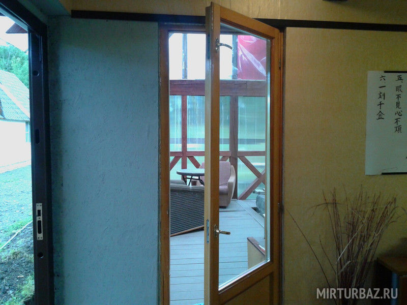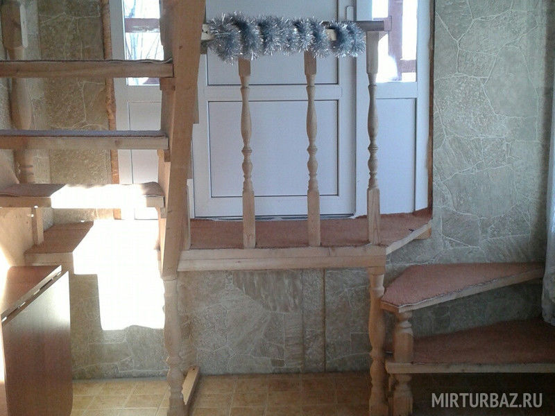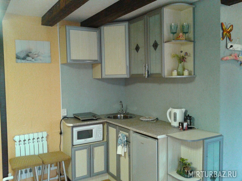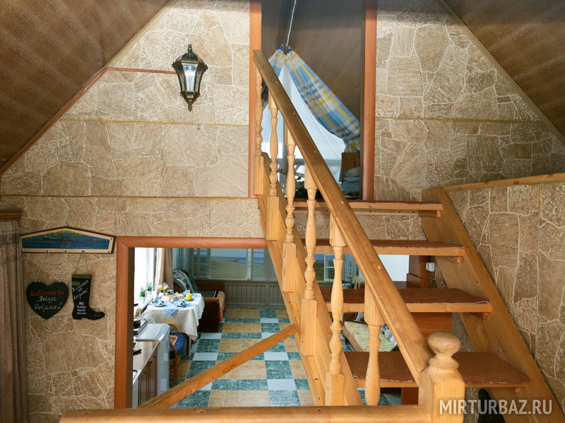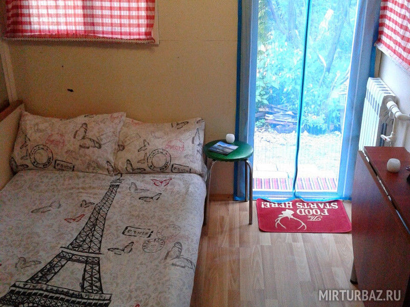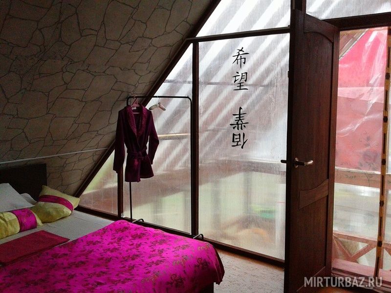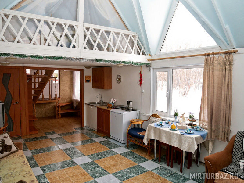 В двухэтажном доме: спальня на 2 этаже (кровати можно сдвигать), гостиная с кухней (теплый пол), душ, туалет. Бассейн с термальной водой возле крыльца. Дом с европейским интерьером.
