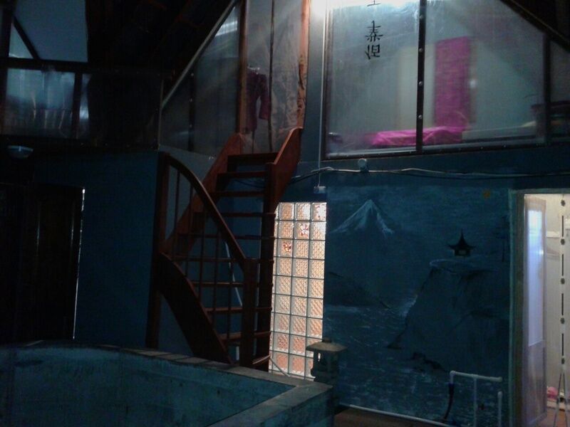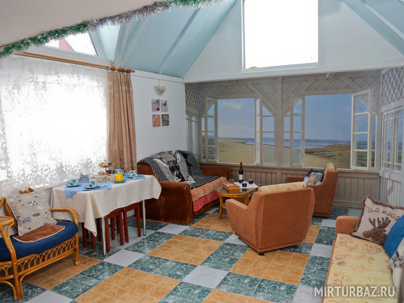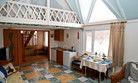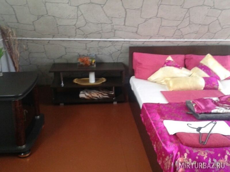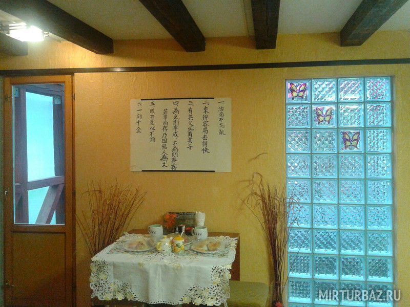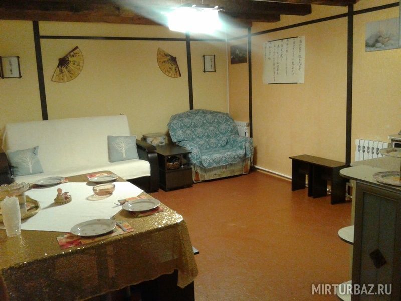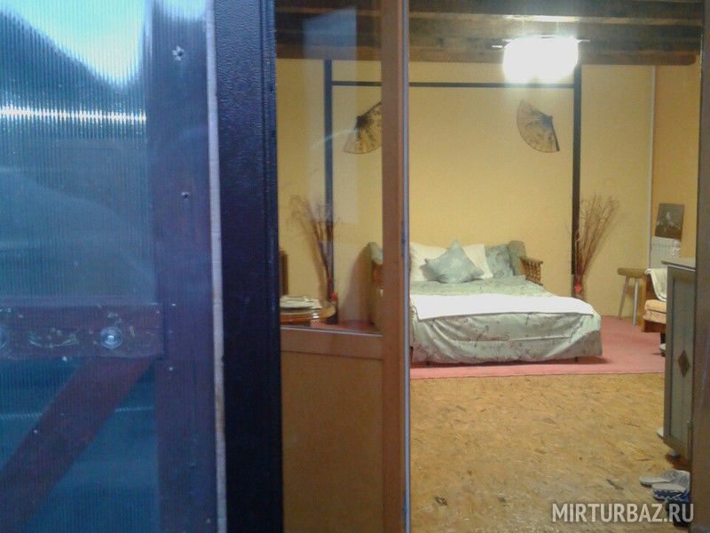 Интерьер дома в восточном стиле шину-азри. Гостиная с кухней и туалетом с душем. Отдельный вход. В гостиной: диван раскладной и раздвижное кресло, встроенная кухня (плита,холодильник,СВЧ), оборудованной всем необходимым, обеденный стол. Туалет и душ. Есть выход прямо из комнаты в крытое и теплое помещение с термальным бассейном.
