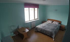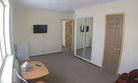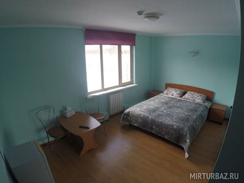 Номер с одной двухспальной кроватью, столом, 2 стульями, холодильником и телевизором.