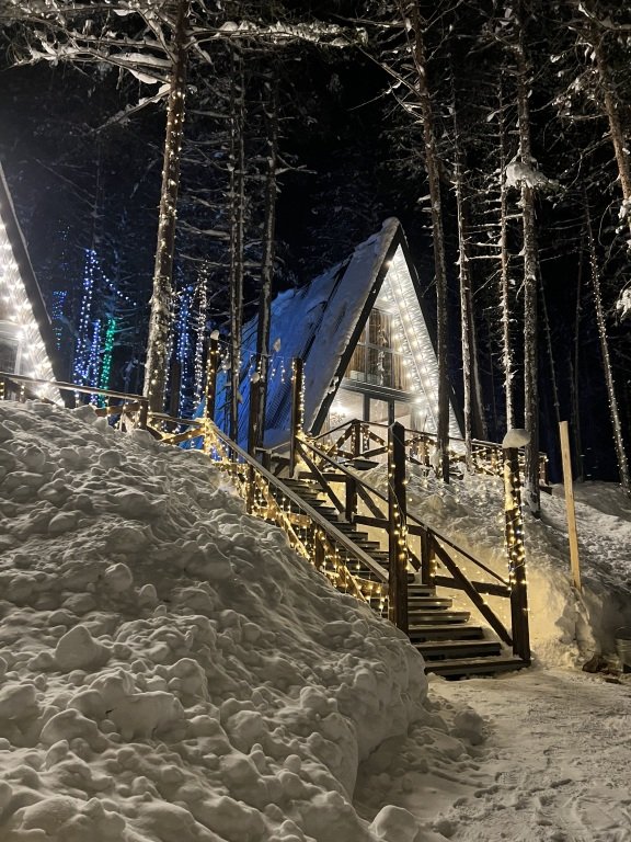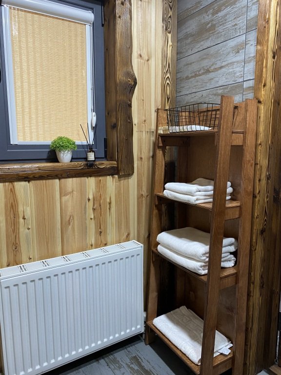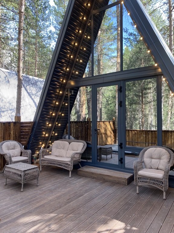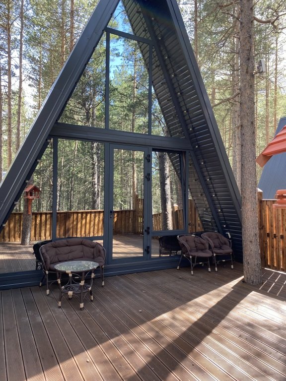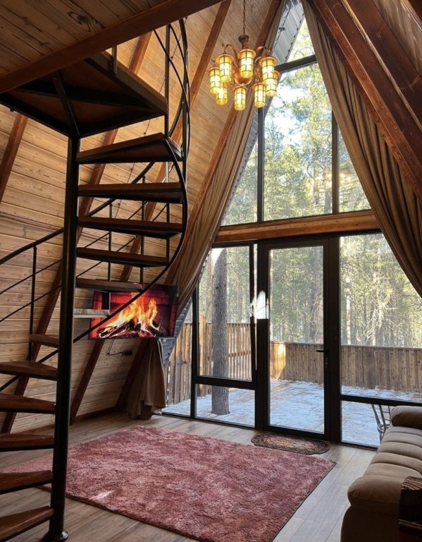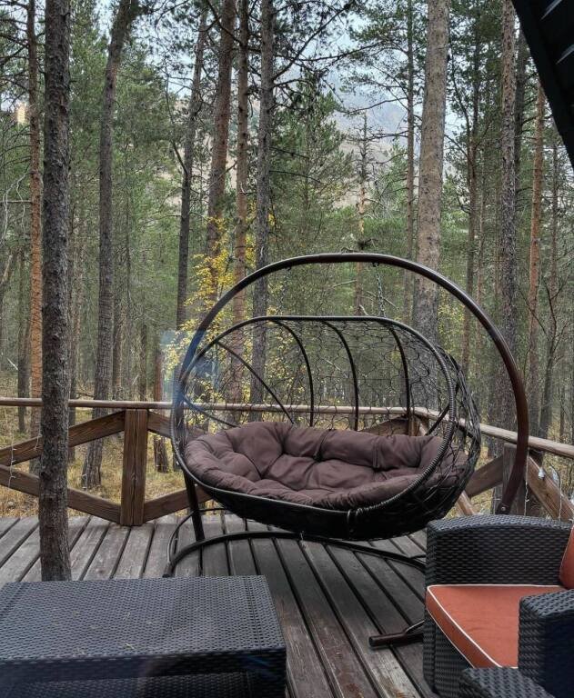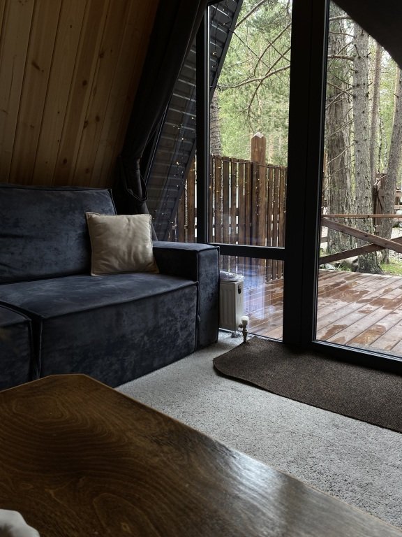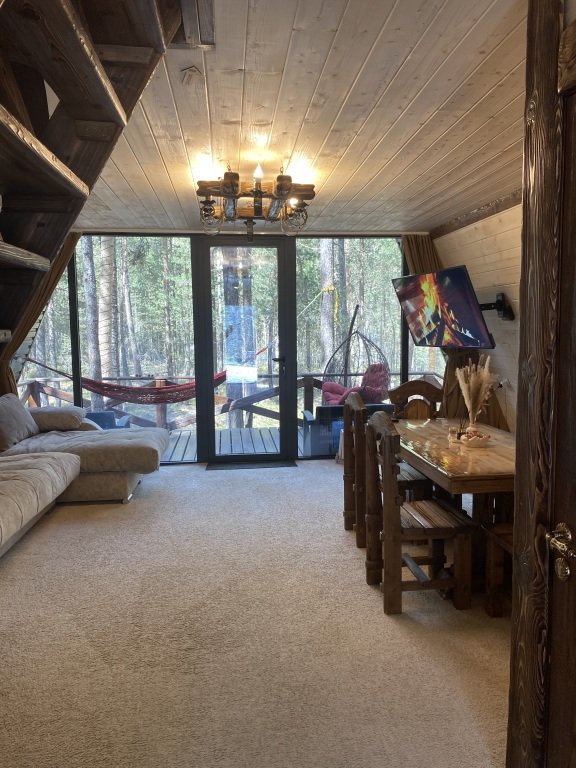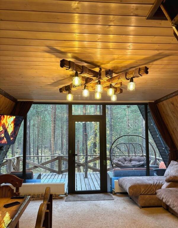 Дом оборудован просторной верандой, где можно отдыхать на уличной мебели, расслабляться в гамаке или качелях, наслаждаясь окружающей природой. Внутри дома есть все необходимое для комфортного проживания: смарт-телевизор, доступ к Wi-Fi, холодильник, микроволновая печь, электрический чайник, фен, а также индивидуальный набор гигиенических средств.