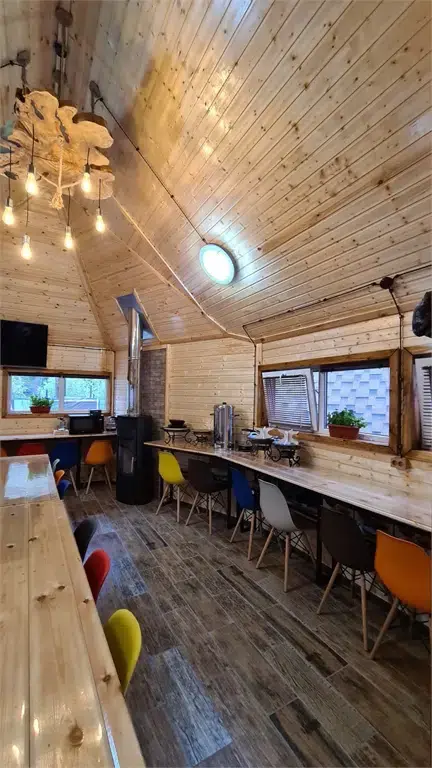 Уютное пространство с атмосферой настоящего горного шале — идеальное место для дружеских встреч, семейных праздников или корпоративных мероприятий.