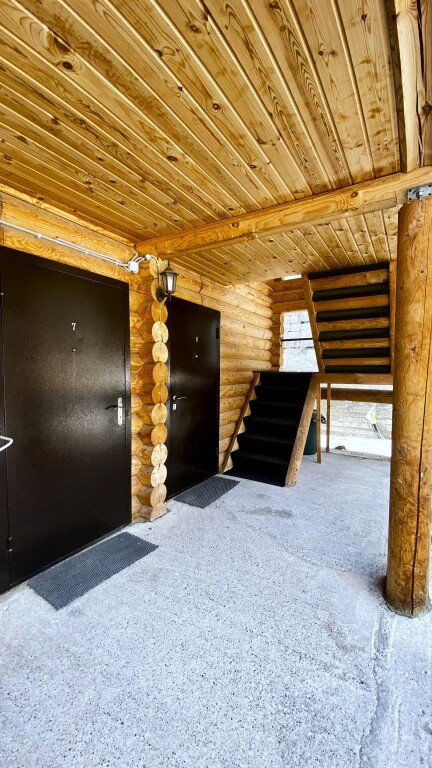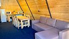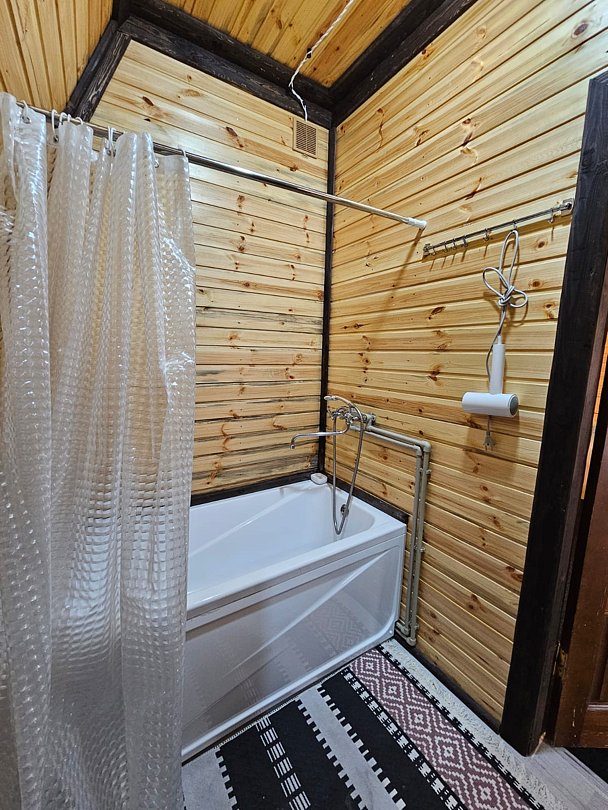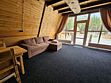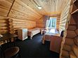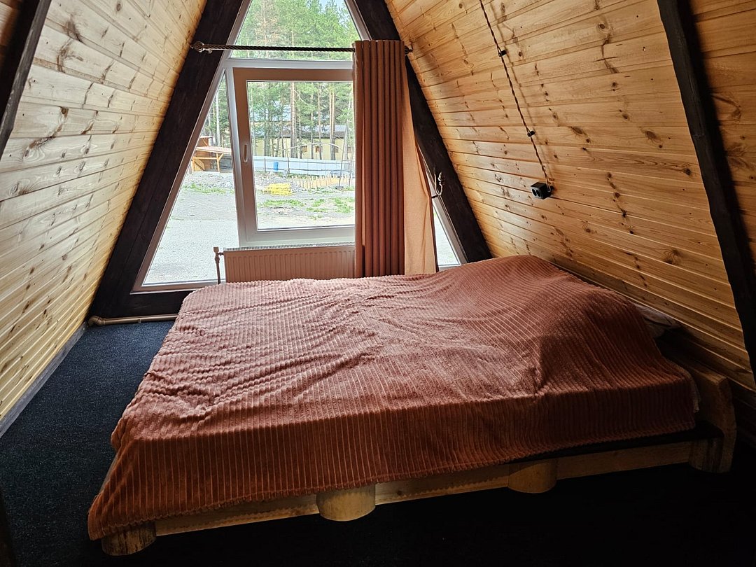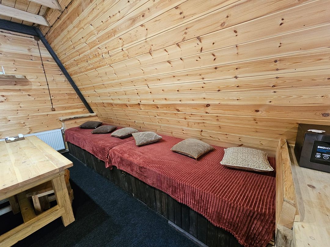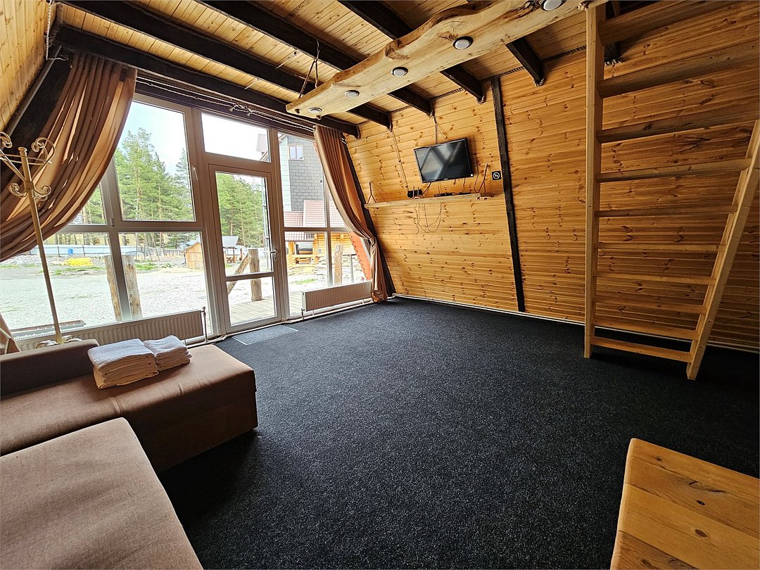 Просторный коттедж, выполненный из натурального дерева с 2 спальнями на 2 этаже и гостиной с спальной зоной на 1 этаже.