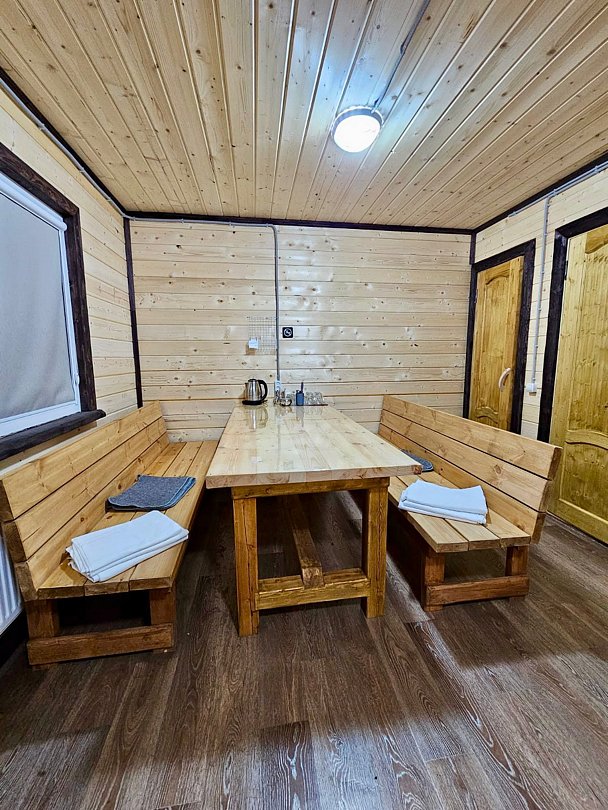 Баня имеет 3 отдельные кабинки рассчитанные на 6 человек. За каждого последующего человека доплата 500 ₽, максимум 8-9 человек.