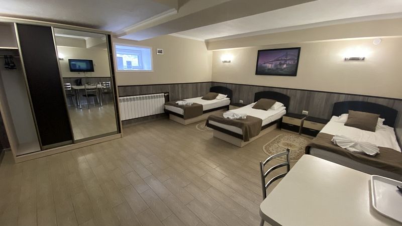 Трехместная студия хорошо подходит для проживания компании друзей из четырех–пяти человек. Одним из основных преимуществ большинства наших номеров является наличие полноценной кухни со всей необходимой посудой, и трехместная Студия относится к таким номерам.