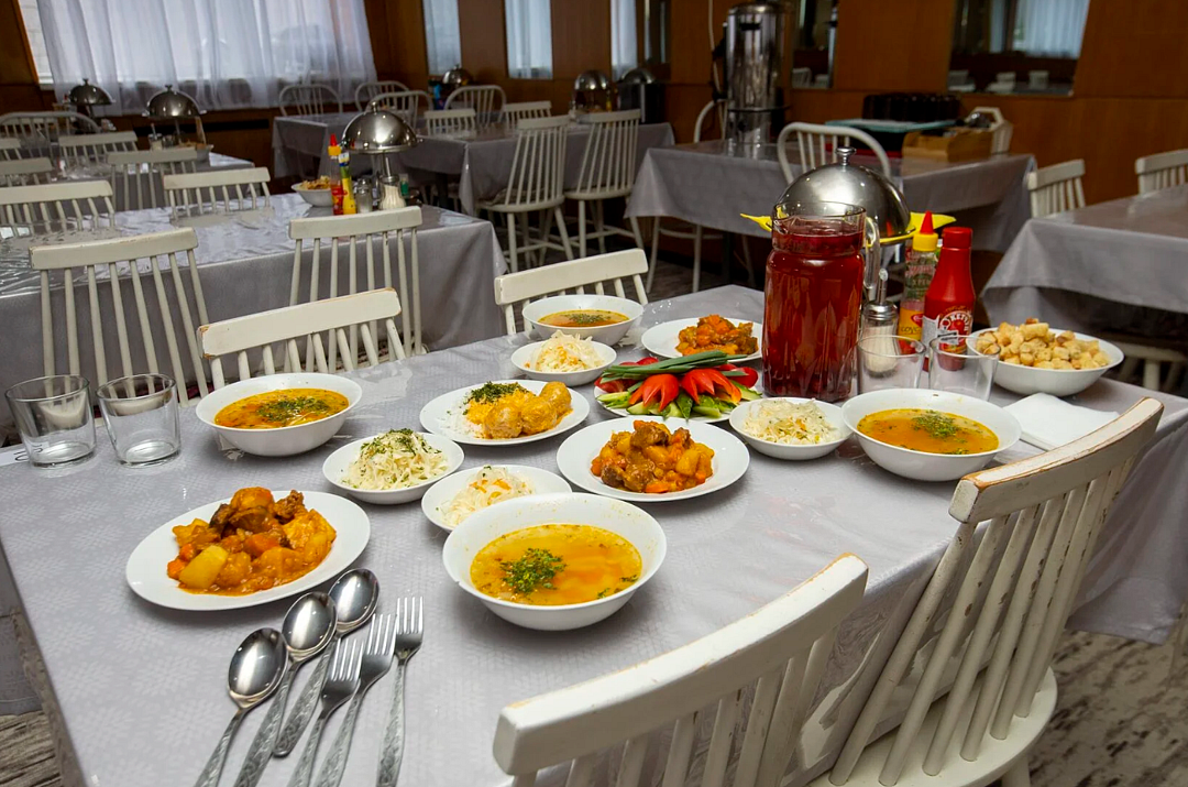 В пансионате питание проходит в светлом просторном помещении столовой. Для Вас отличные повара приготовят разнообразные блюда местной кавказской кухни.