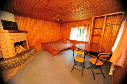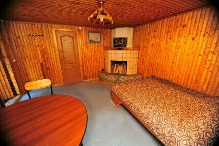 Камин, двуспальная кровать, мини-холодильник, чайник, посуда, постельное белье, умывальник, биотуалет.