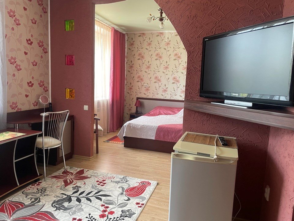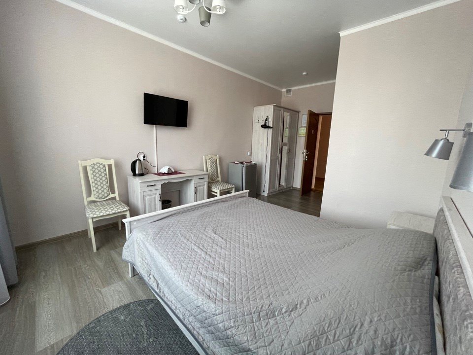 Двухкомнатный номер Люкс оснащен двуспальной кроватью, ванной комнатой, есть WI-FI. Есть Дополнительное место - раскладной диван. Стоимость дополнительного спального места 500р. В стоимость проживания входит завтрак.Услуги и удобства