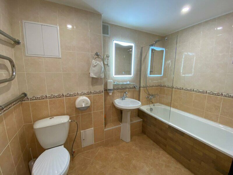 Ванна хорошая. Всё чисто. Но освежитель стоял закончившийся. У раковины нет никаких полочек, некуда вещи поставить. Зато модное светодиодное зеркало. Хороший душ. Но есть большой минус – очень-очень скользкий пол в душевой и на полу, если мокрый. И если на пол в ванной при выходе можно кинуть выдаваемое для этого полотенце, то в душевой я боялась упасть.