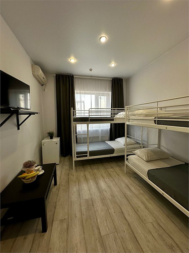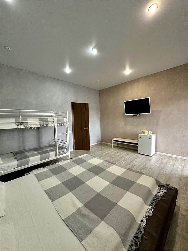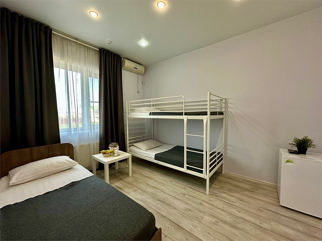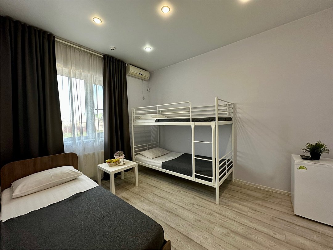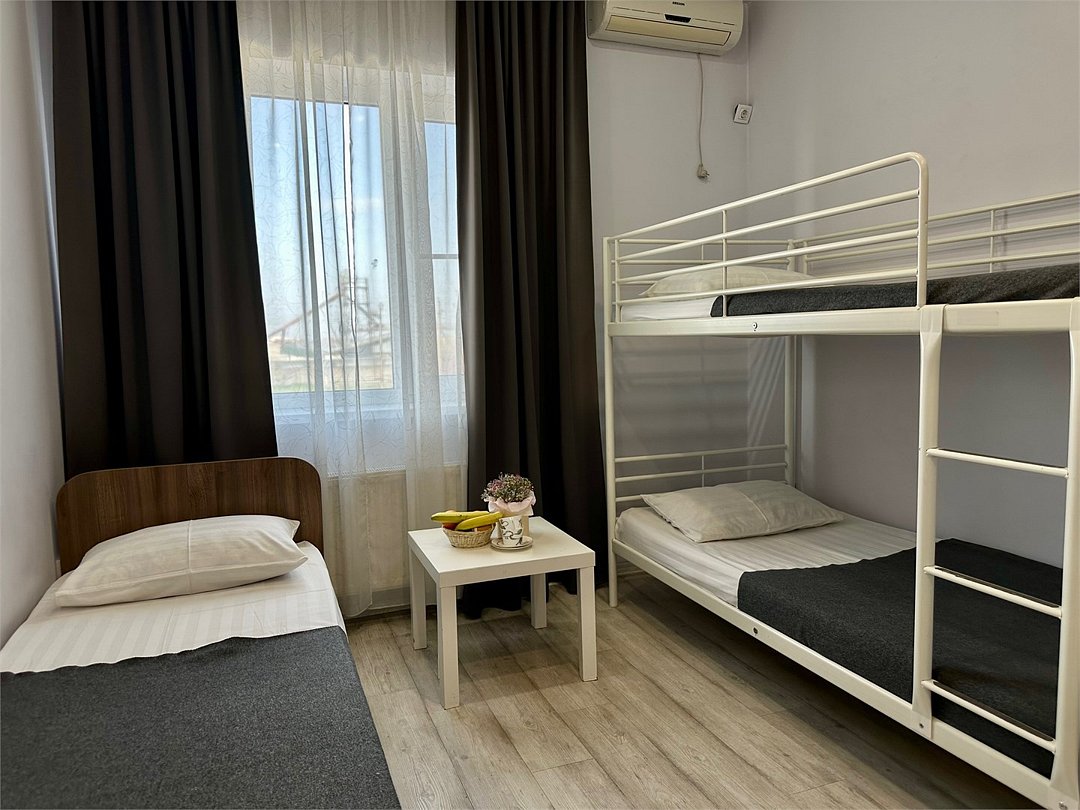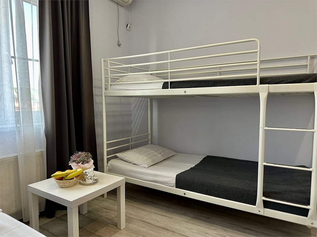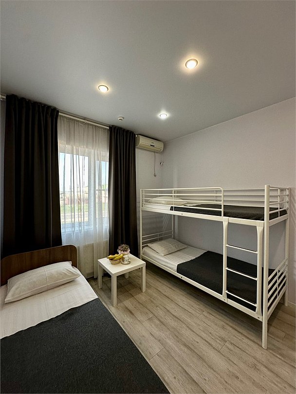 Добро пожаловать в уютный уголок, где вы сможете полностью расслабиться и наслаждаться комфортом. В нашем номере вы найдете большую двуспальную кровать, которая подарит вам сладкие сны и полноценный отдых. Рядом расположена двухъярусная кровать, идеально подходящая для гостей с детьми или компанией друзей. Интерьер выполнен в спокойных тонах, создавая атмосферу умиротворения. Большие окна с плотными шторами обеспечат вам возможность регулировать освещение по вашему желанию. Оснащение номера: Двуспальная кровать Двухъярусная кровать Кондиционер для вашего комфорта в любое время года Телевизор для вечернего просмотра любимых фильмов Прикроватные тумбочки для мелочей и удобства Вешалка для одежды и полка для багажа Современная ванная комната с необходимыми принадлежностями Добро пожаловать и чувствуйте себя как дома!Услуги и удобства