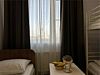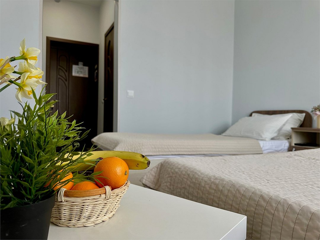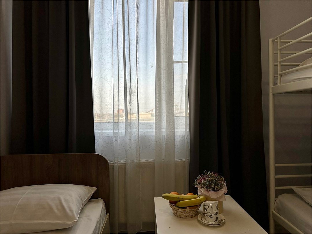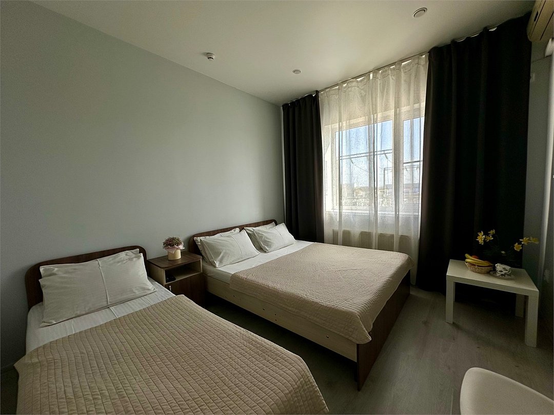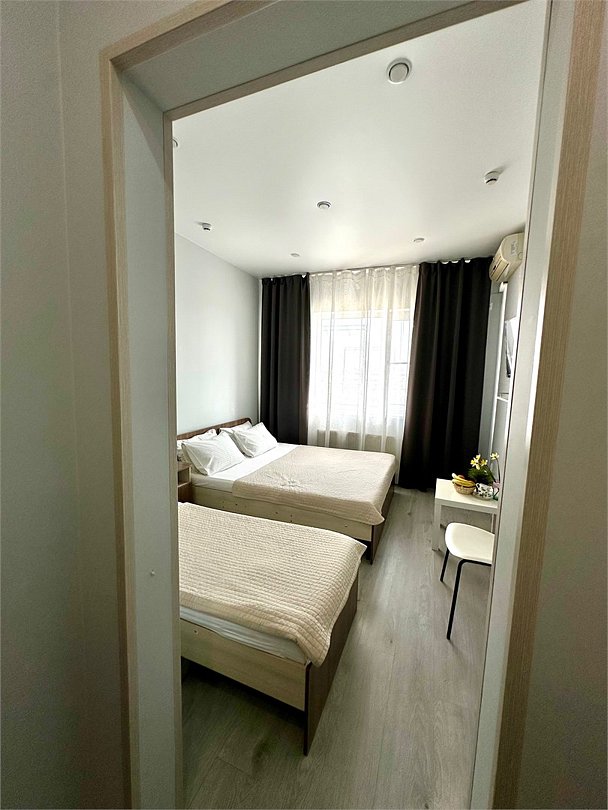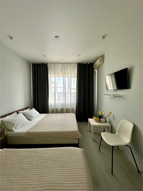 Номер выполнен в светлых и спокойных тонах, что создает уютную атмосферу для отдыха. Просторное помещение оборудовано двумя удобными кроватями и небольшим столиком. Большое окно с плотными шторами обеспечивает хорошее естественное освещение и вид на город. Оснащение номера: Две кровати с постельным бельем Прикроватная тумбочка Столик с декоративными элементами Чашки и блюдца Плотные шторы для затемнения комнаты Окно с видом на городУслуги и удобства