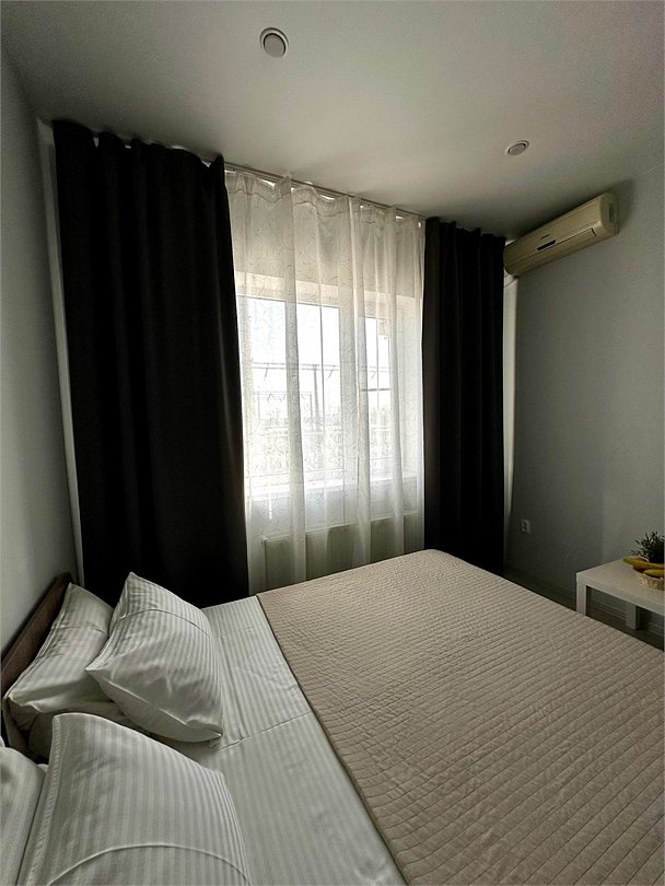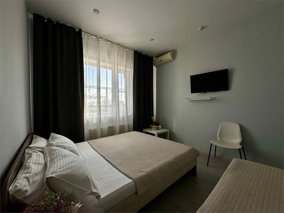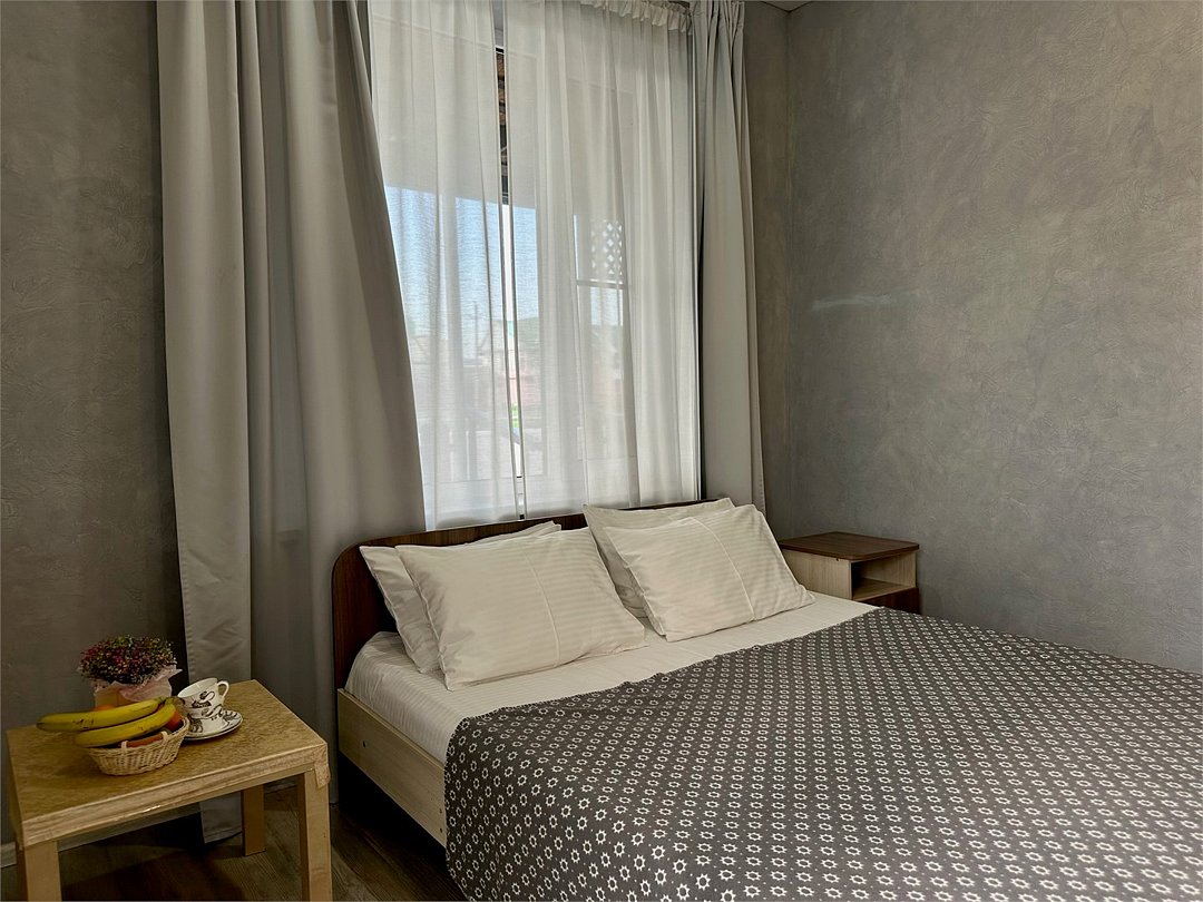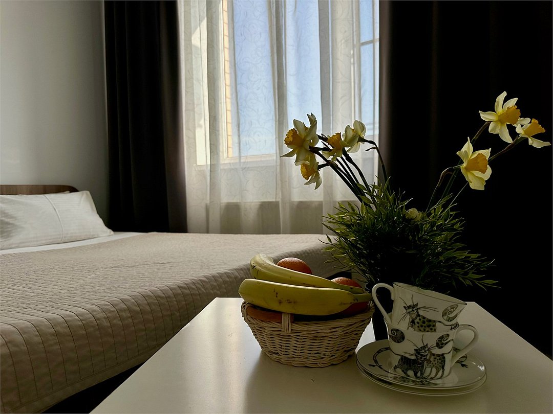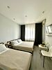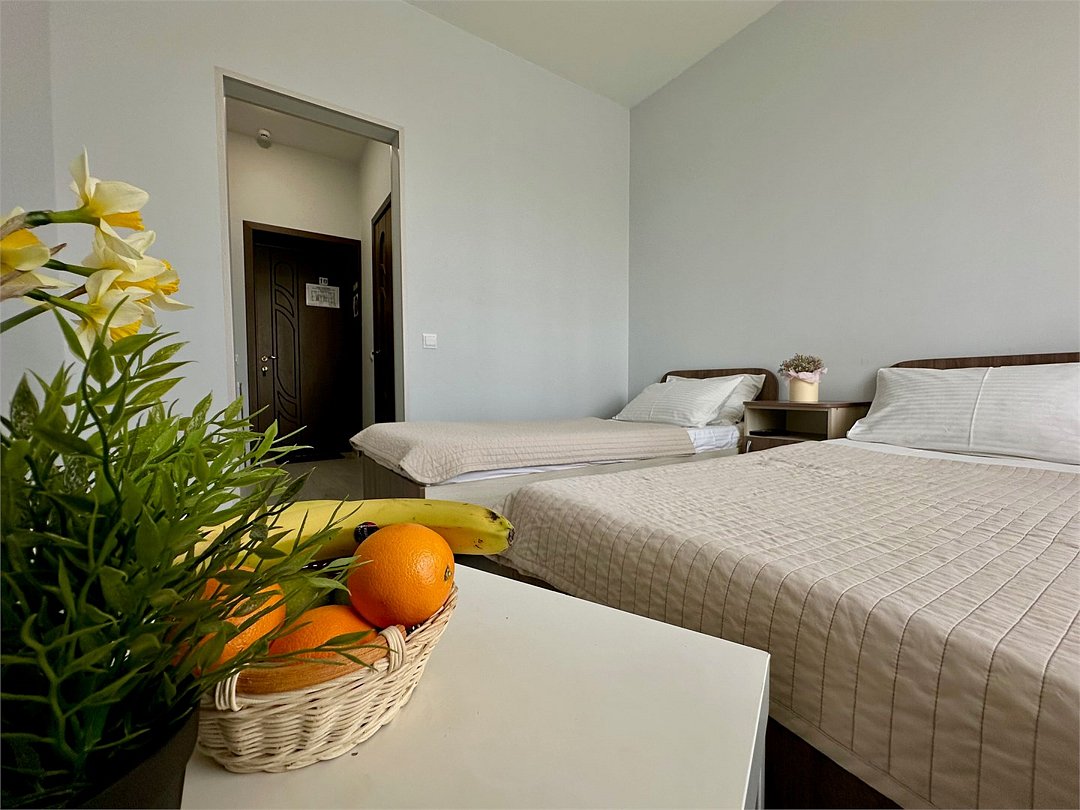 Номер выполнен в светлых и спокойных тонах, что создает уютную атмосферу для отдыха. Просторное помещение оборудовано двумя удобными кроватями и небольшим столиком. Большое окно с плотными шторами обеспечивает хорошее естественное освещение и вид на город. Оснащение номера: Две кровати с постельным бельем Прикроватная тумбочка Столик с декоративными элементами Чашки и блюдца Плотные шторы для затемнения комнаты Окно с видом на городУслуги и удобства