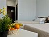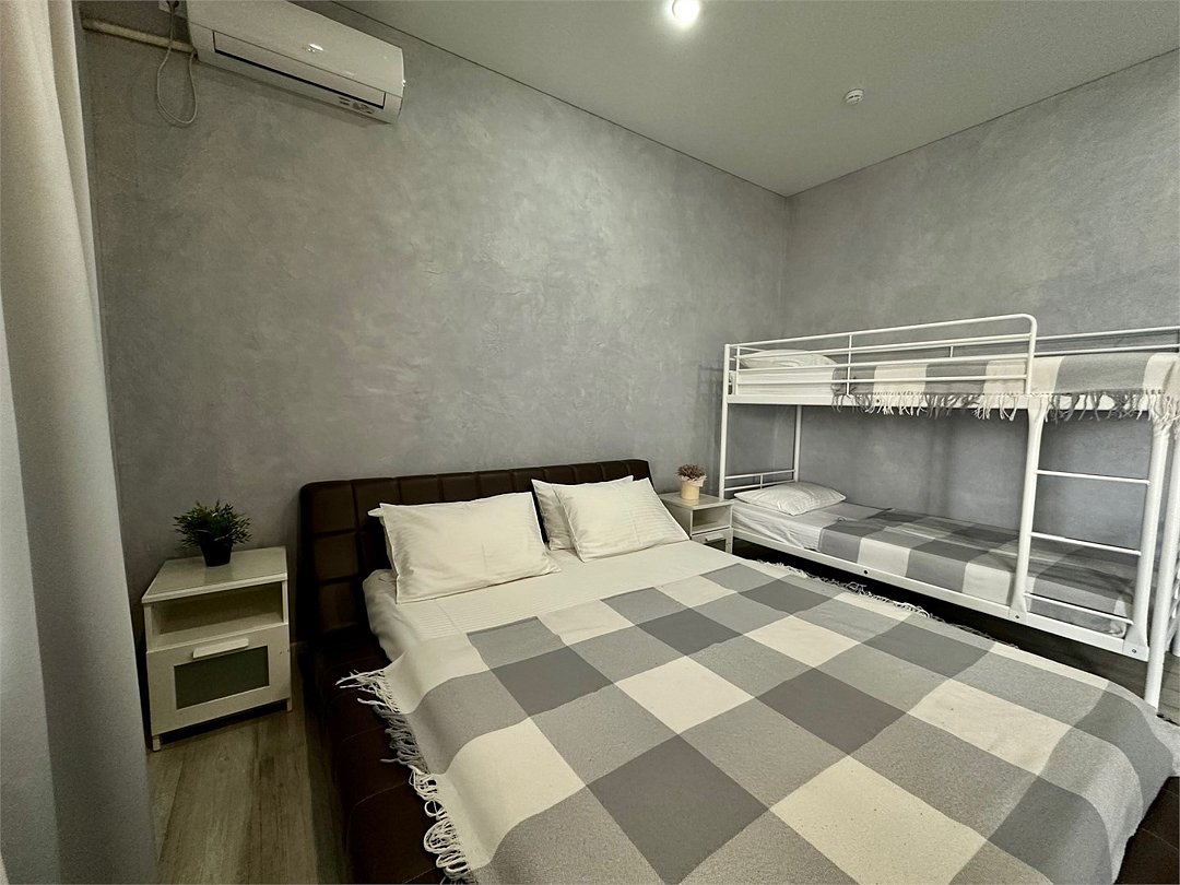Этот номер предлагает современный дизайн с ярким естественным освещением. Идеален для семейного отдыха или компаний, благодаря одной двуспальной и двум односпальным кроватям. Интерьер выполнен в спокойных тонах для большего комфорта и уюта. Просторная ванная комната дополнена свежим декором, что создает атмосферу расслабленности и уюта. Оснащение номера: Двухъярусная кровать Двуспальная кровать Телевизор Кондиционер Холодильник Ванная комната Стол Зеркало СтулУслуги и удобства
