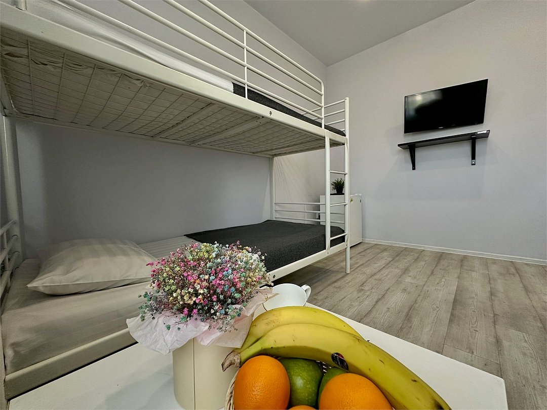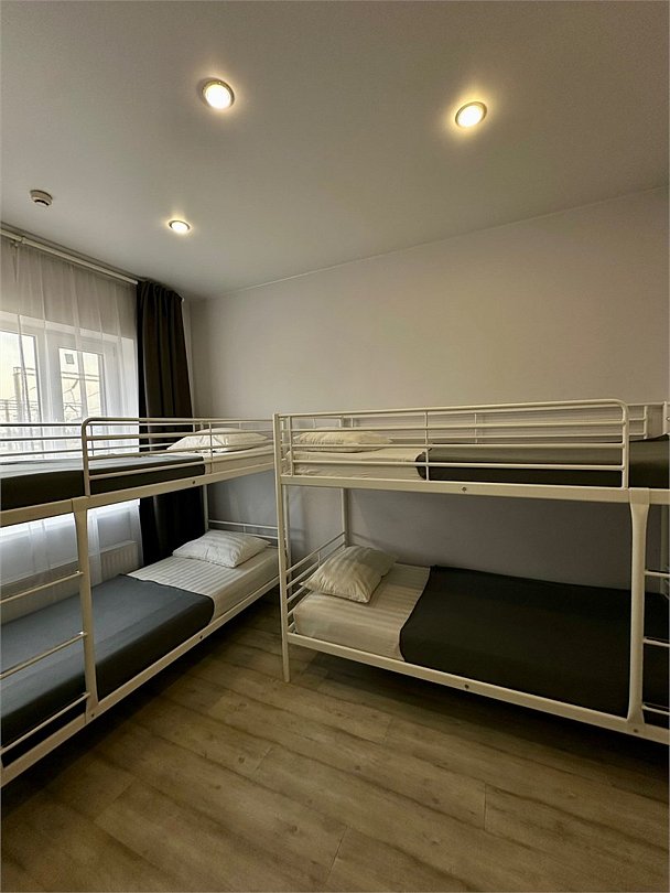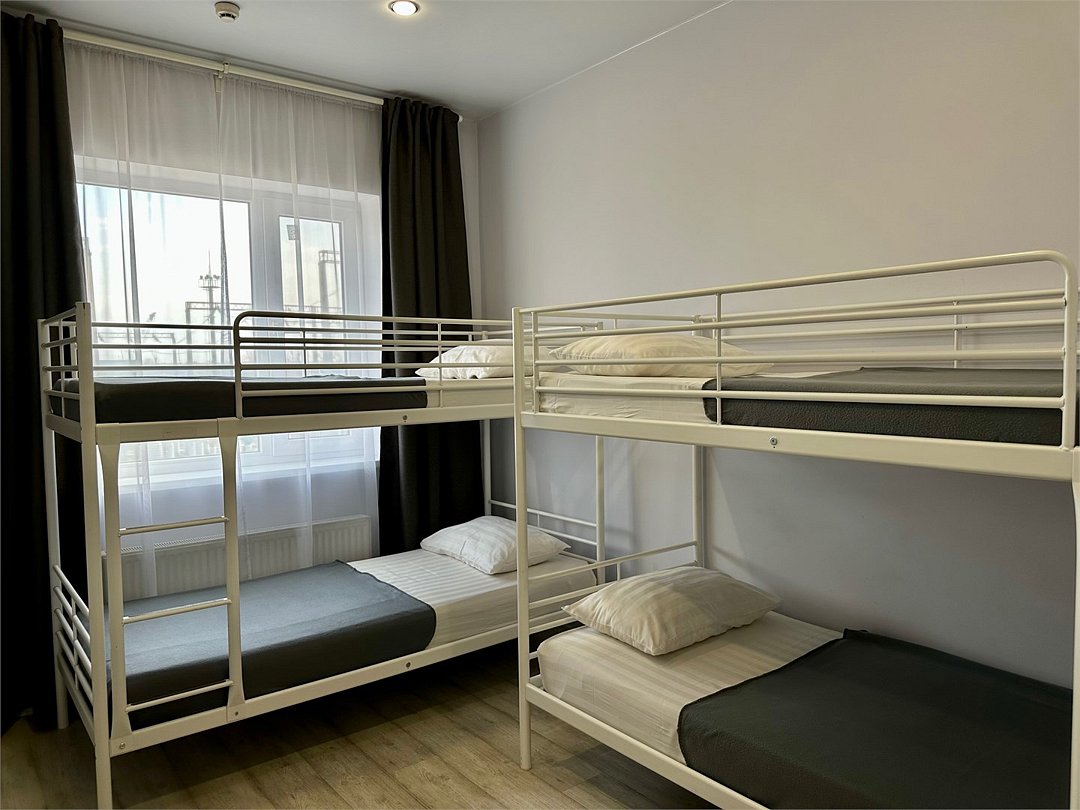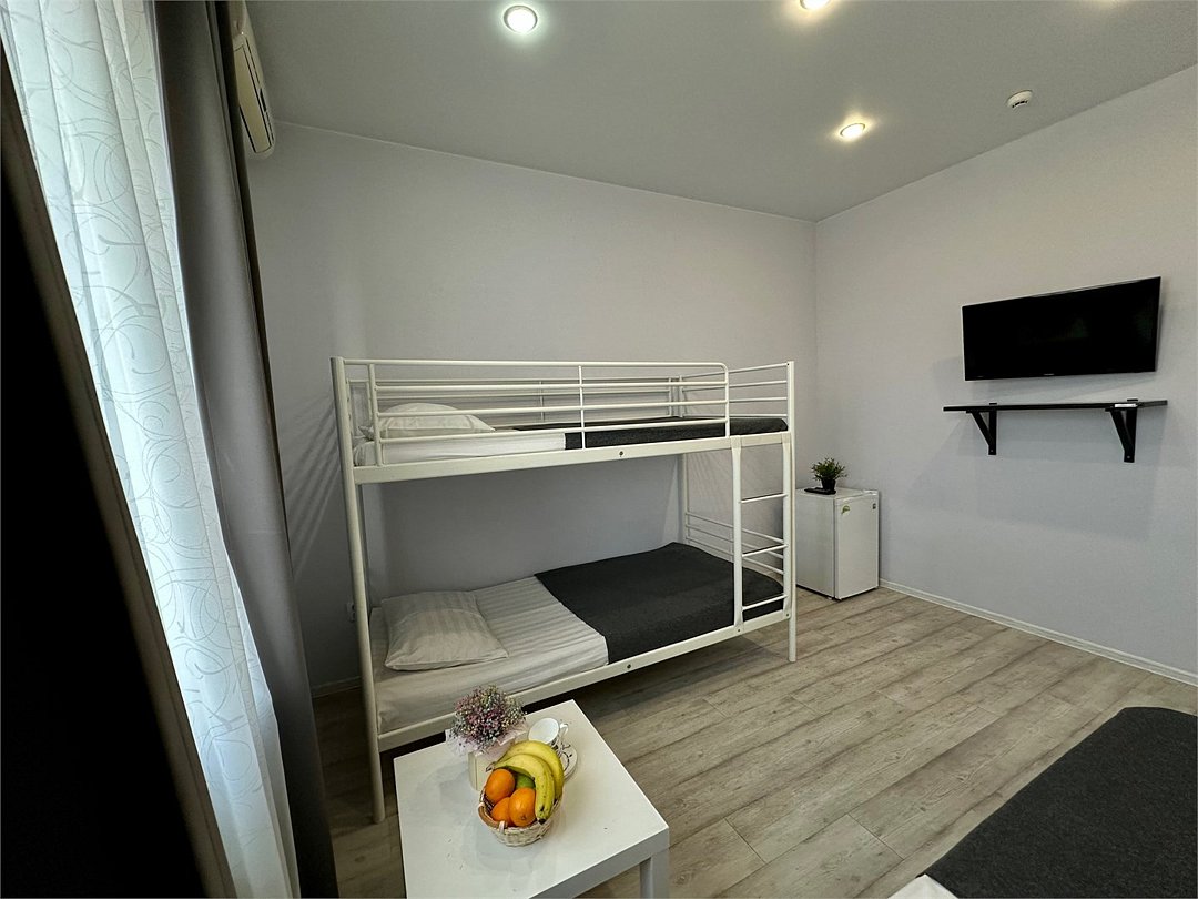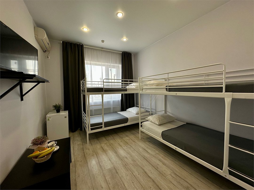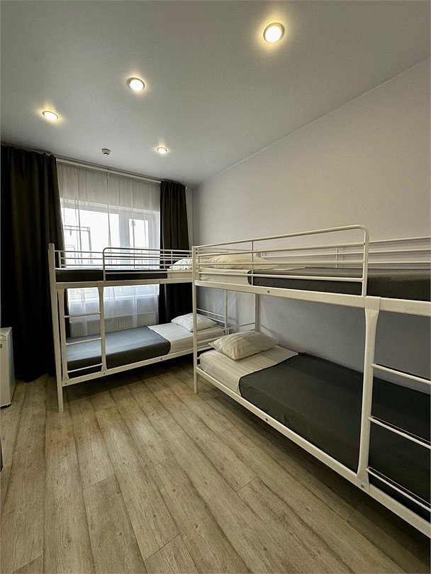 Современная и светлая комната с двумя двухъярусными кроватями, обеспечивающими удобное размещение. Пространство организовано для комфортного отдыха, с минималистичным дизайном и акцентом на функциональность.Услуги и удобства