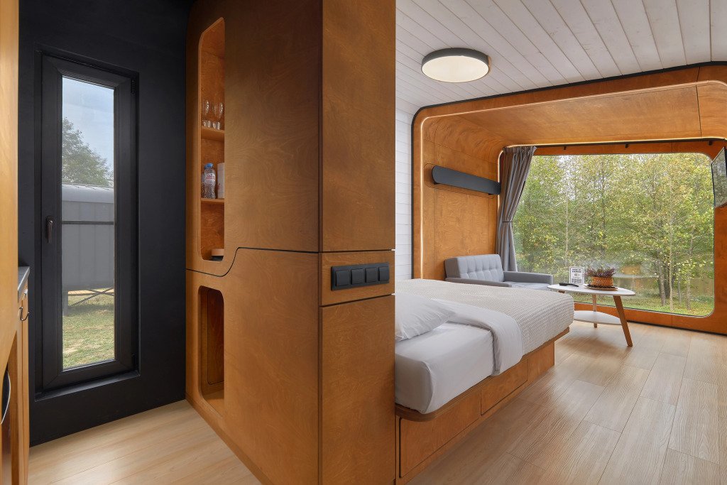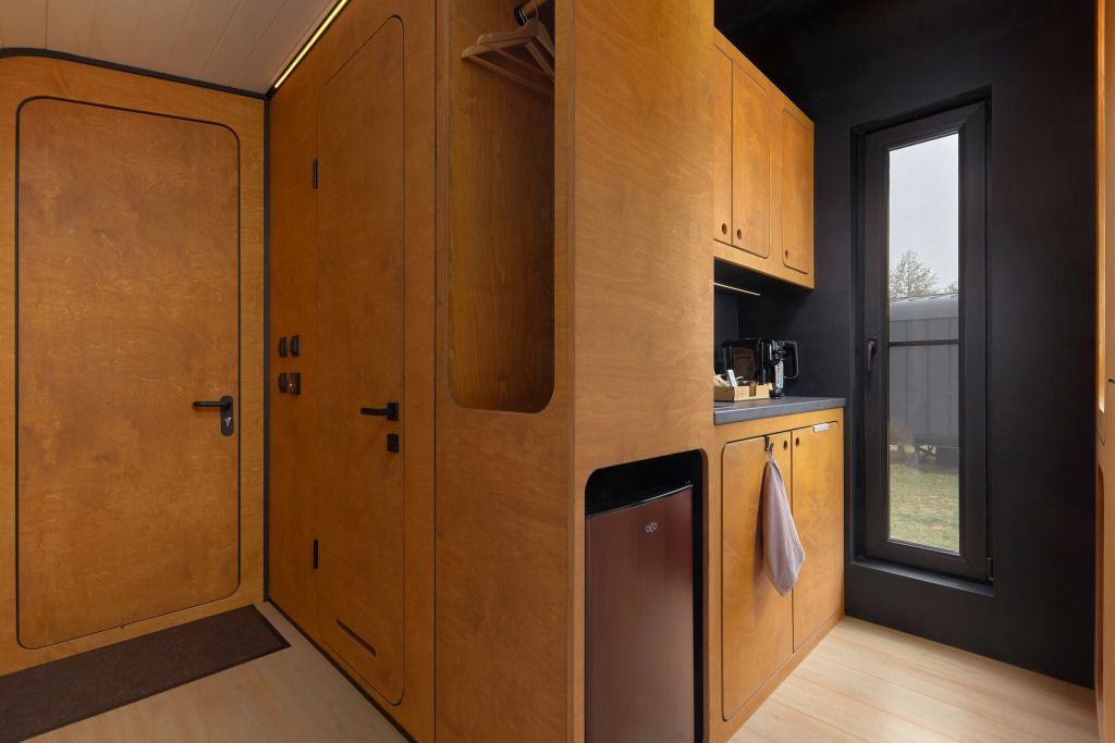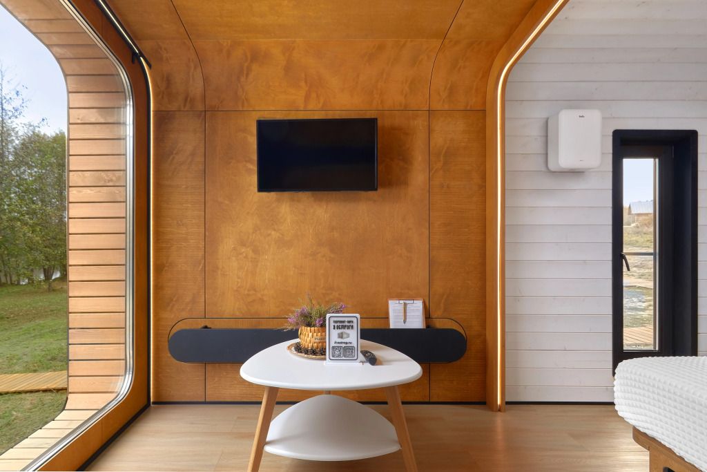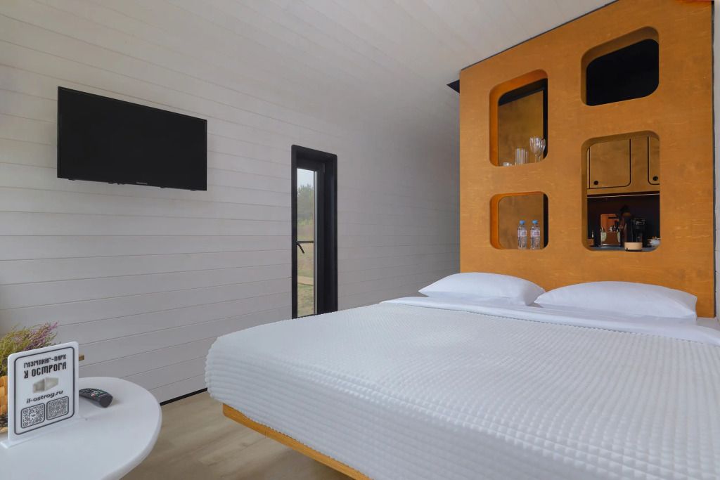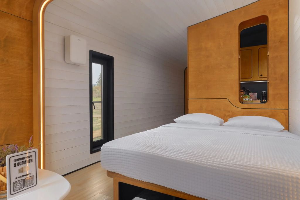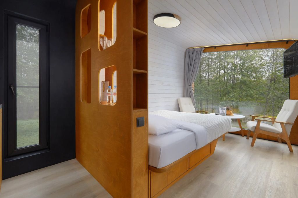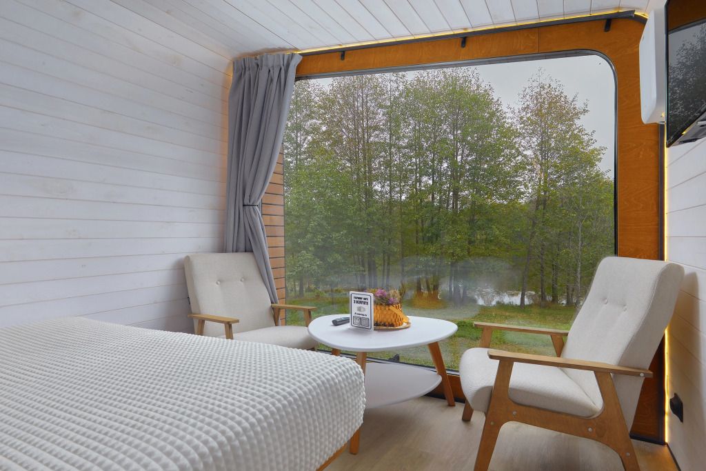 Каждый домик (юнит) оборудован всем необходимым для комфортного проживания. На кухне вы найдете электроплиту, микроволновку, чайник и кофеварку, а также набор посуды для приготовления и подачи еды. Компактный санузел включает душ, фен, халаты и набор полотенец. В спальне вас ждет просторная двуспальная кровать с постельным бельем, два уютных кресла, телевизор и доступ к Wi-Fi. Умный помощник Яндекс-Алиса сделает ваше пребывание еще более удобным.