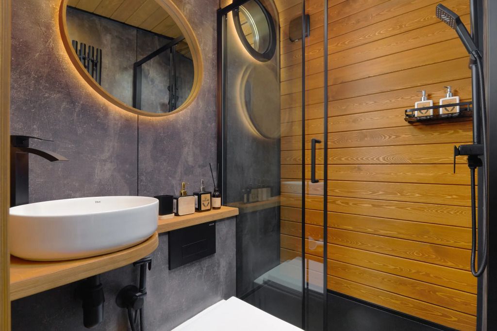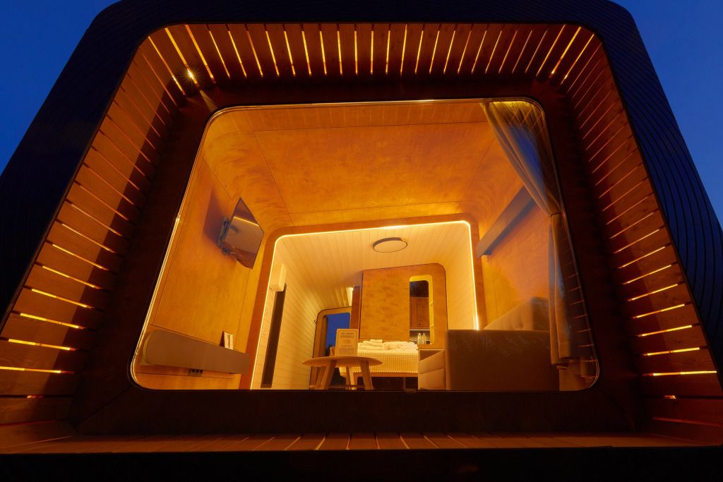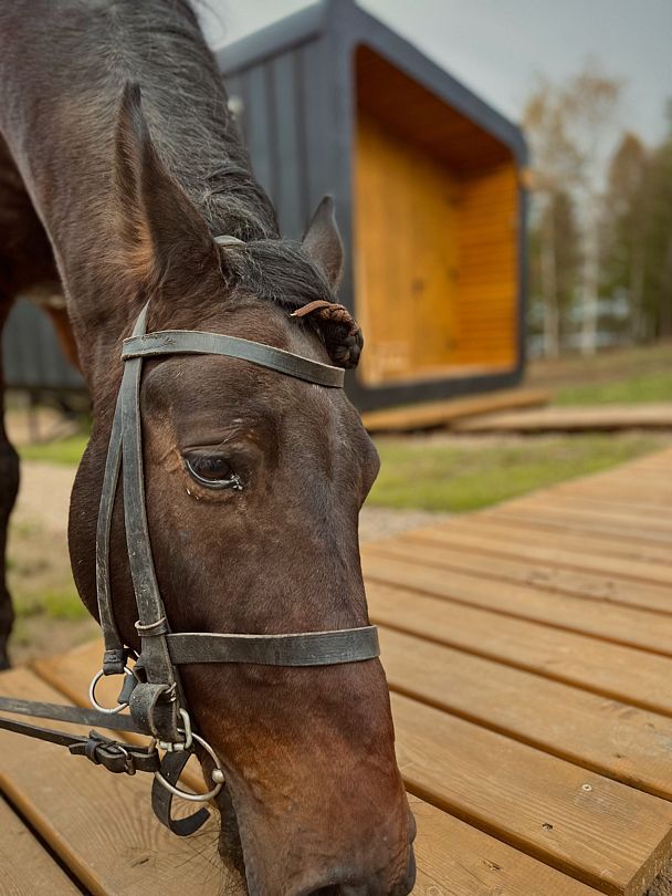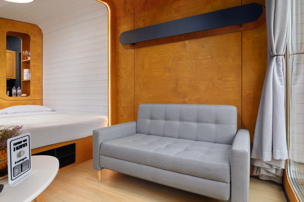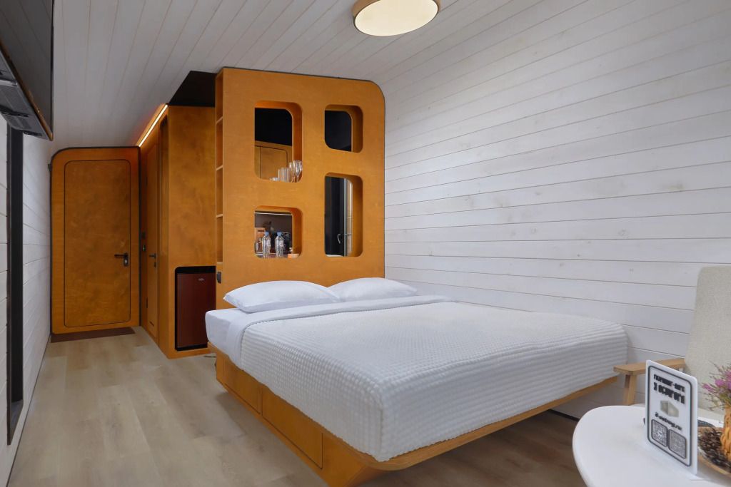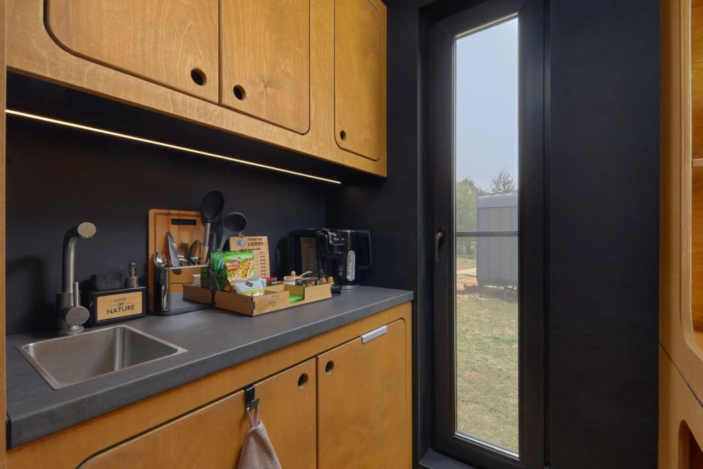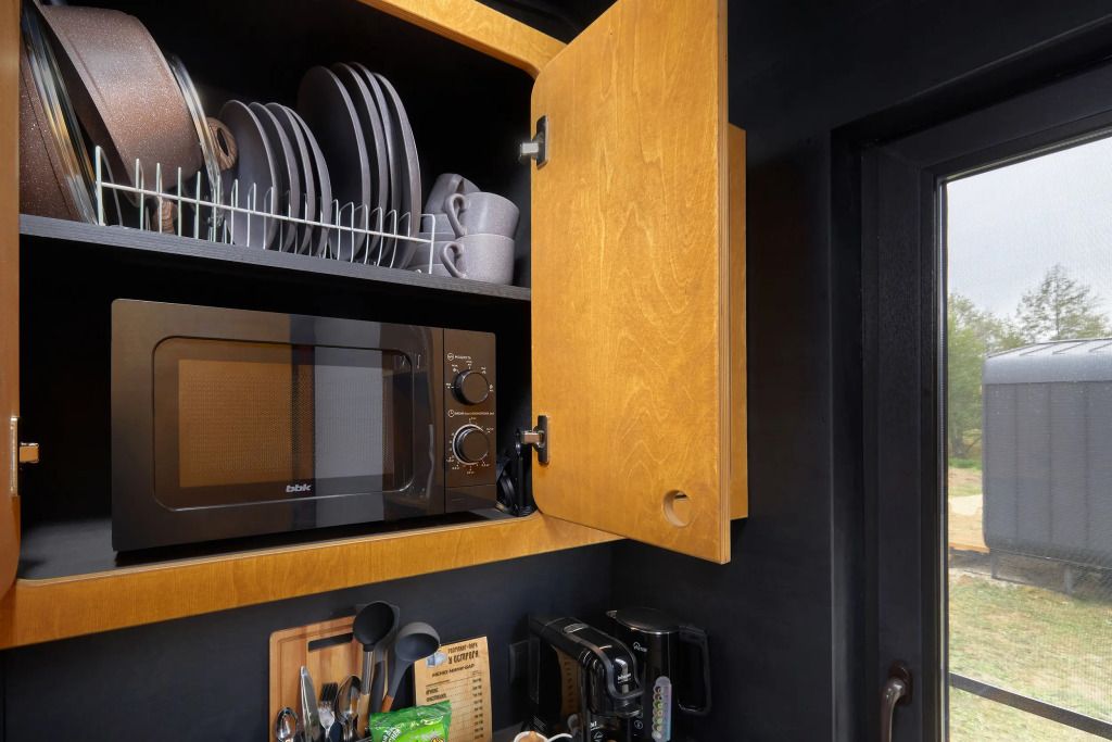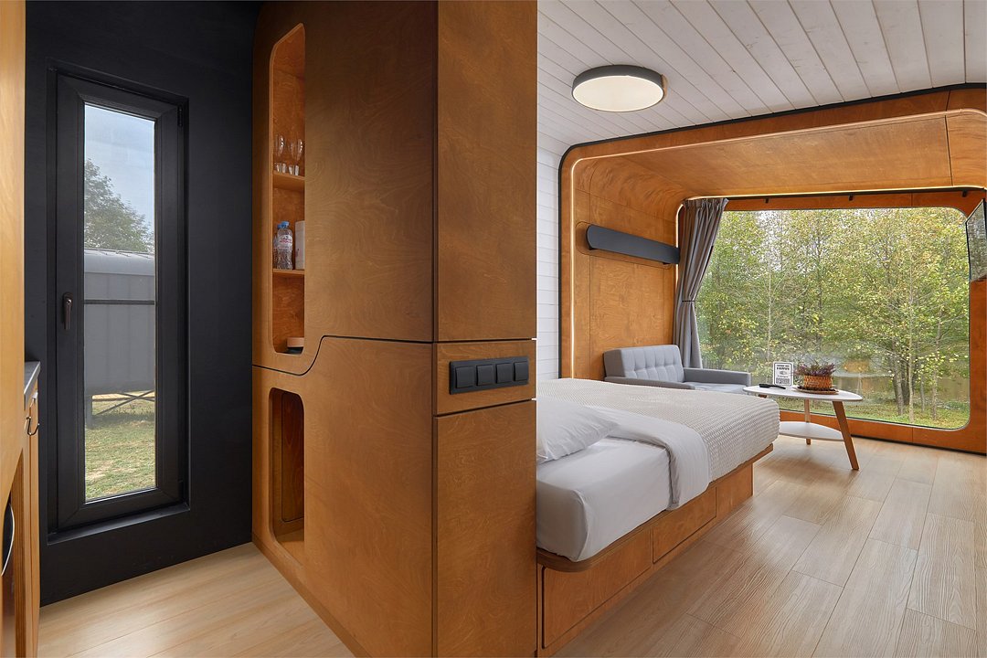 Каждый домик (юнит) оборудован всем необходимым для комфортного проживания. На кухне вы найдете электроплиту, микроволновку, чайник и кофеварку, а также набор посуды для приготовления и подачи еды. Компактный санузел включает душ, фен, халаты и набор полотенец. В спальне вас ждет просторная двуспальная кровать с постельным бельем, два уютных кресла, телевизор и доступ к Wi-Fi. Умный помощник Яндекс-Алиса сделает ваше пребывание еще более удобным.