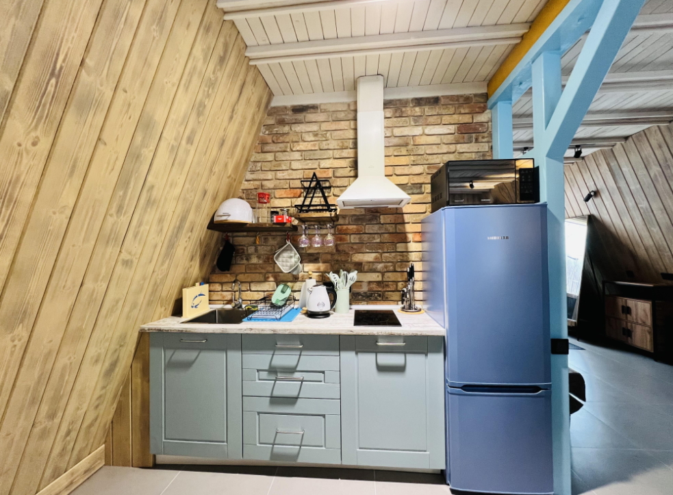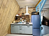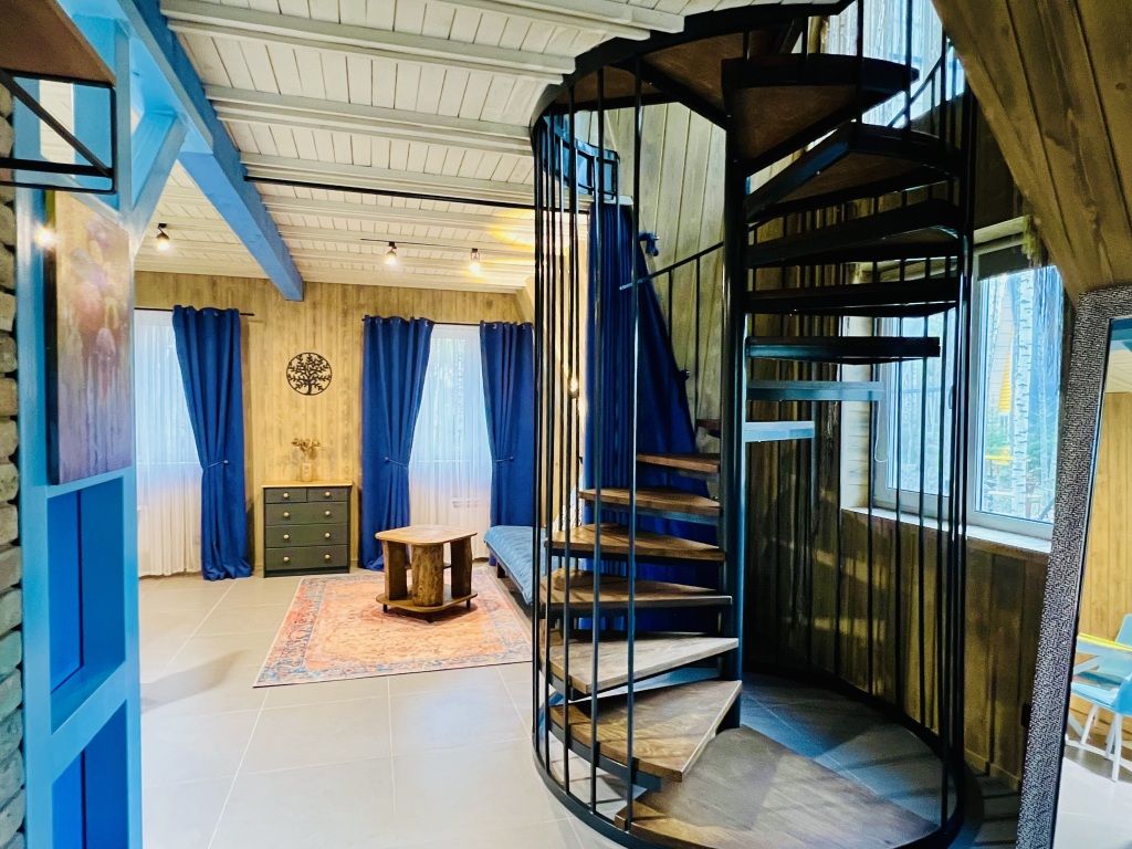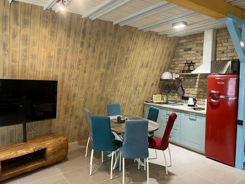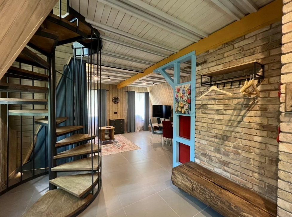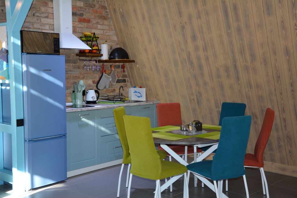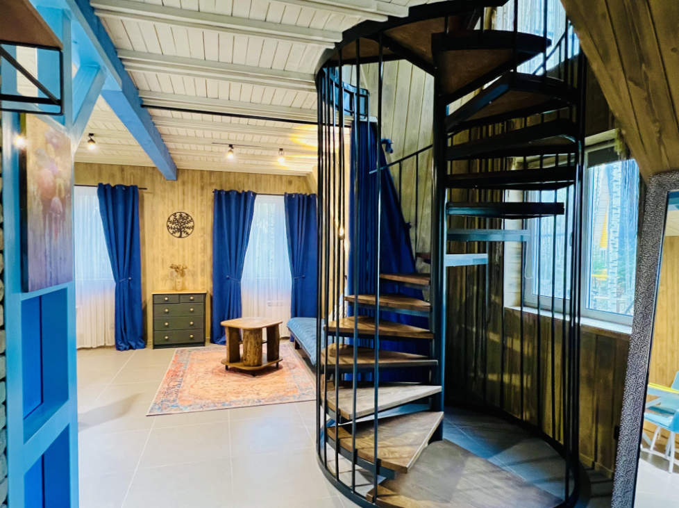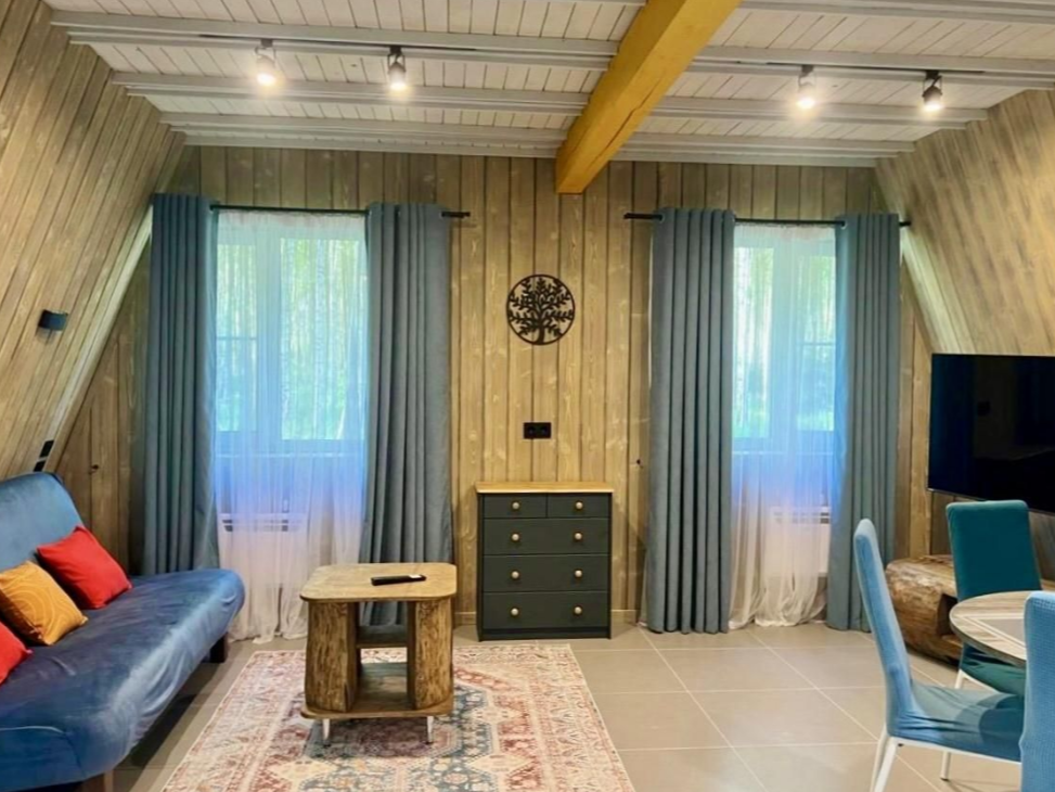 Оснащен всем необходимым для комфортного проживания 4+2 человек, с двумя санузлами, вместительной кухней-гостиной, двумя спальнями на втором этаже. В дизайне преобладают натуральные поверхности, яркие цвета. Рядом с домом обустроена беседка, мангальная зона.