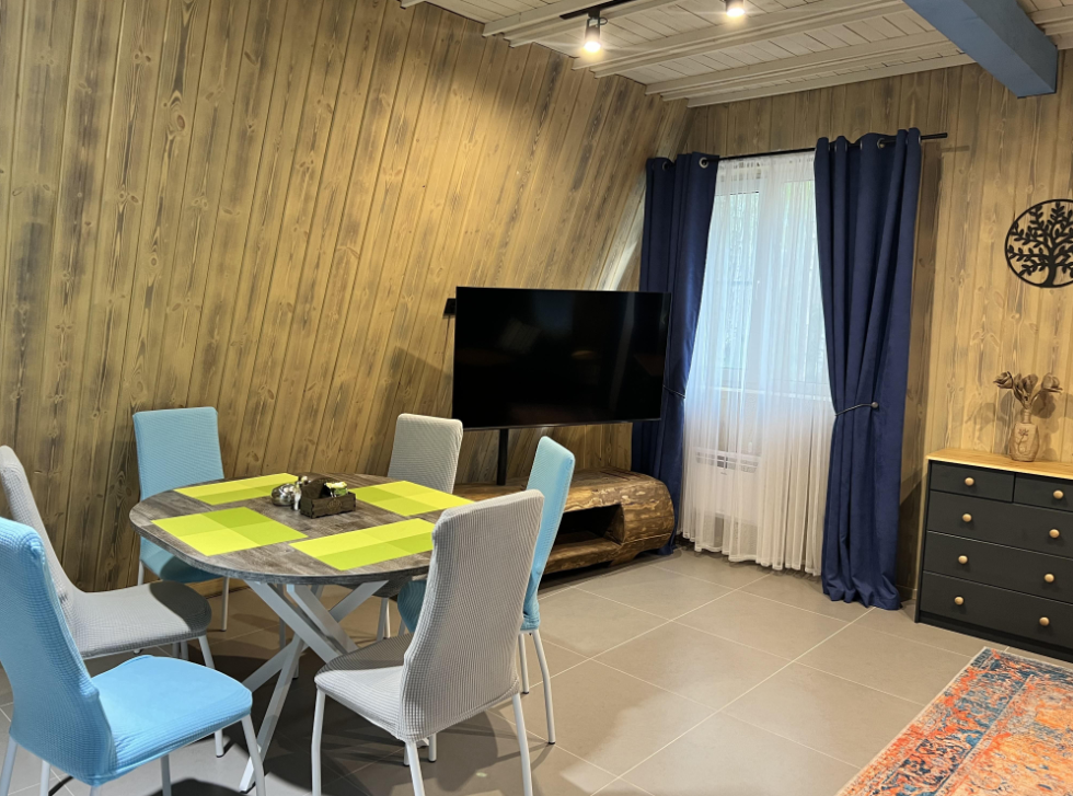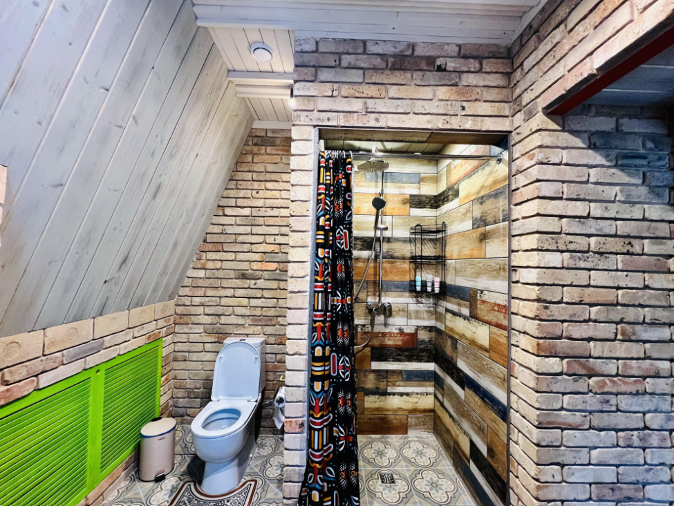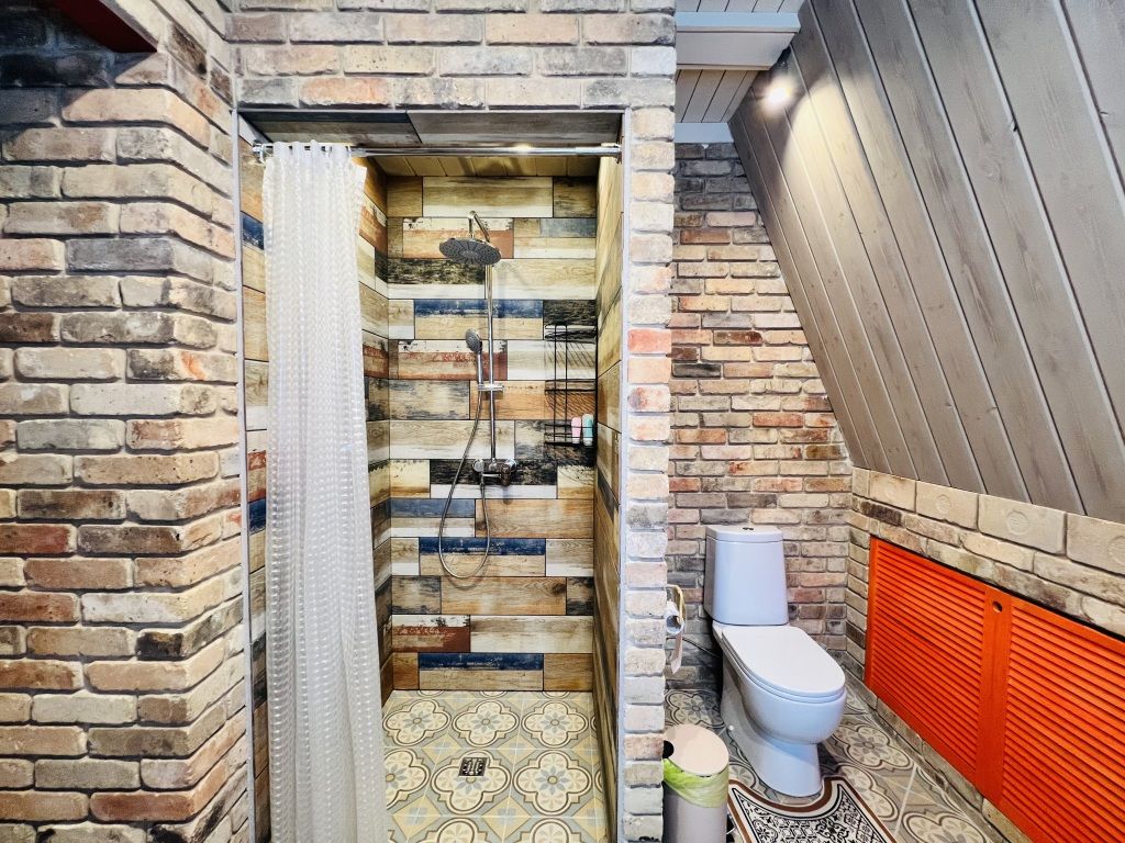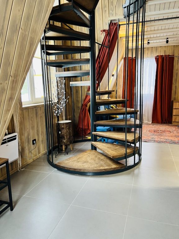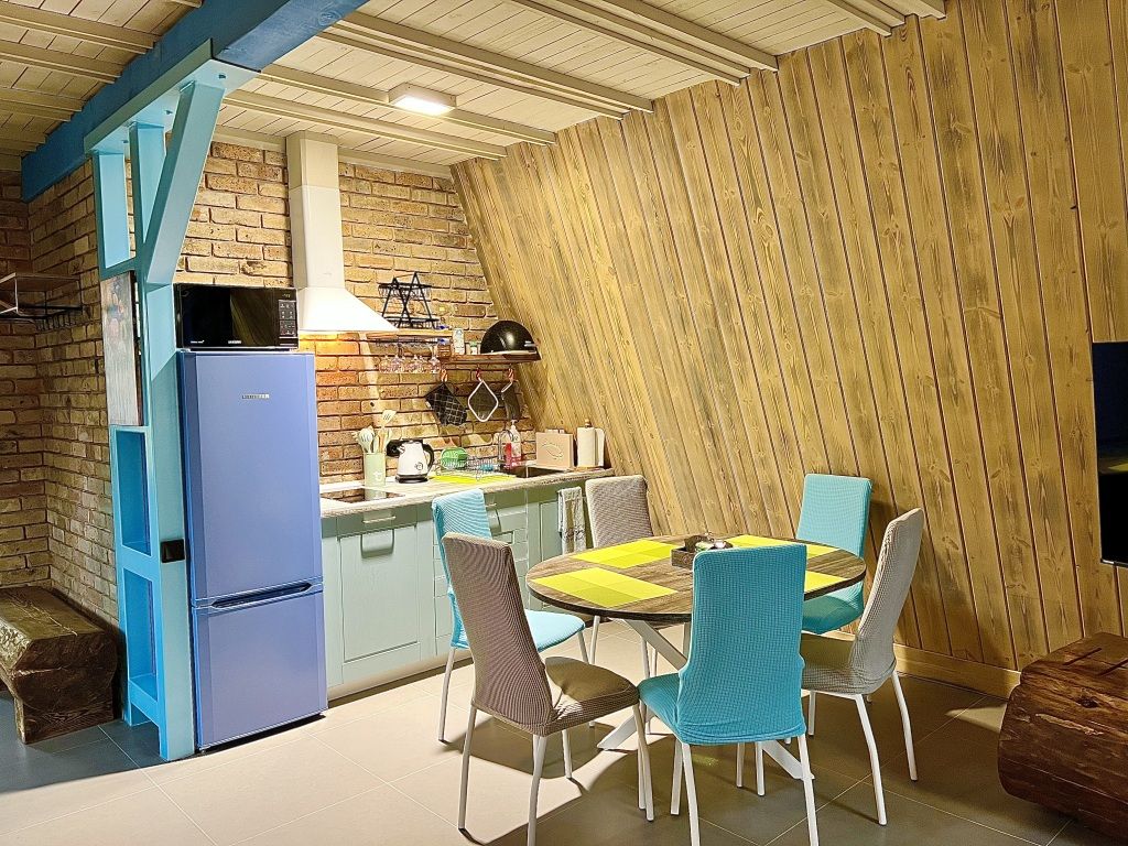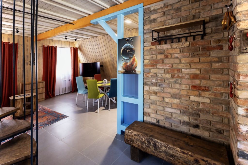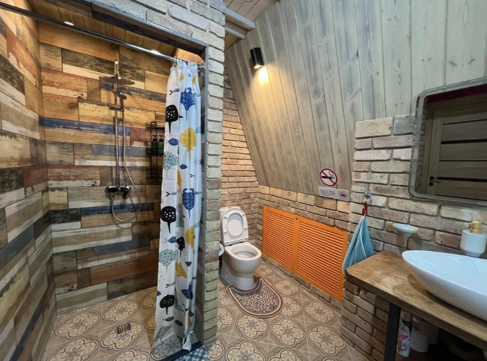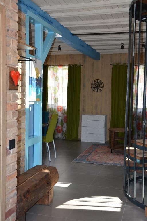 Оснащен всем необходимым для комфортного проживания 4+2 человек, с двумя санузлами, вместительной кухней-гостиной, двумя спальнями на втором этаже. В дизайне преобладают натуральные поверхности, яркие цвета. Рядом с домом обустроена беседка, мангальная зона.