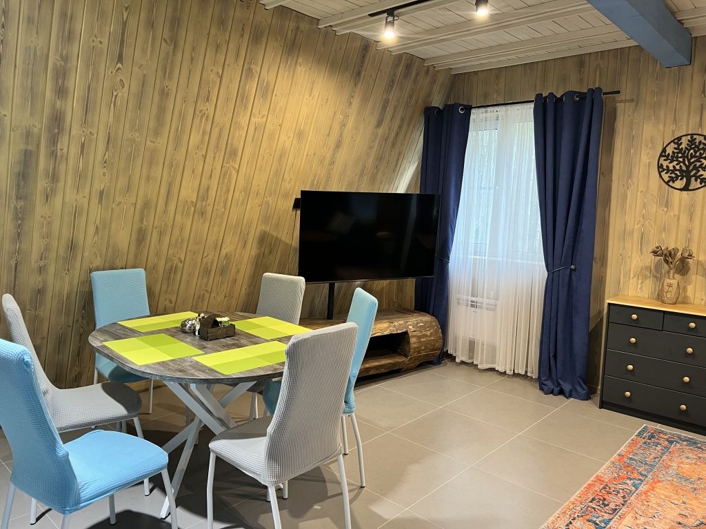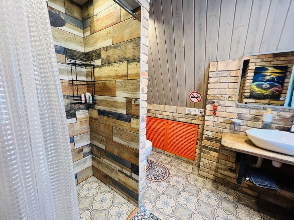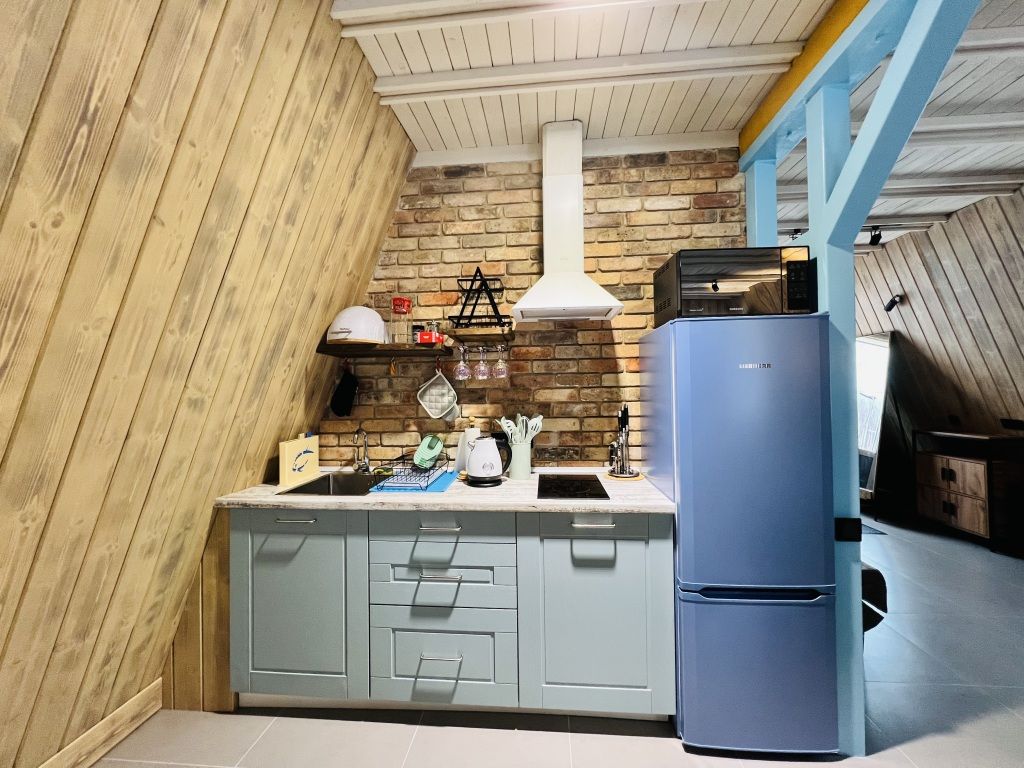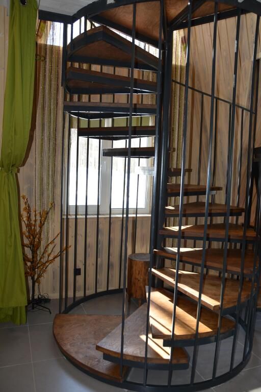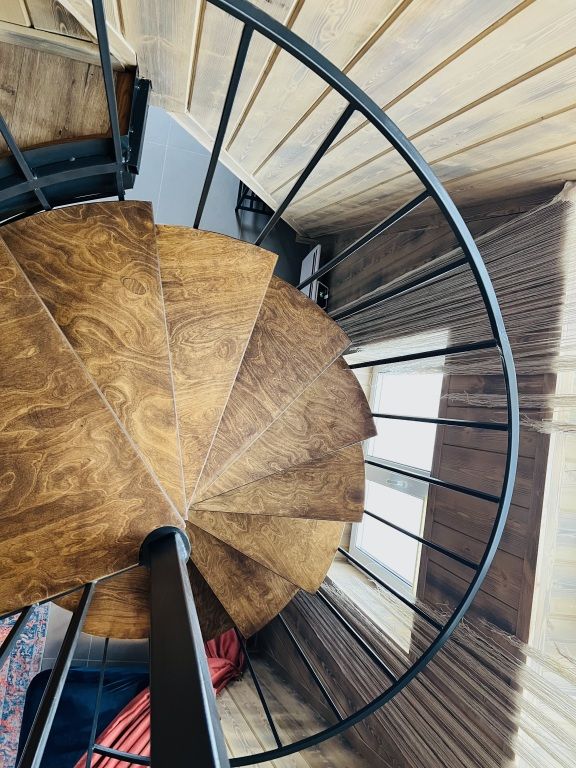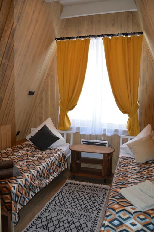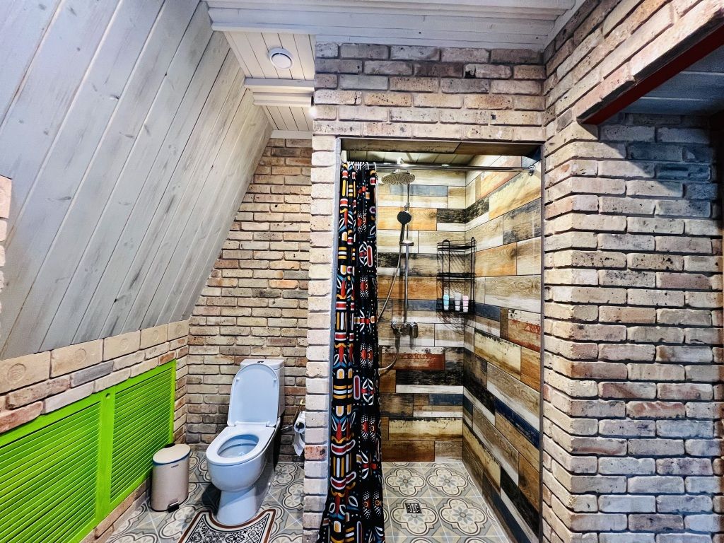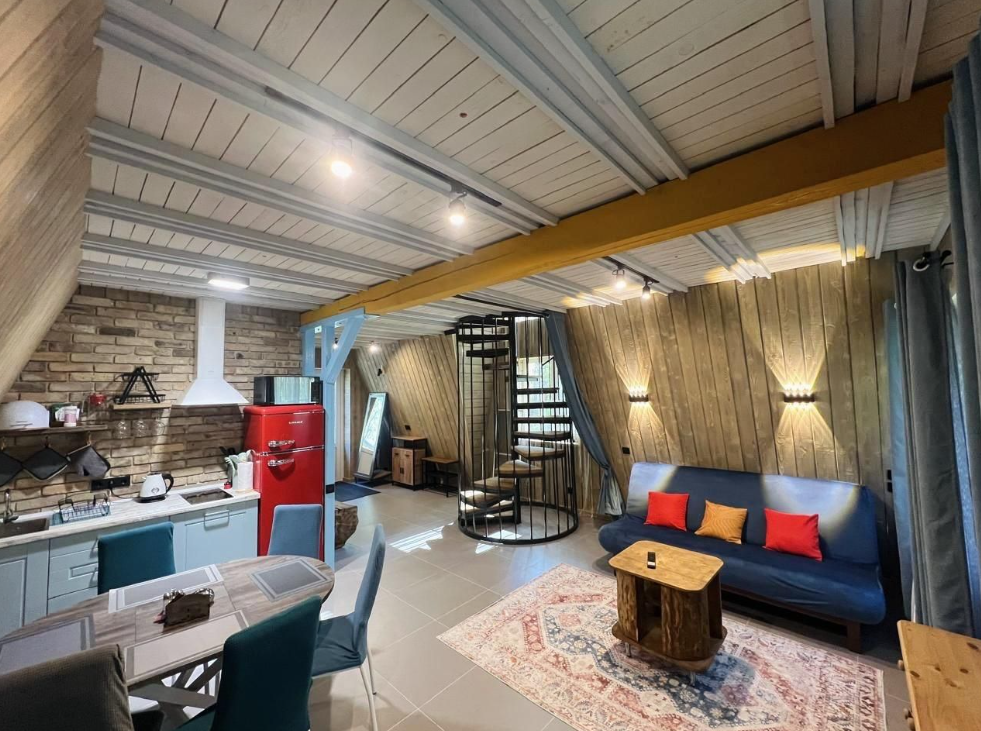 Оснащен всем необходимым для комфортного проживания 4+2 человек, с двумя санузлами, вместительной кухней-гостиной, двумя спальнями на втором этаже. В дизайне преобладают натуральные поверхности, яркие цвета. Рядом с домом обустроена беседка, мангальная зона.