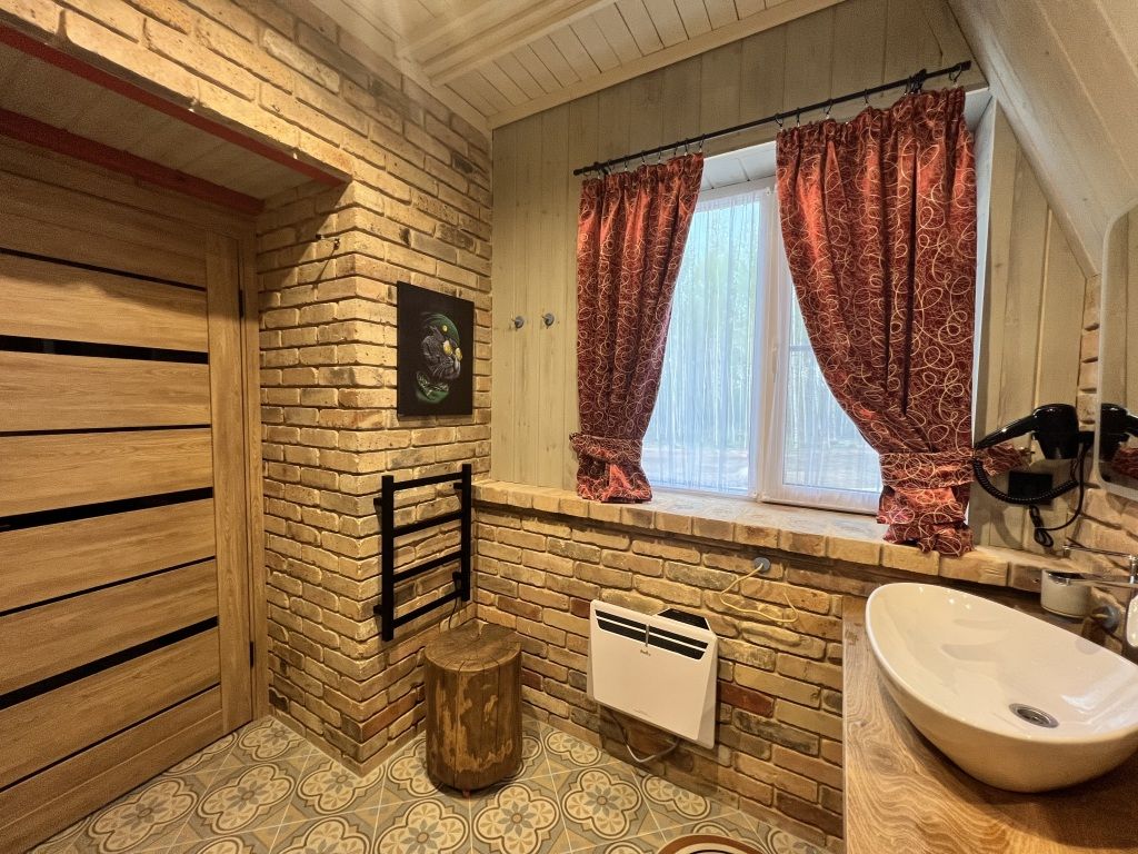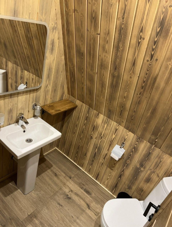 Оснащен всем необходимым для комфортного проживания 4-6 человек. Для удобства гостей в доме имеется ванная комната на первом этаже, дополнительный санузел на втором этаже. Водяной теплый пол.