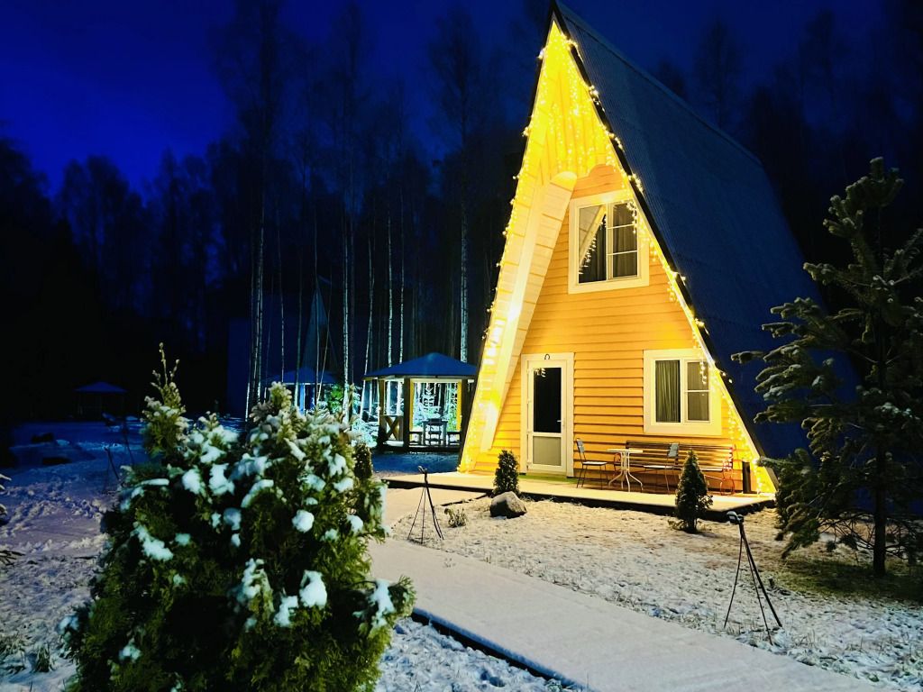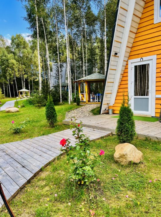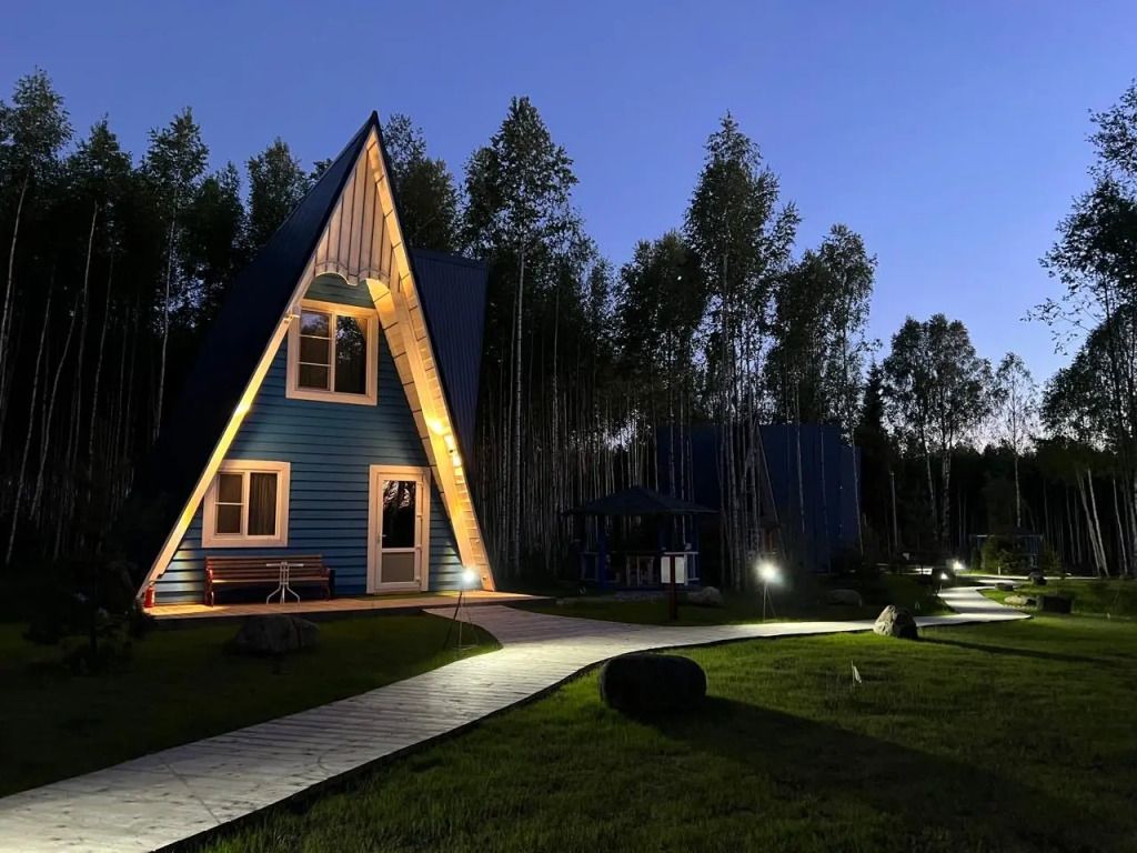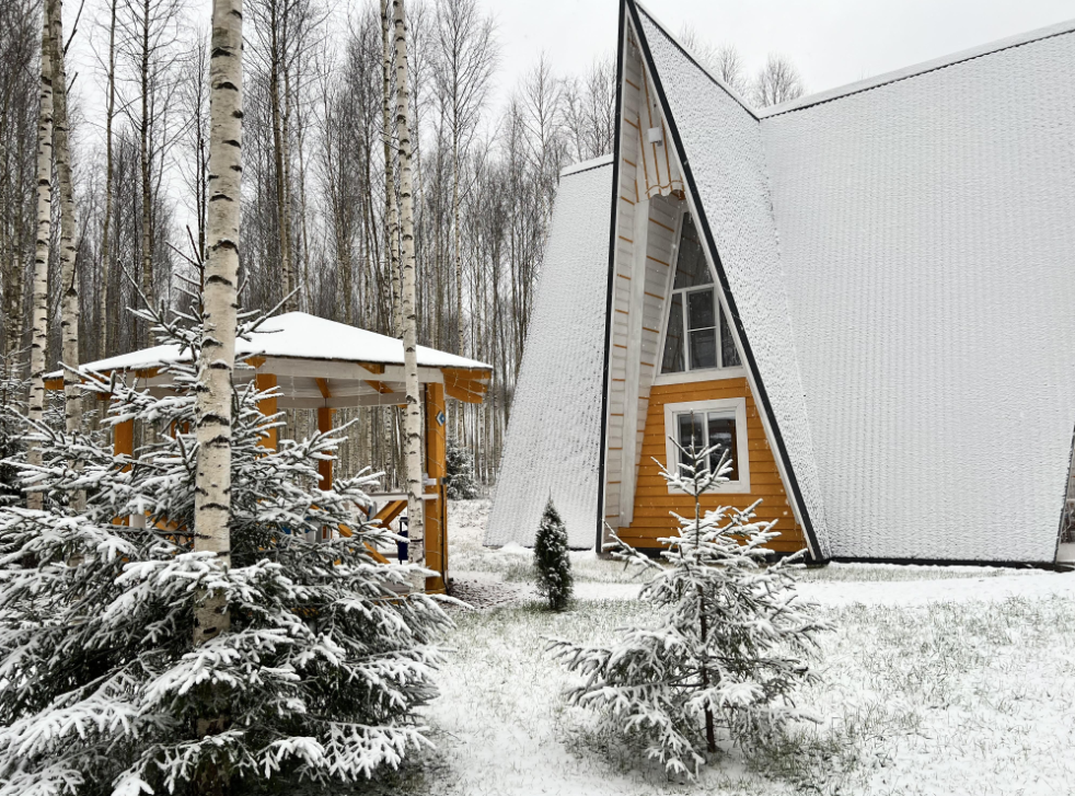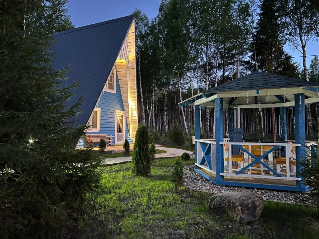 Комфортабельный дом А-Frame с мансардой, террасой, индивидуальной беседкой, расположен в лесном массиве.