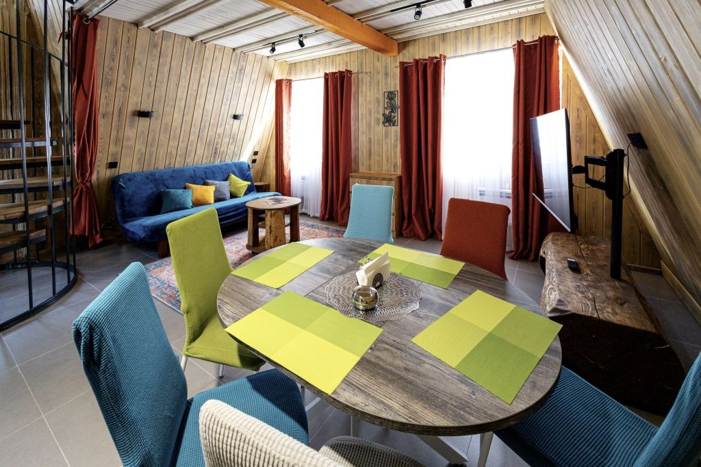 Интерьер домов выполнен в эклектичном стиле со скандинавскими нотками, в дизайне преобладают натуральные поверхности, яркие цвета, которые в своем необычном сочетании делают пространство домика гармоничным, уютным, комфортным.